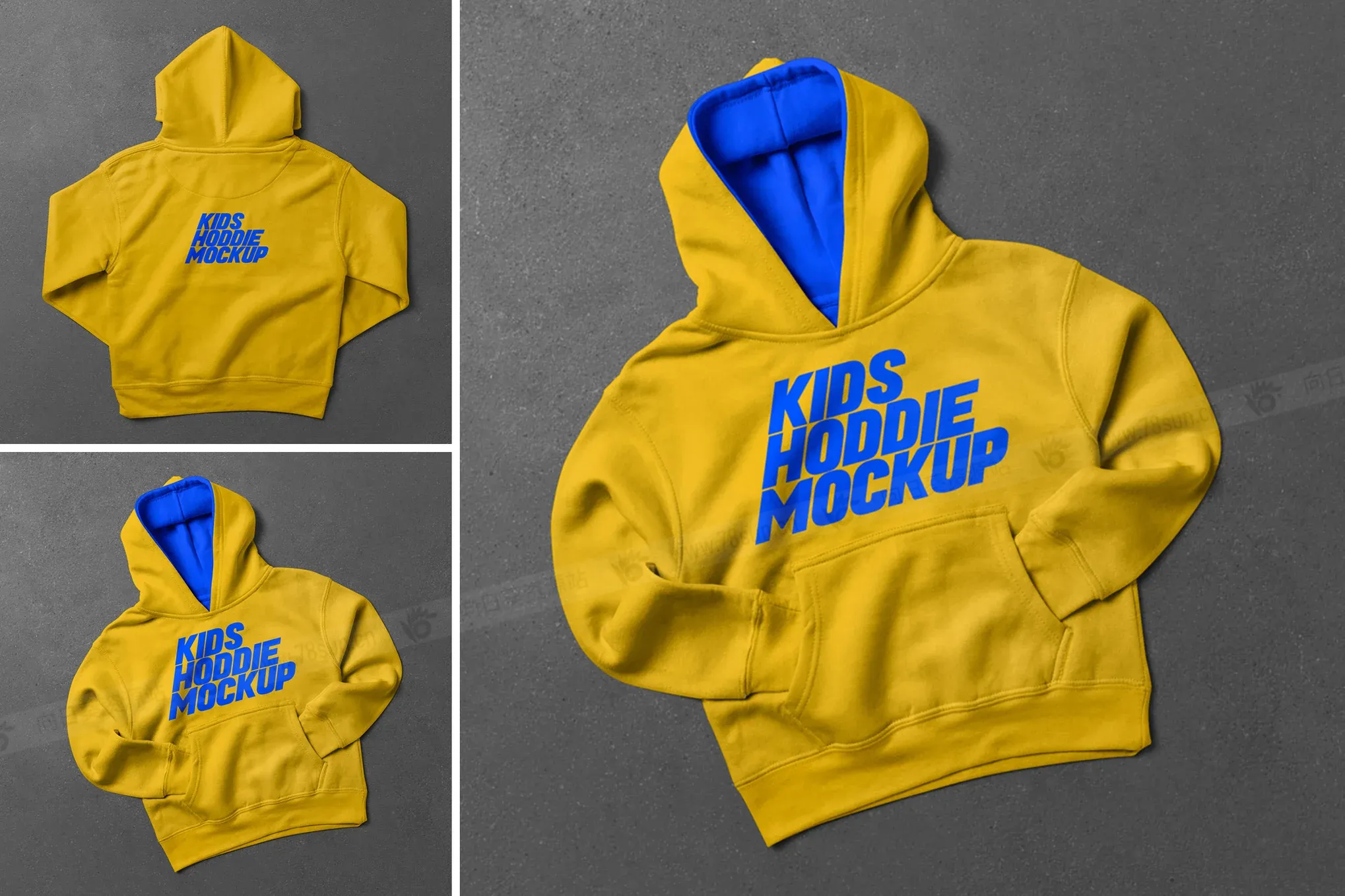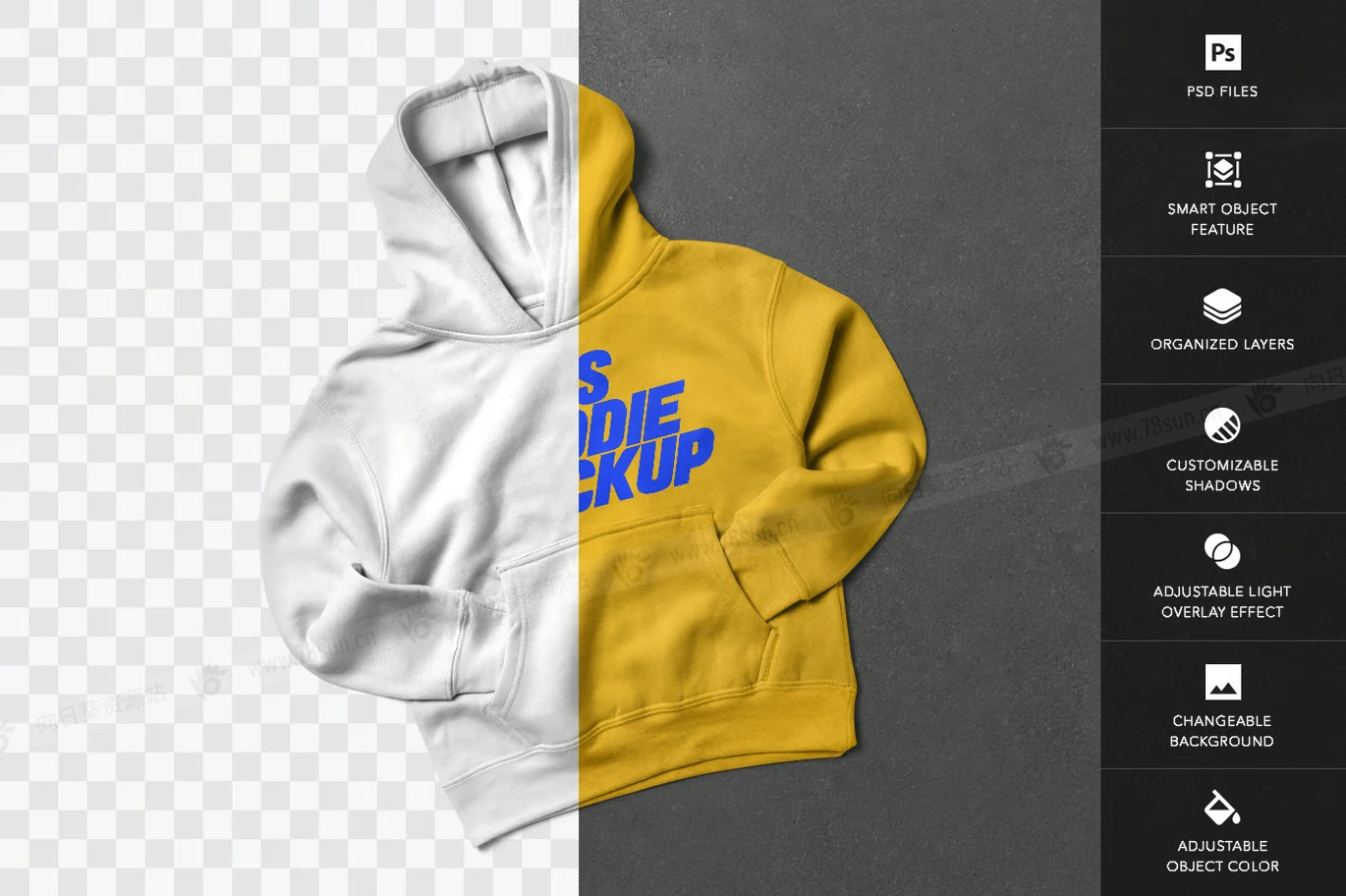 儿童连帽衫卫衣服装品牌VI效果图展示智能贴图psd设计样机在微妙的背景下以醒目的明亮连帽衫为特色,非常适合突出大胆的颜色和有趣的设计。
