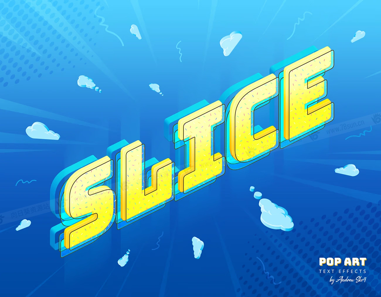 3D立体切片波普艺术文字效果psd设计模板。文本、徽标、形状、像素图层的切片波普艺术效果。适用于任何类型的图层 – 矢量或栅格!只需几秒钟即可为您的刻字获得酷炫的风格您只需将文本放入智能对象中即可。