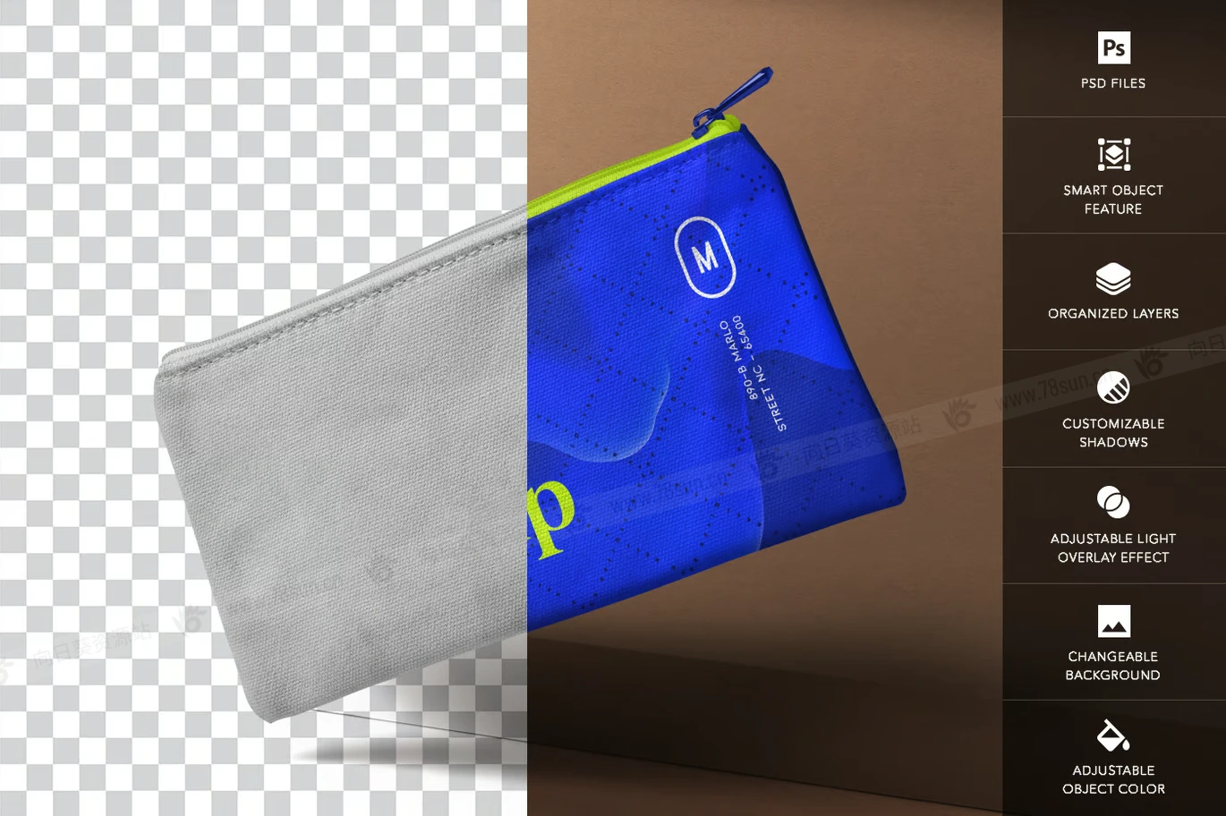 化妆品便携旅行拉链袋笔袋品牌VI效果图展示智能贴图psd设计样机,提供了对织物拉链袋的逼真描绘,确保每一种纹理和颜色都得到精彩的表现,