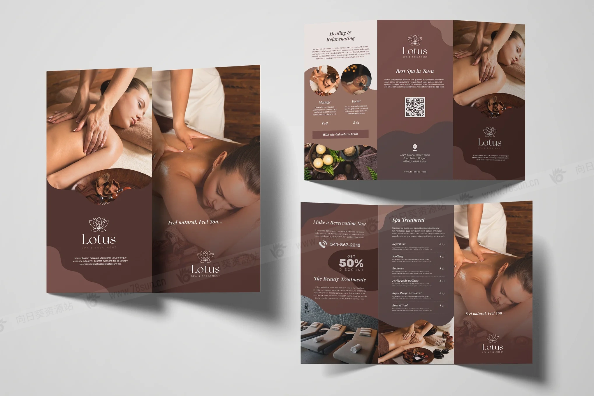A4水疗SPA美容护肤三折页宣传小册子indd eps设计模板,优雅、现代和专业的企业业务宣传册模板。这本小册子适用于水疗和任何类型的企业,也适用于企业。它是完全可编辑的、可定制的且易于使用。