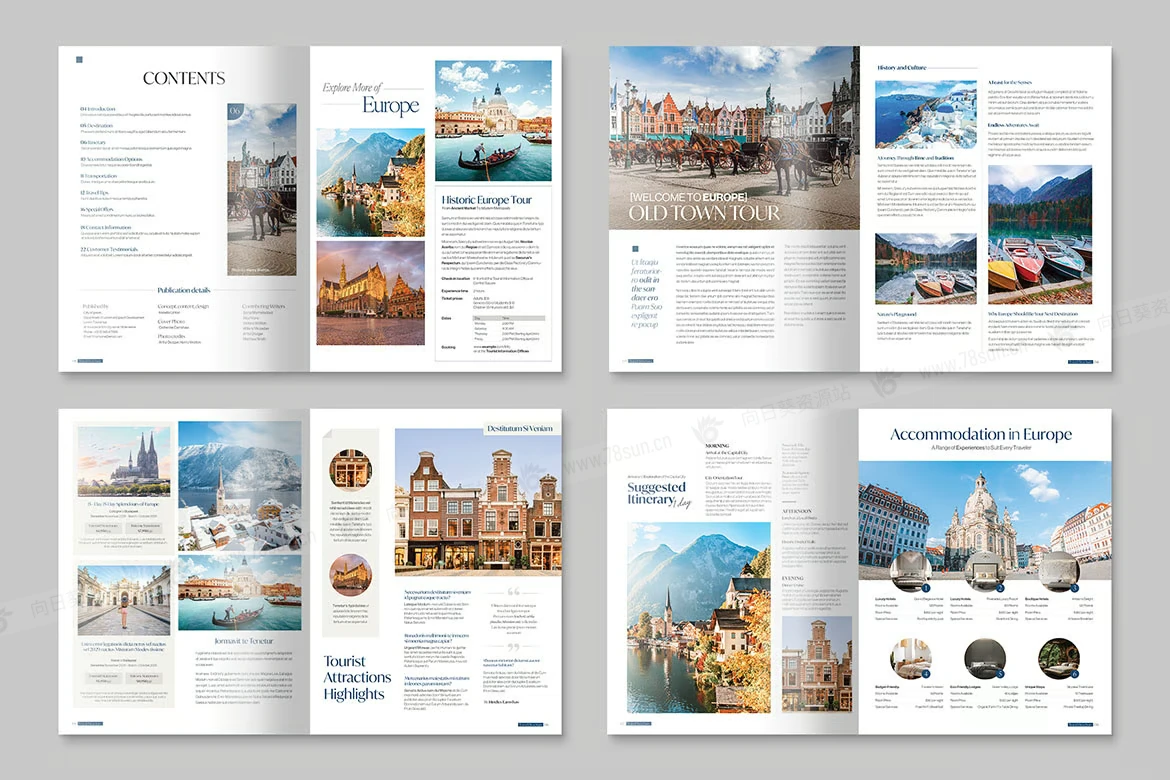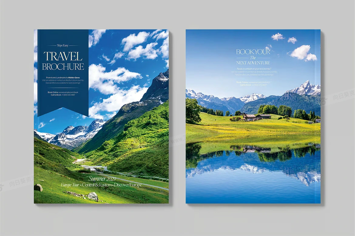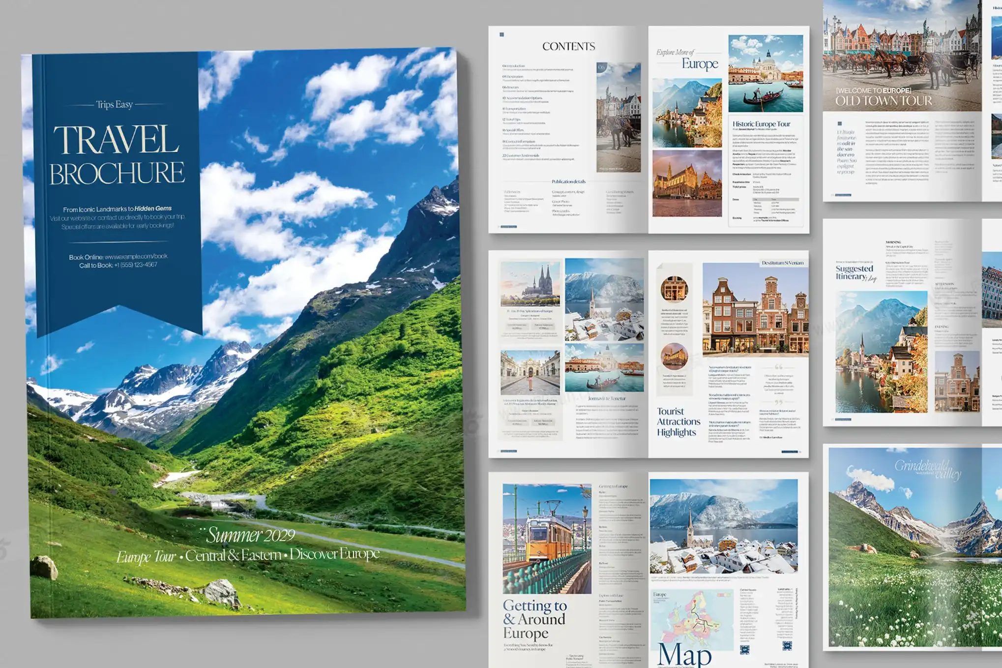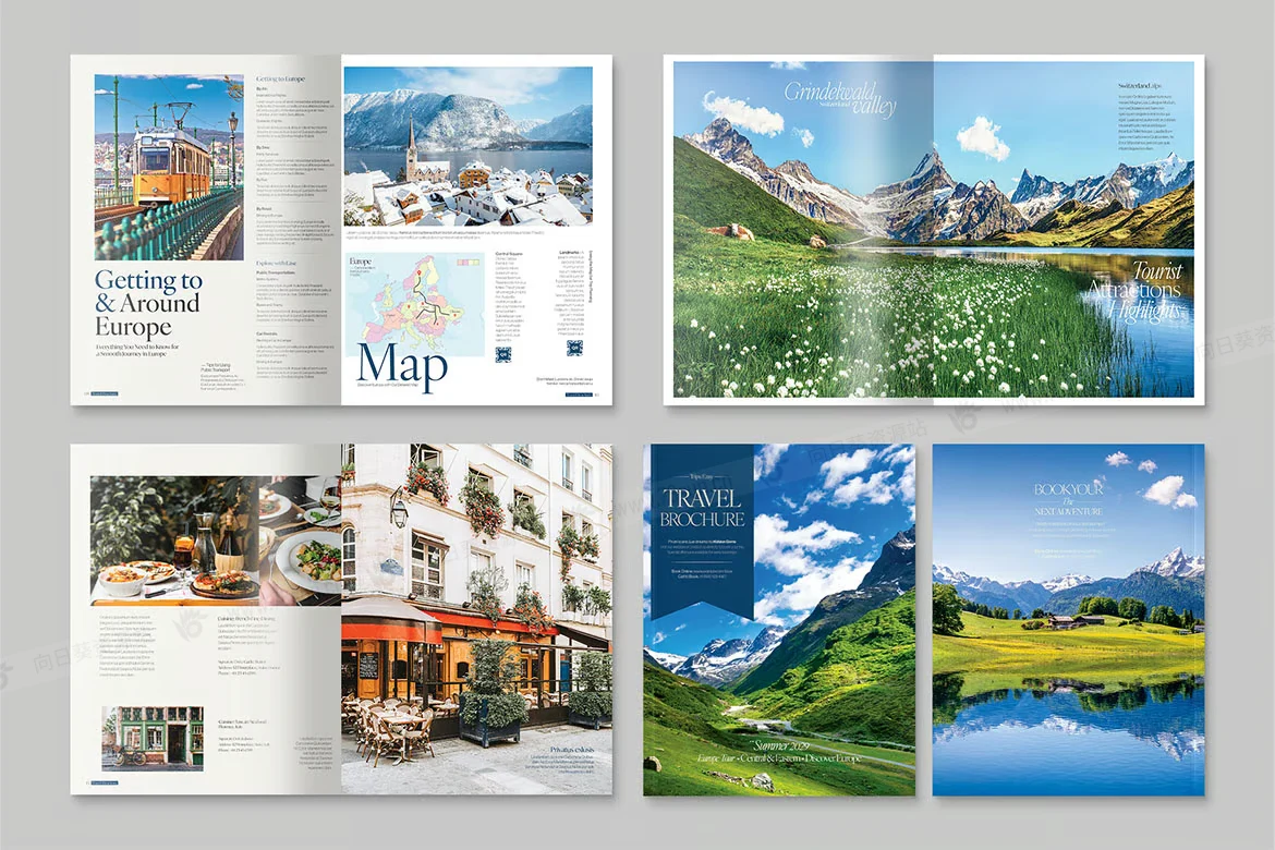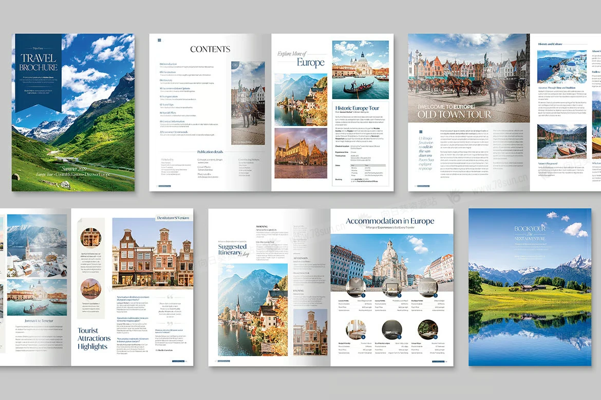 旅行旅游摄影作品集宣传手册杂志画册ai设计模板,这种优雅的布局以 Illustrator Ai 和 Vector EPS 格式提供,这本专业设计的小册子非常适合宣传旅游目的地、导游和度假套餐,可确保精美的演示。易于定制和更新,