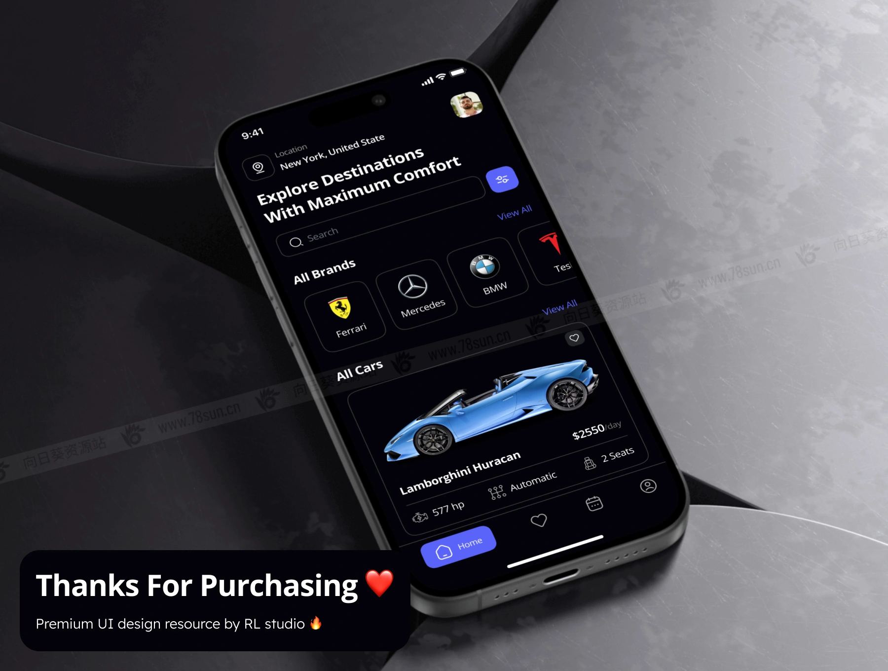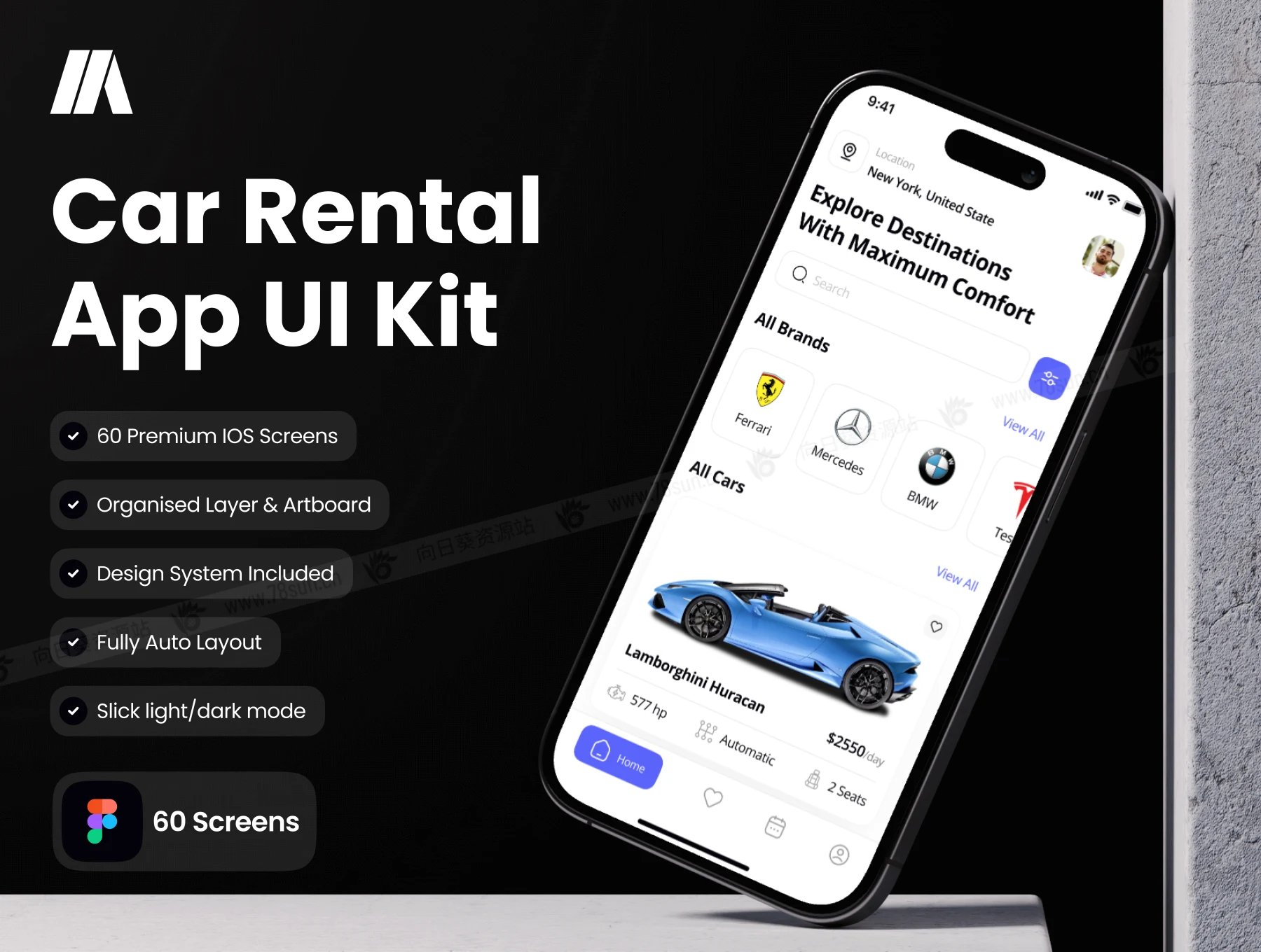 暗亮色汽车租赁租车app ui界面设计fig源文件模板,这是一个专为现代汽车租赁服务打造的综合设计解决方案。包括浅色和深色模式,无论照明条件如何,都能确保最佳用户体验。