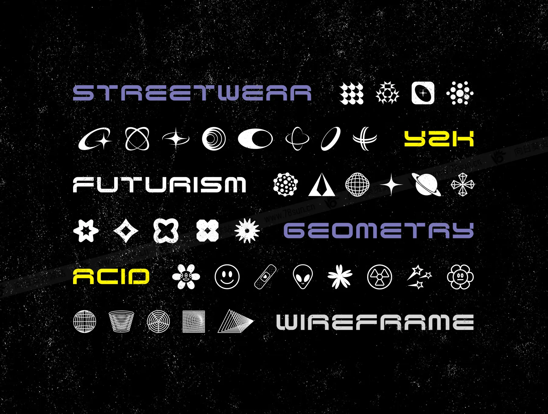 潮流Y2K抽象几何形状图形图案印刷产品包装psd ai设计元素, 324 个元素的非凡合奏,以一系列多种格式提供——PSD、AI、PNG、SVG 和 EPS,能够增强任何数字画布,无论是网站设计、社交媒体内容、广告材料、商品设计,甚至是个人艺术项目。