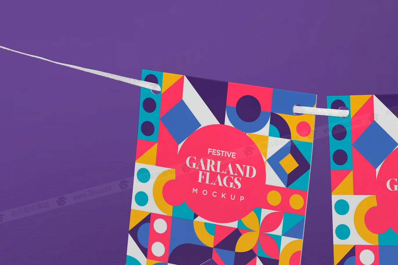节日活动庆祝彩旗VI效果图展示智能贴图psd设计样机,具有高分辨率和逼真的表现力,利用这个三角旗横幅模型来展示您的创意能力,