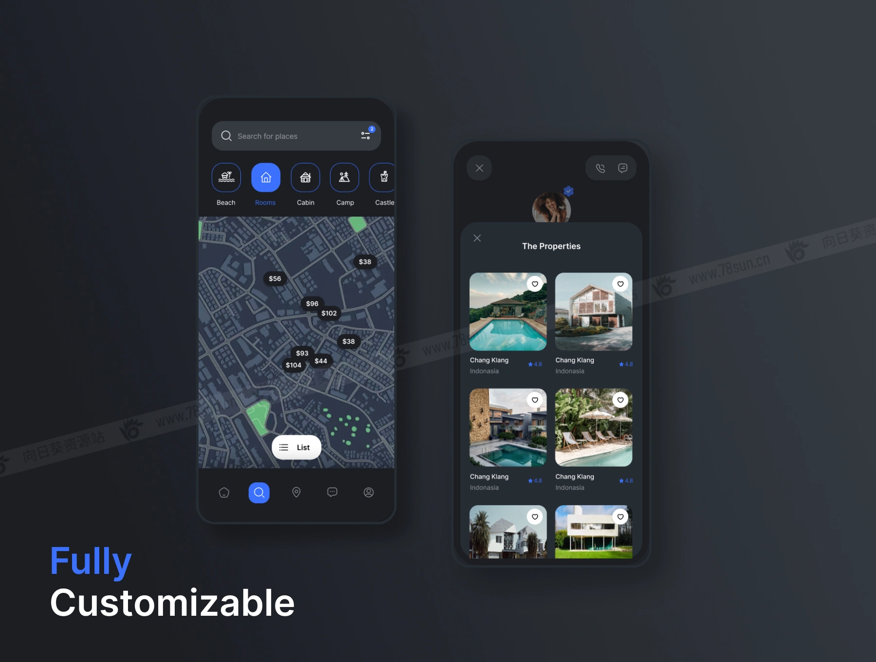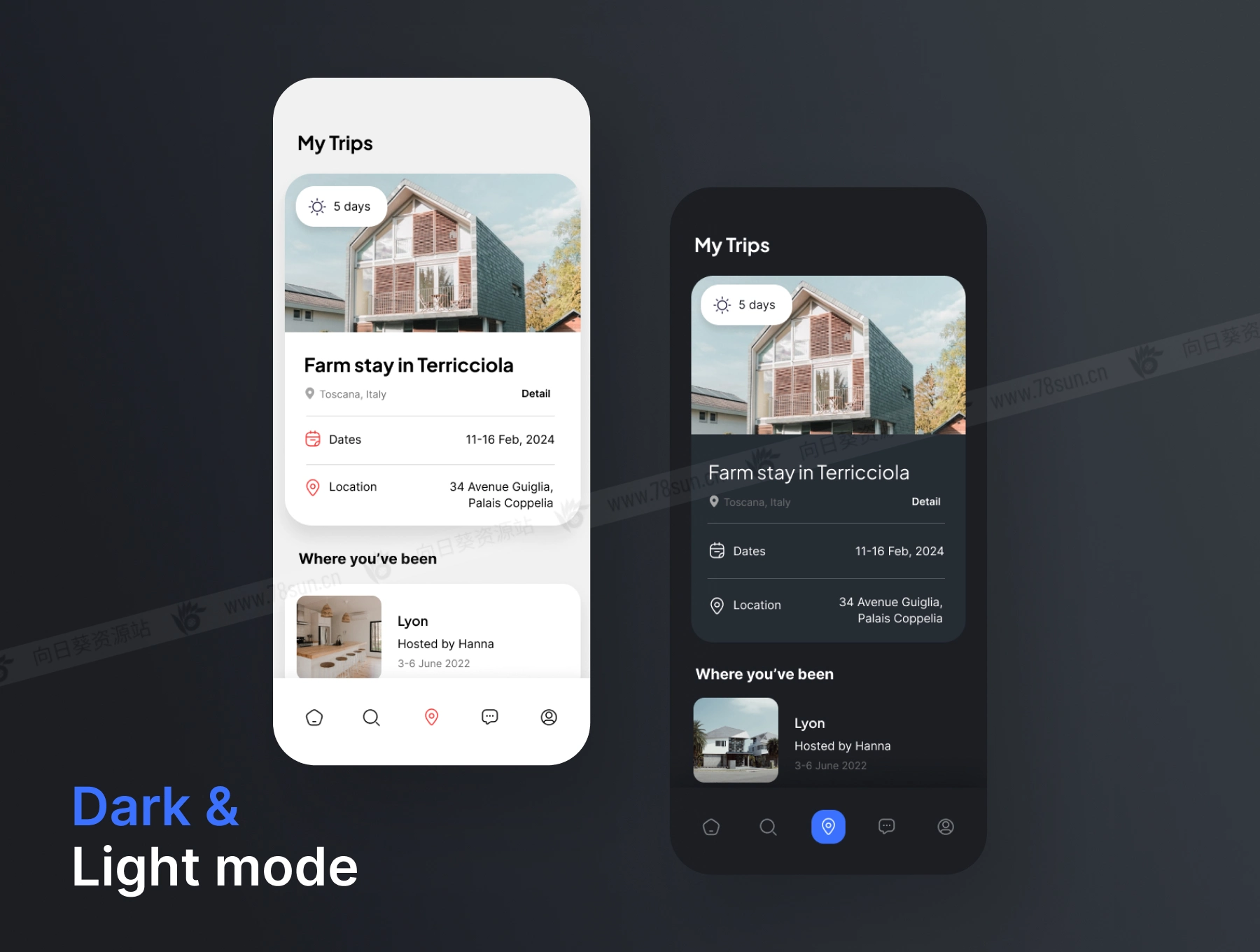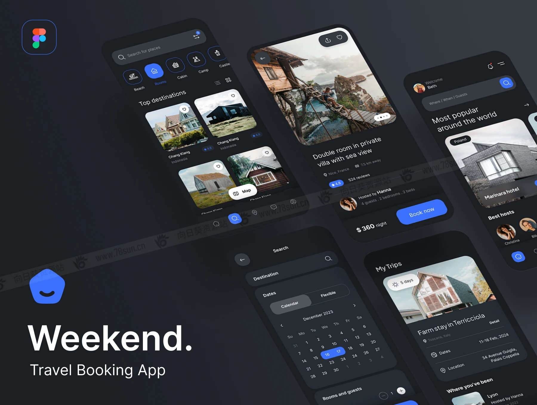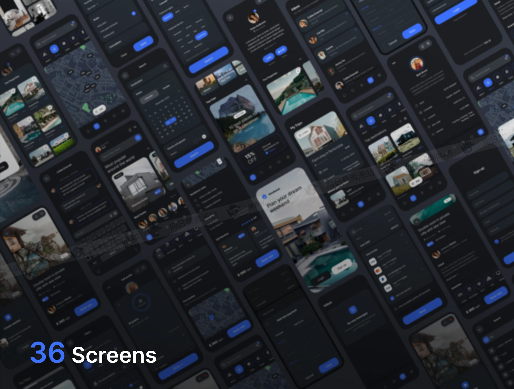 旅行酒店预订详情信息app ui界面设计fig源文件模板,可通过 36 个 UI 屏幕提供各种旅行服务。对于旅行者来说,它是一个探索和预订住宿的无缝平台。