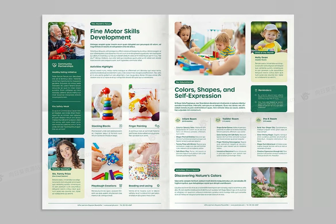 学校新闻报纸公告宣传手册杂志画册indd设计模板,以 InDesign INDD 和 IDML 格式提供,非常适合托儿所、学前班、幼儿园和其他教育机构。ba轻松创建具有专业风格的迷人公告、杂志或报纸。非常适合与家长和社区分享活动、更新和教育内容。无论是每月时事通讯还是特别公告,这个多功能且易于使用的模板都可以简化沟通并提高参与度。