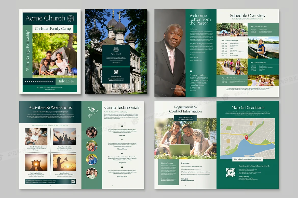 学校教育文化名胜古迹宣传手册杂志画册indd设计模板。该模板非常适合教堂营地、研讨会和会议,有 INDD 和 IDML 格式,