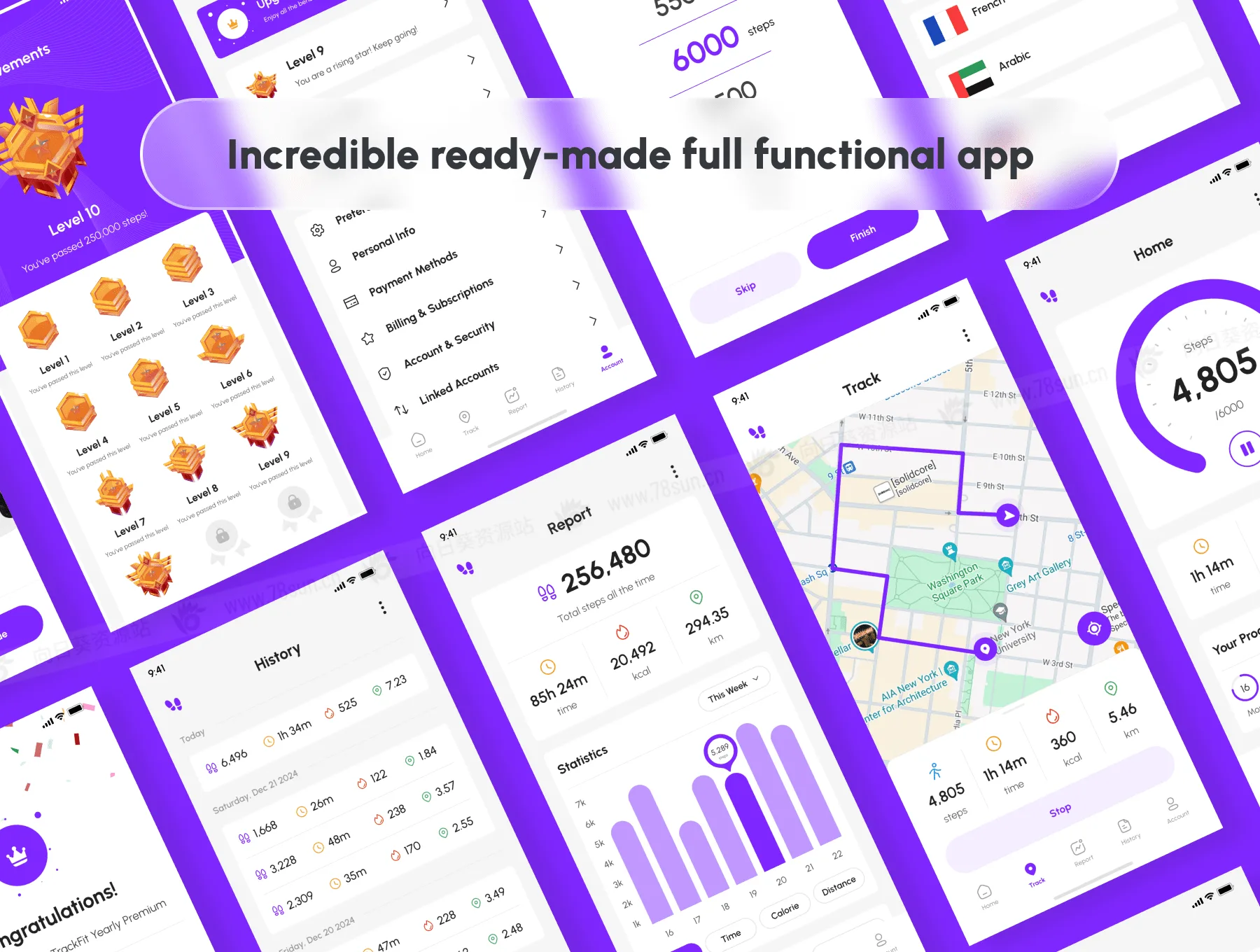 运动健身追踪步行计数器app ui界面设计fig源文件模板,具有功能齐全的计步器和跟踪器移动应用程序。抛弃无聊的计步器,提升你的体能水平!实时地图跟踪、详细报告、水和重量跟踪器,以及具有成就水平的令人上瘾的游戏化功能。您可以使用设计组件轻松编辑和自定义所有元素,这可以加快项目的设计过程。适用于 iOS 和 Android,包括 135+ 100% 可编辑和可定制的屏幕。模板定义了两个主题,即现代主题和新粗野主义主题。这两个主题均提供浅色和深色模式。转到“更改变量模式”,您只需单击一下即可自动从一个主题切换到另一个主题。如果您不熟悉 figma 变量,请不要担心;您始终可以分离变量并手动编辑设计。