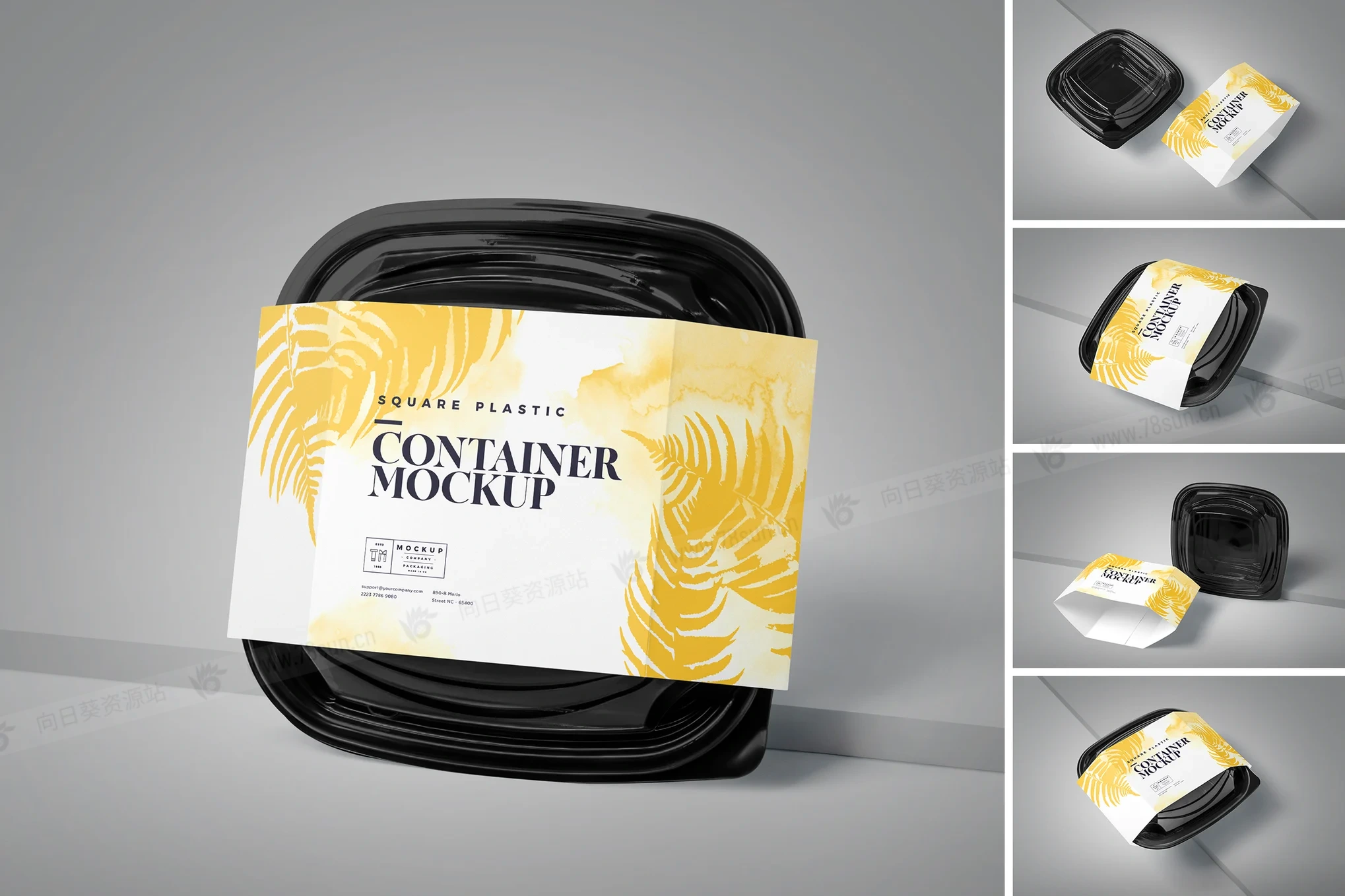 外卖打包盒食品托盘塑料盒品牌VI效果图展示智能贴图psd设计样机,