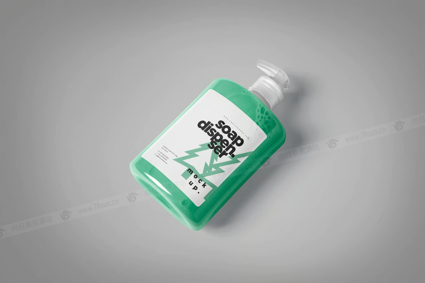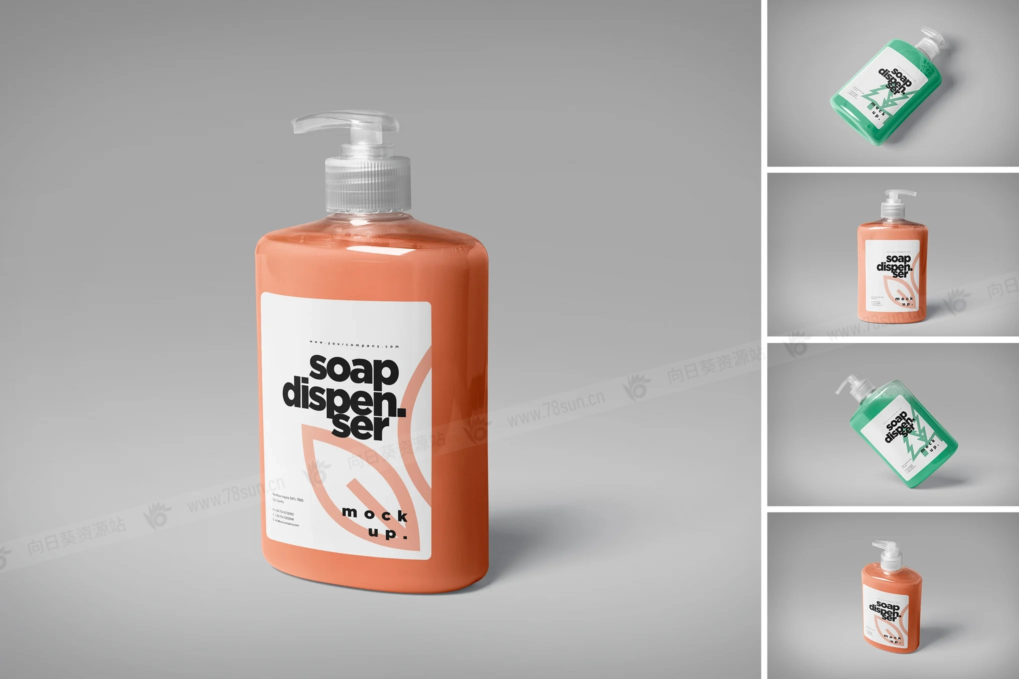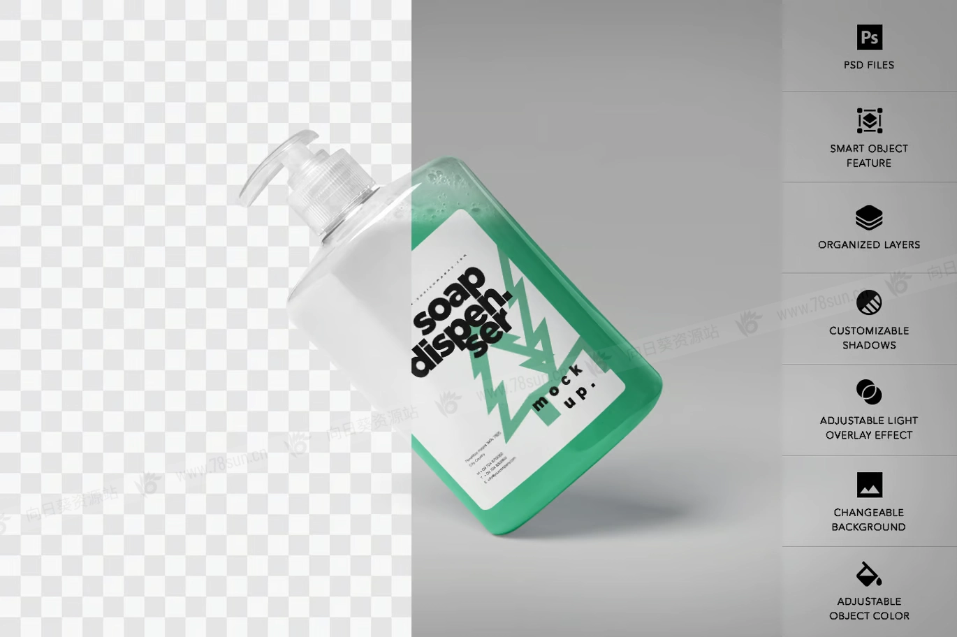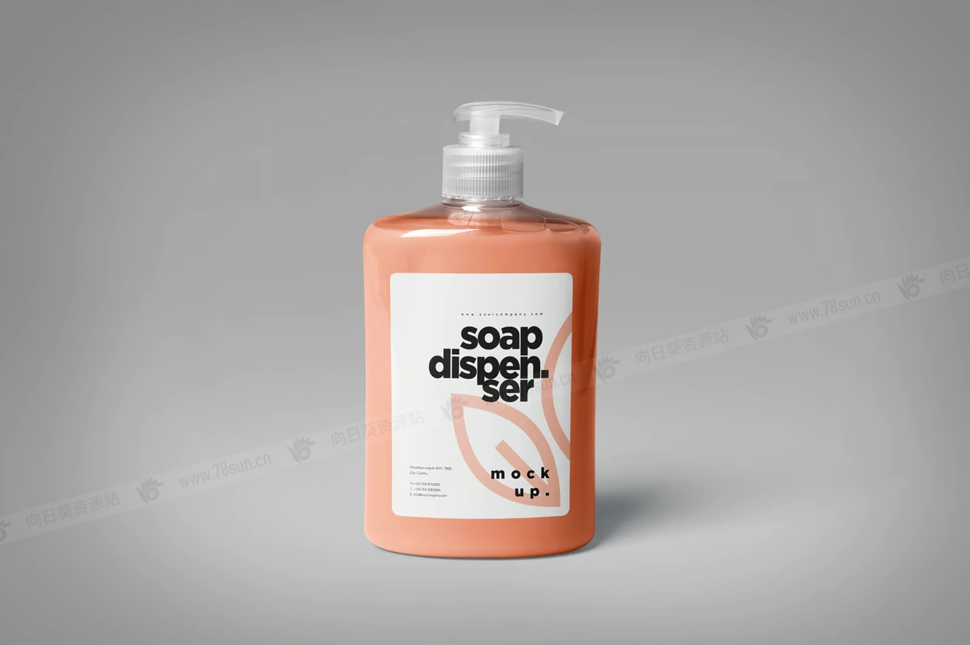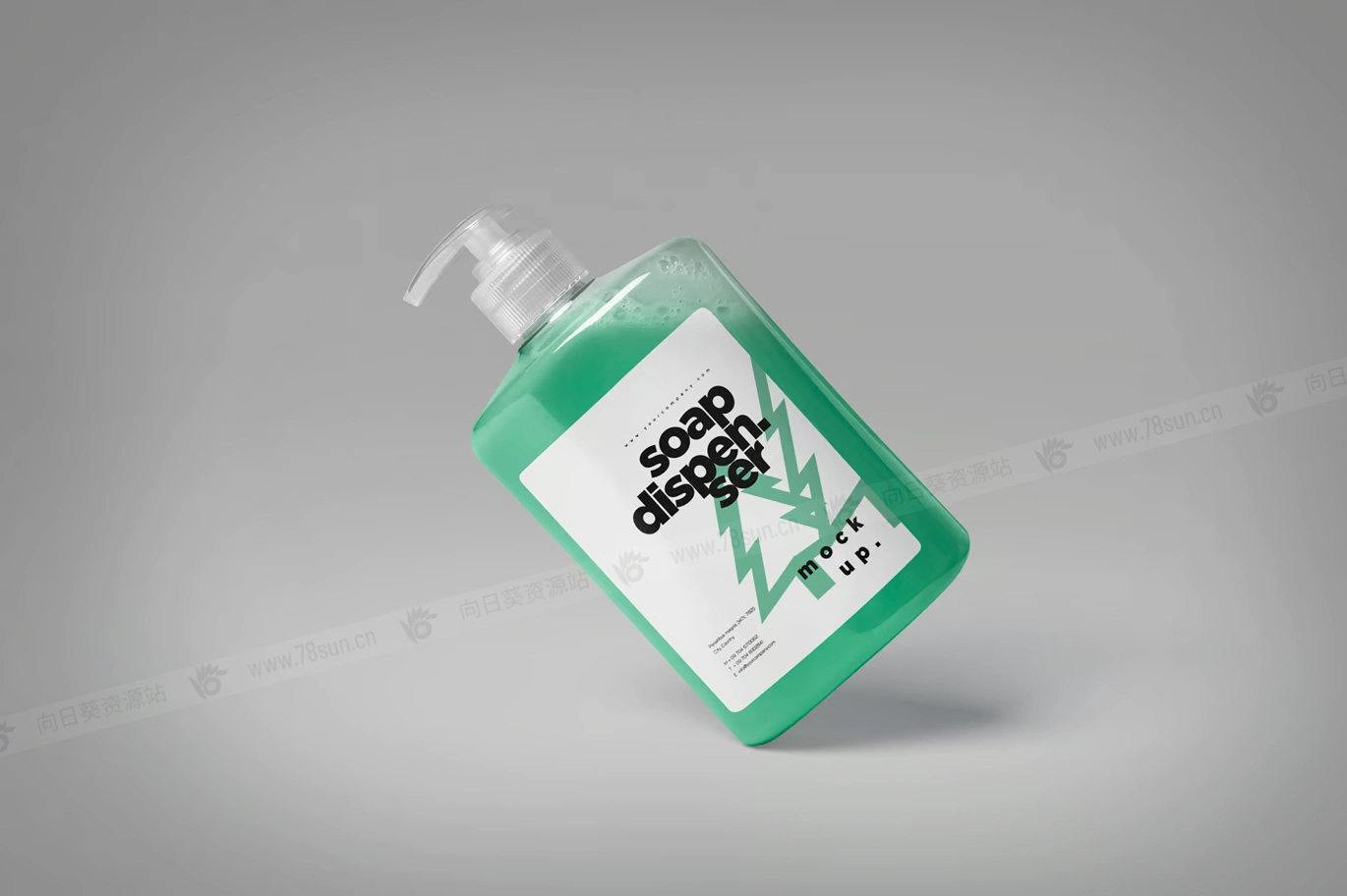 透明洗手液泵瓶塑料瓶品牌VI效果图展示智能贴图psd设计样机。这款高质量的泵瓶模型提供逼真且可定制的演示,