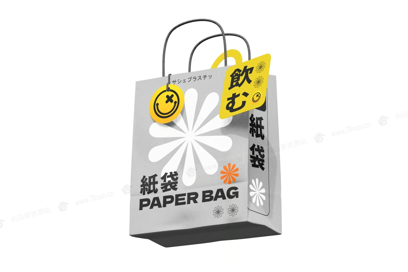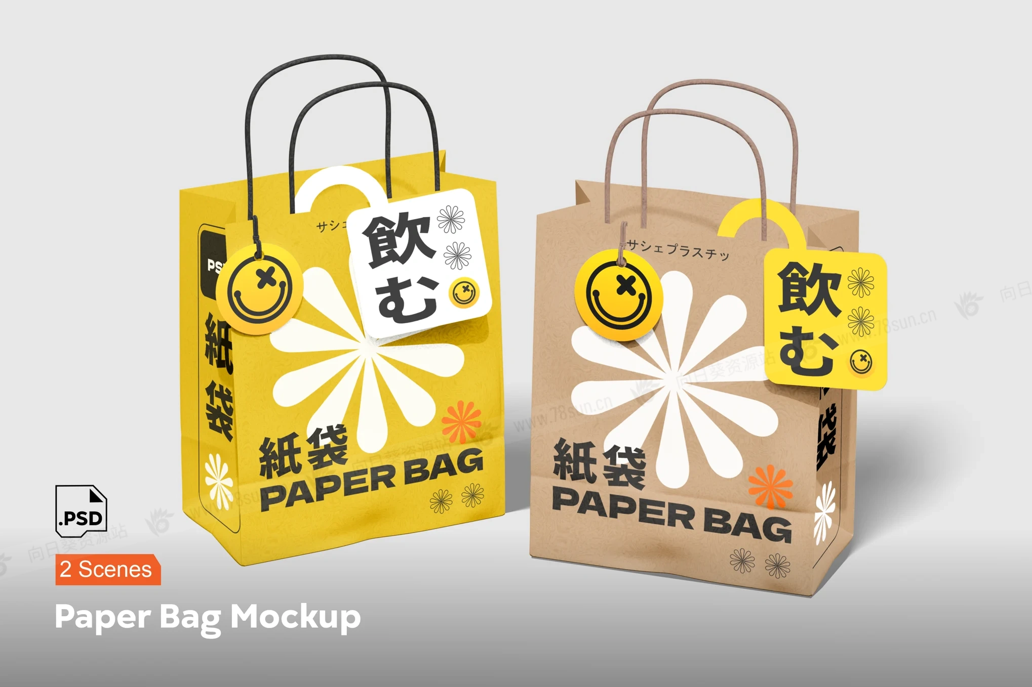 纸袋手提袋购物袋VI效果图展示智能贴图psd设计样机。无论是用于零售、活动还是促销活动,此模型都提供了一个逼真且可定制的平台,让您的品牌、徽标或艺术品栩栩如生。