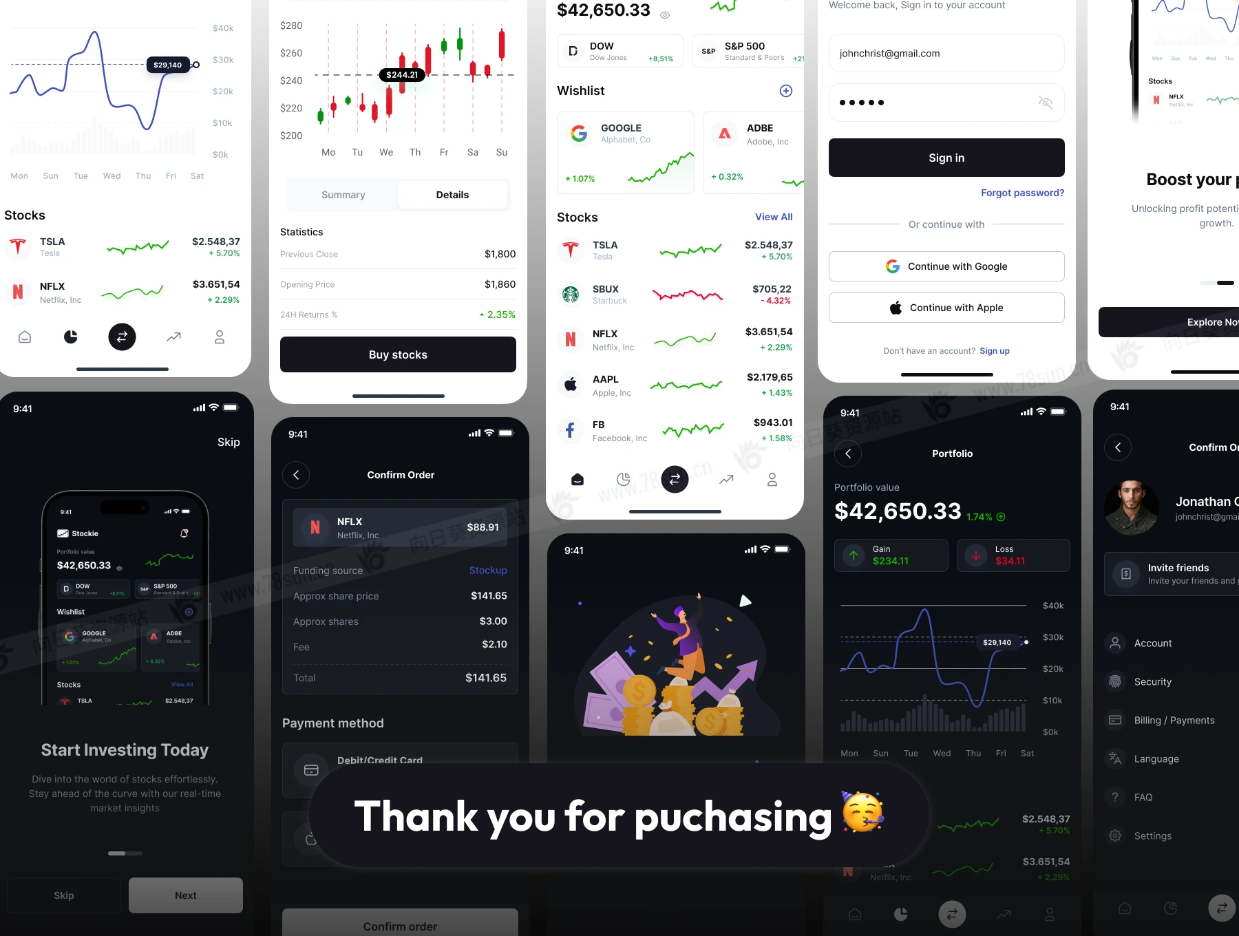 暗亮色金融股票市场app ui界面设计sketch xd fig源文件模板,拥有 40++ 高品质屏幕,设计干净、整洁、现代。在Figma、Sketch和Adobe XD文件中可用的浅色和深色主题。此 UI 套件可根据您的需求在任何类型的相关项目中免费定制。