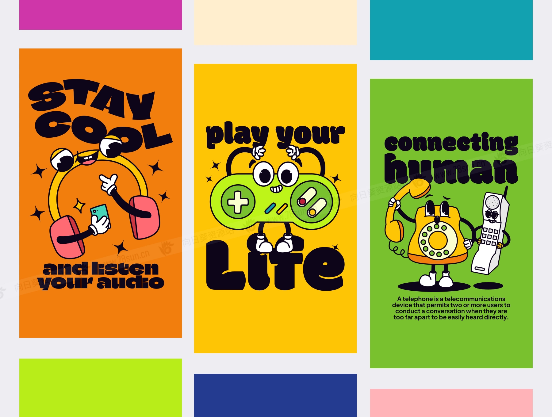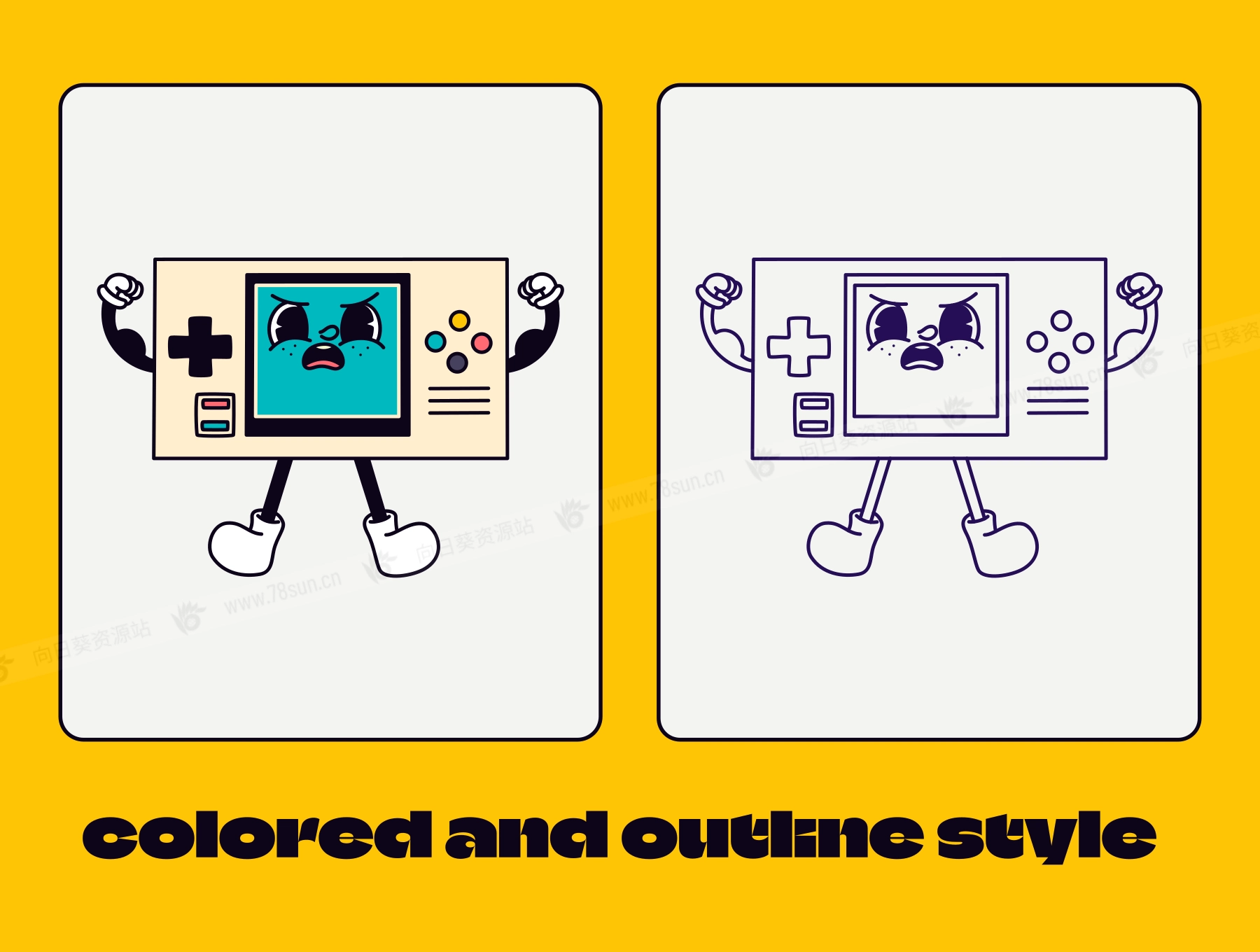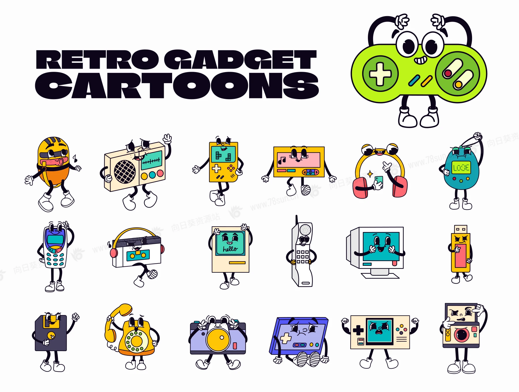可爱卡通复古电话手机游戏机照相机插画矢量图形svg设计元素,19 幅关于复古卡通风格的小工具的插图。这些多功能数字资产适用于广泛的应用程序,包括个人和商业项目。通过这些迷人的插图增强您的登录页面、移动屏幕、书籍跨页、小册子、商品设计和各种编辑需求。