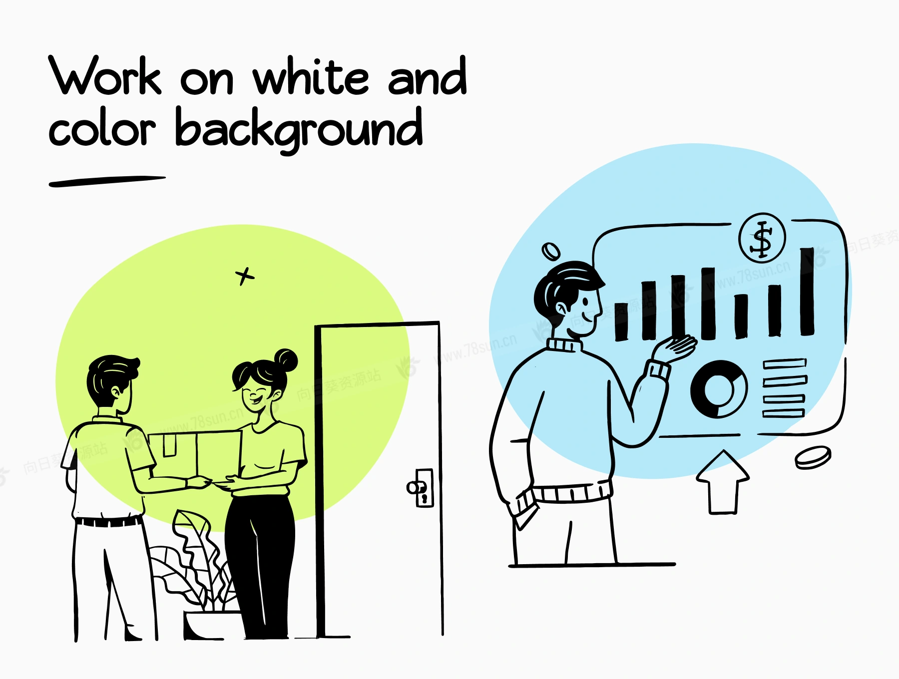 100% 矢量可编辑和缩放。颜色很容易改变。每个插图都组织有序,命名且非常易于使用。