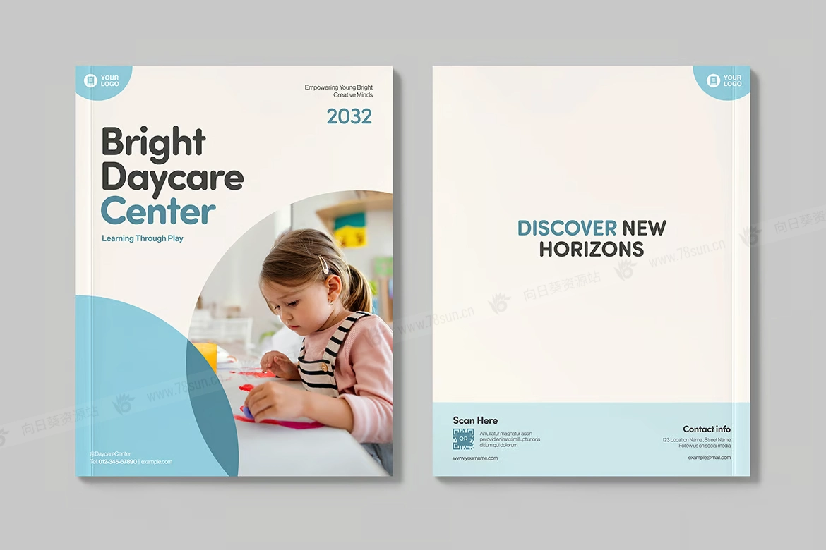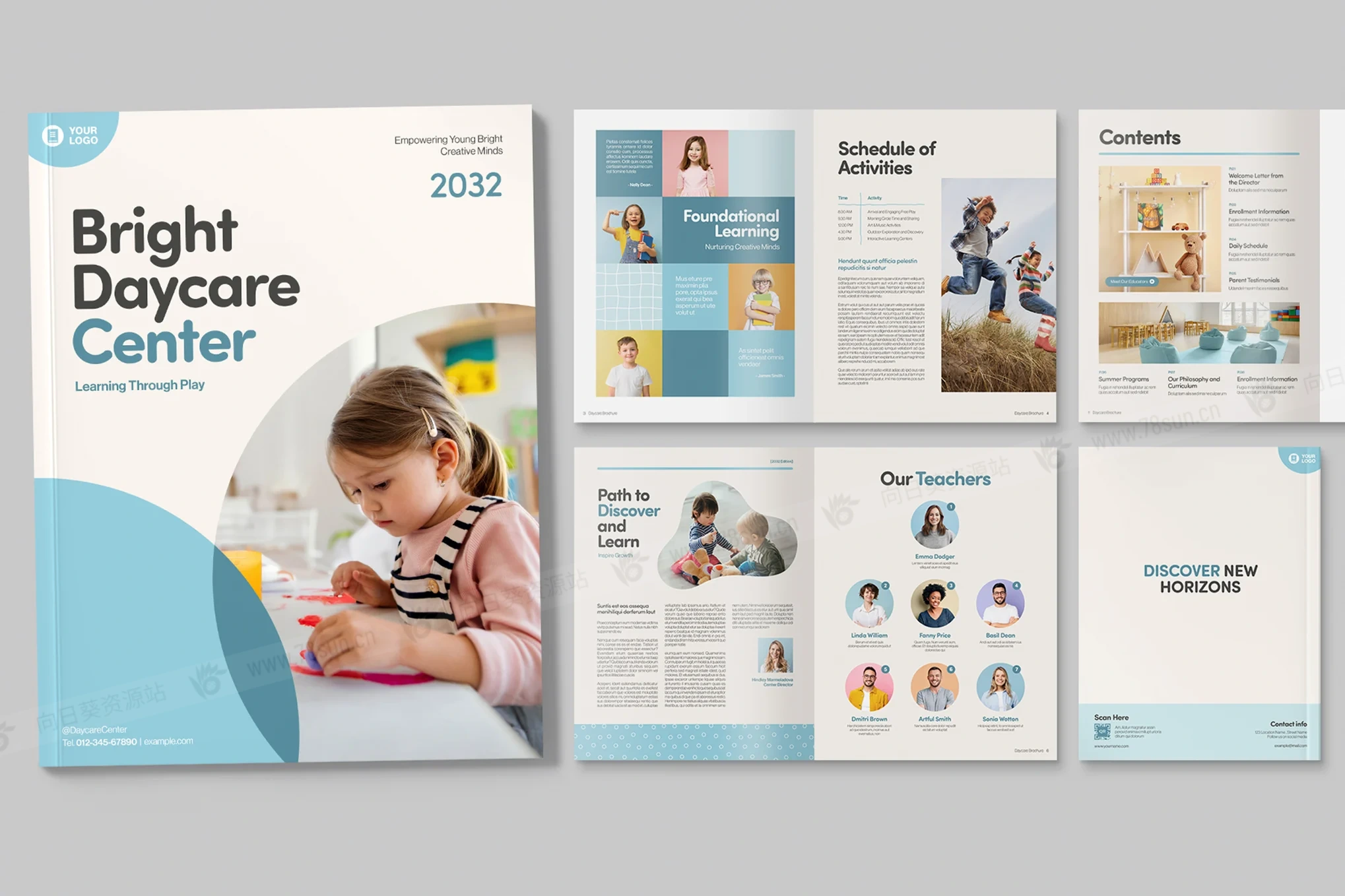 教育学校学术机构儿童双折页宣传手册杂志画册indd设计模板,有 InDesign INDD 和 IDML 格式,非常适合希望突出其早期教育计划的托儿中心、托儿所和幼儿园。它易于编辑且具有视觉吸引力,专为教育工作者、托儿服务提供者和早期教育专业人士量身定制,旨在吸引新家庭并有效地传达他们的服务。