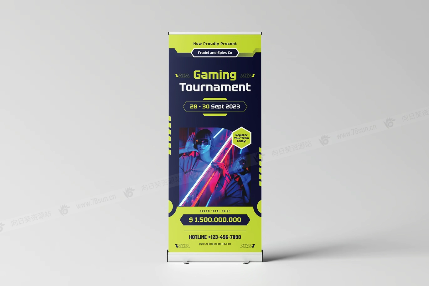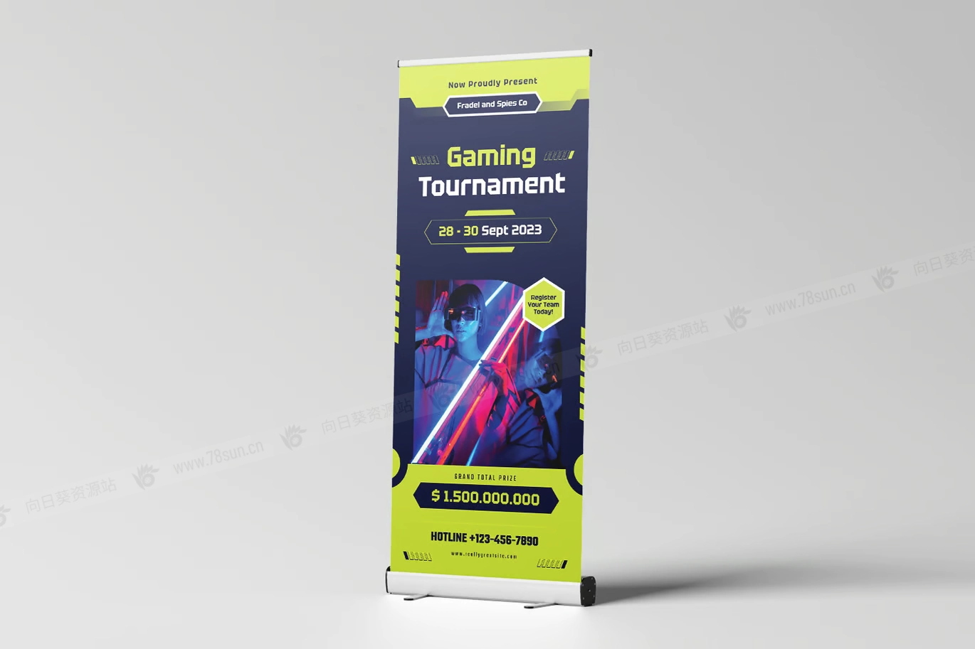 游戏电子竞技锦标赛宣传活动展架易拉宝psd ai设计模板,具有完全可编辑和可定制的 PSD 和 AI 文件。