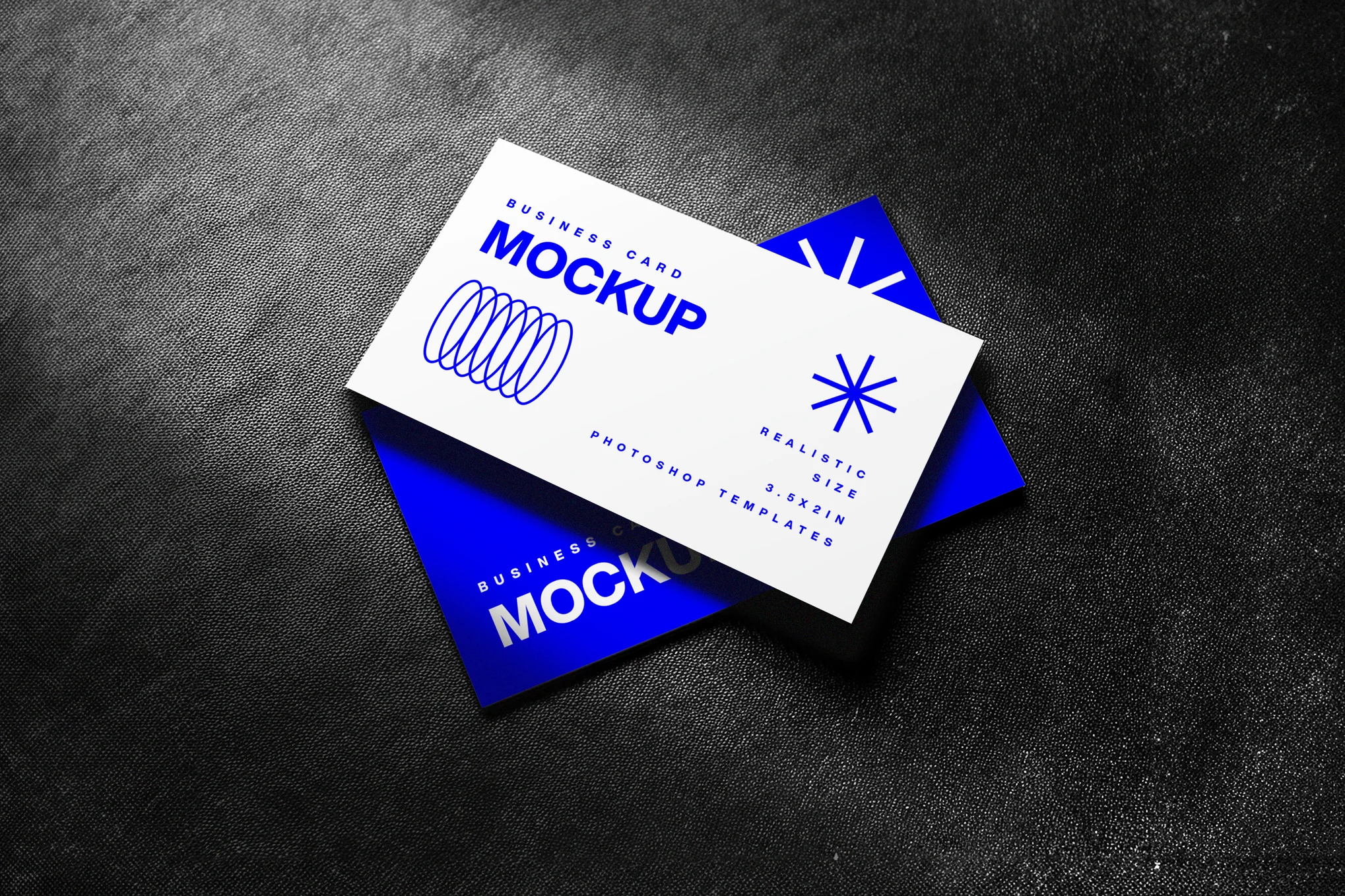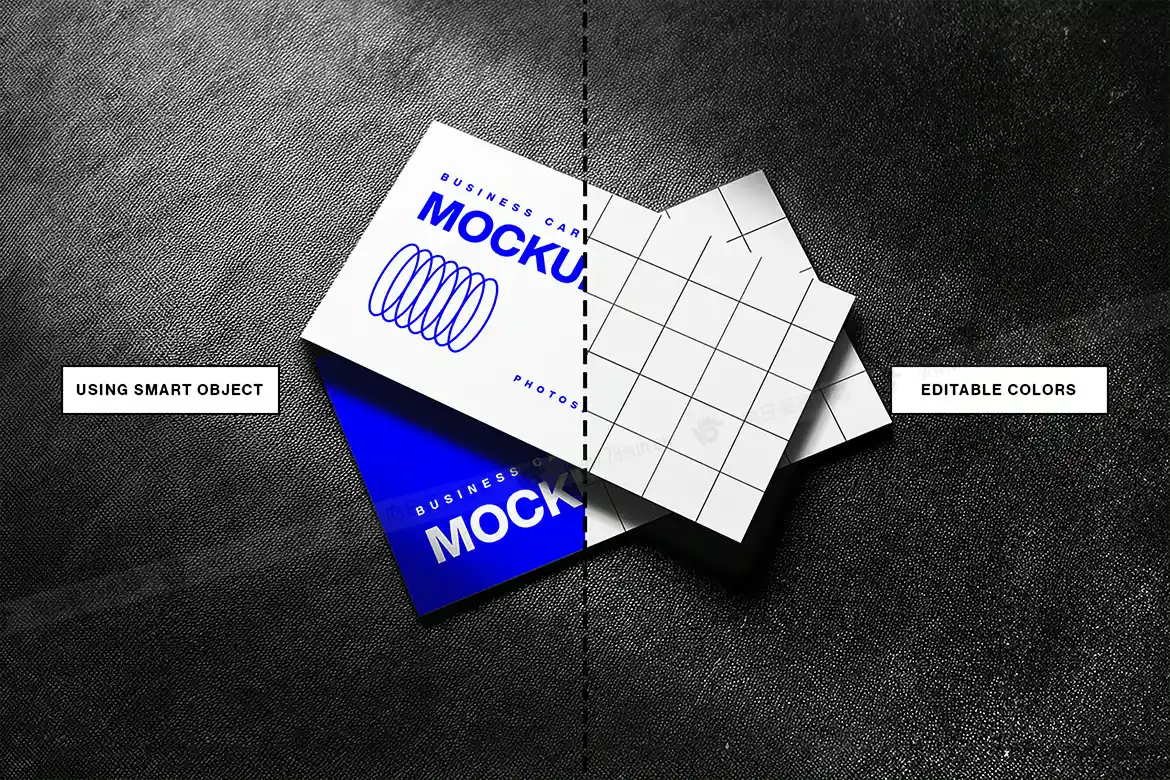 名片商务卡片VI效果图展示智能贴图psd设计样机,用逼真的阴影和纹理创建。基于真实照片和高分辨率图像的模型,看起来优雅且独特。模型设计可用于各种类型,如媒体传单、网页设计、演示文稿、印刷品、广告、社交网络等。