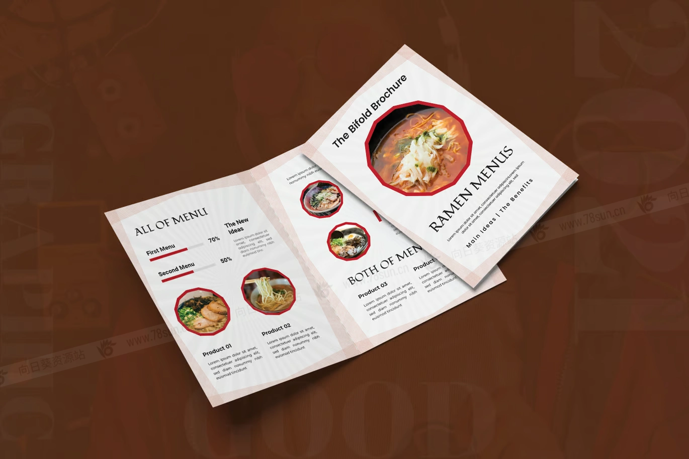 拉面美食餐厅小吃店菜单双折页宣传单小册子psd ai设计模板,此布局适用于任何项目目的。非常易于使用和定制。