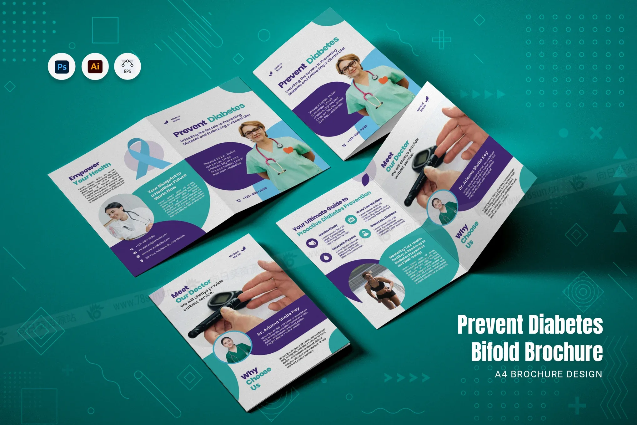 医疗健康双折页宣传单小册子psd ai设计模板,预防糖尿病双折页手册。可以随时修改模型的元素。