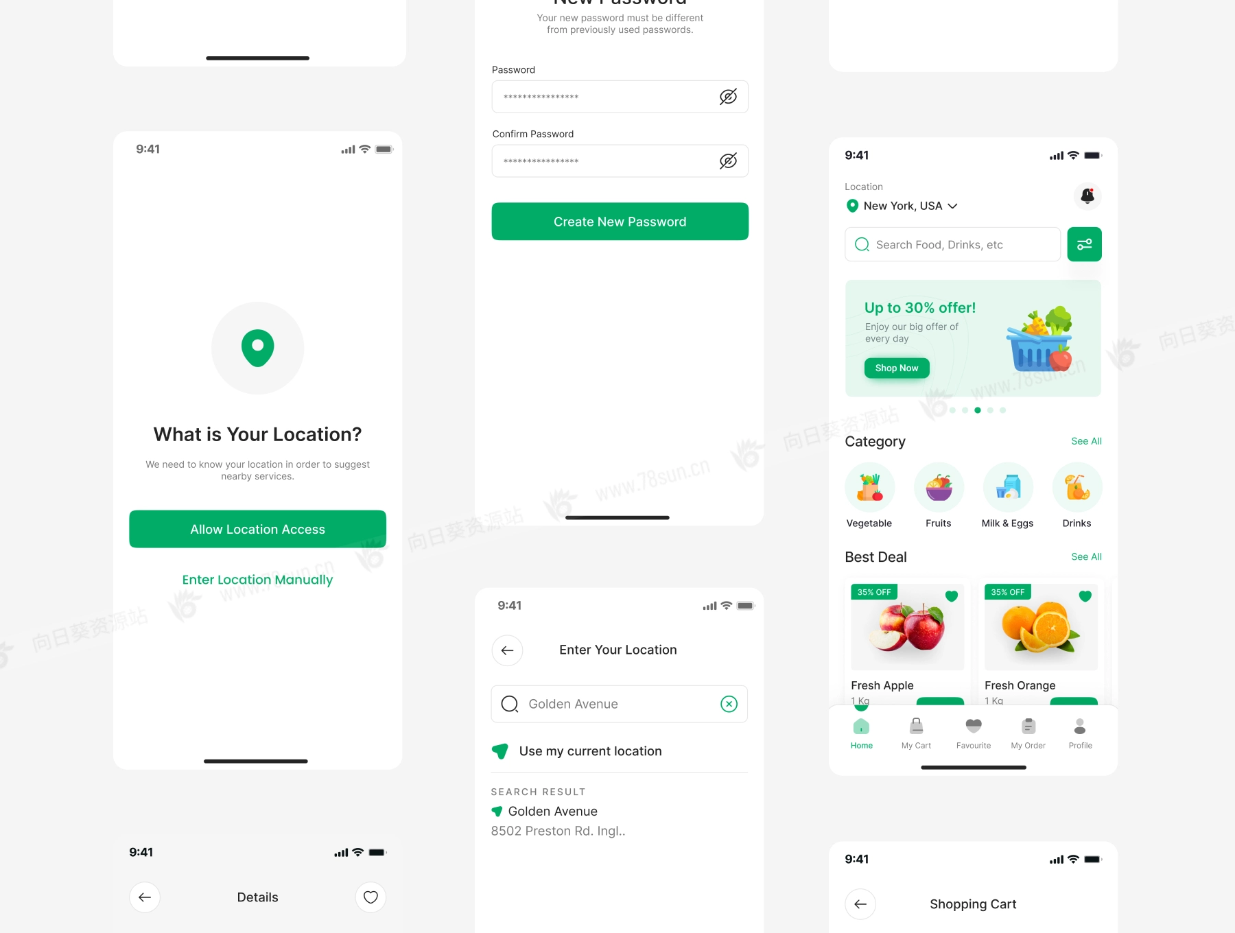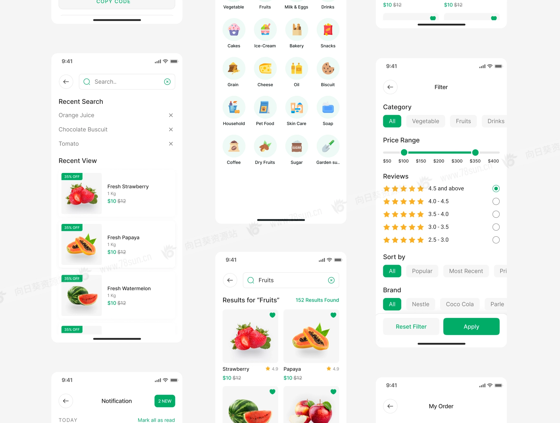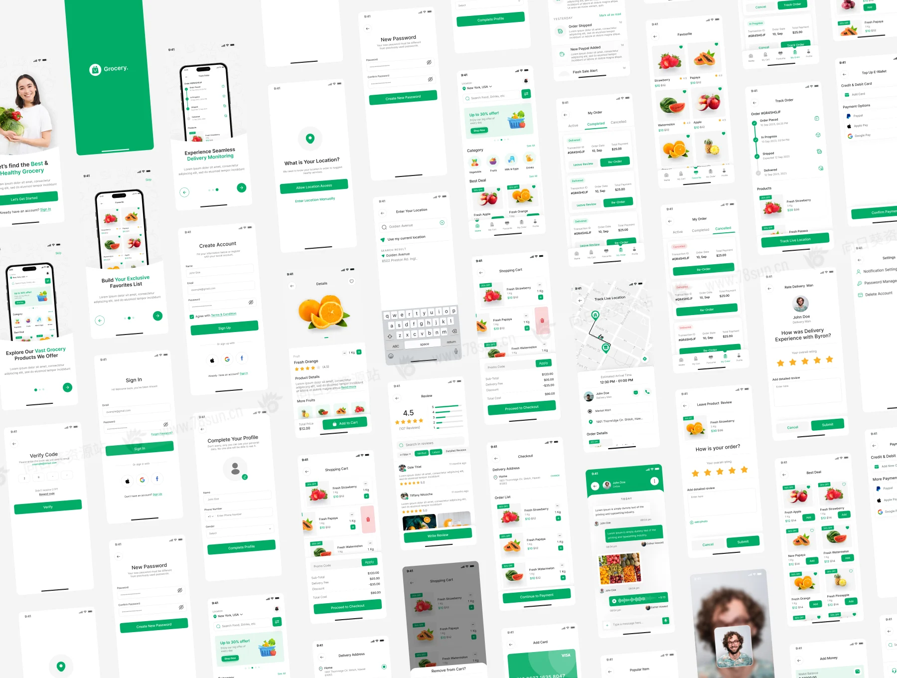 蔬果日用品杂货店在线超市app ui界面设计fig源文件模板,55+ 屏幕 Figma UI 套件