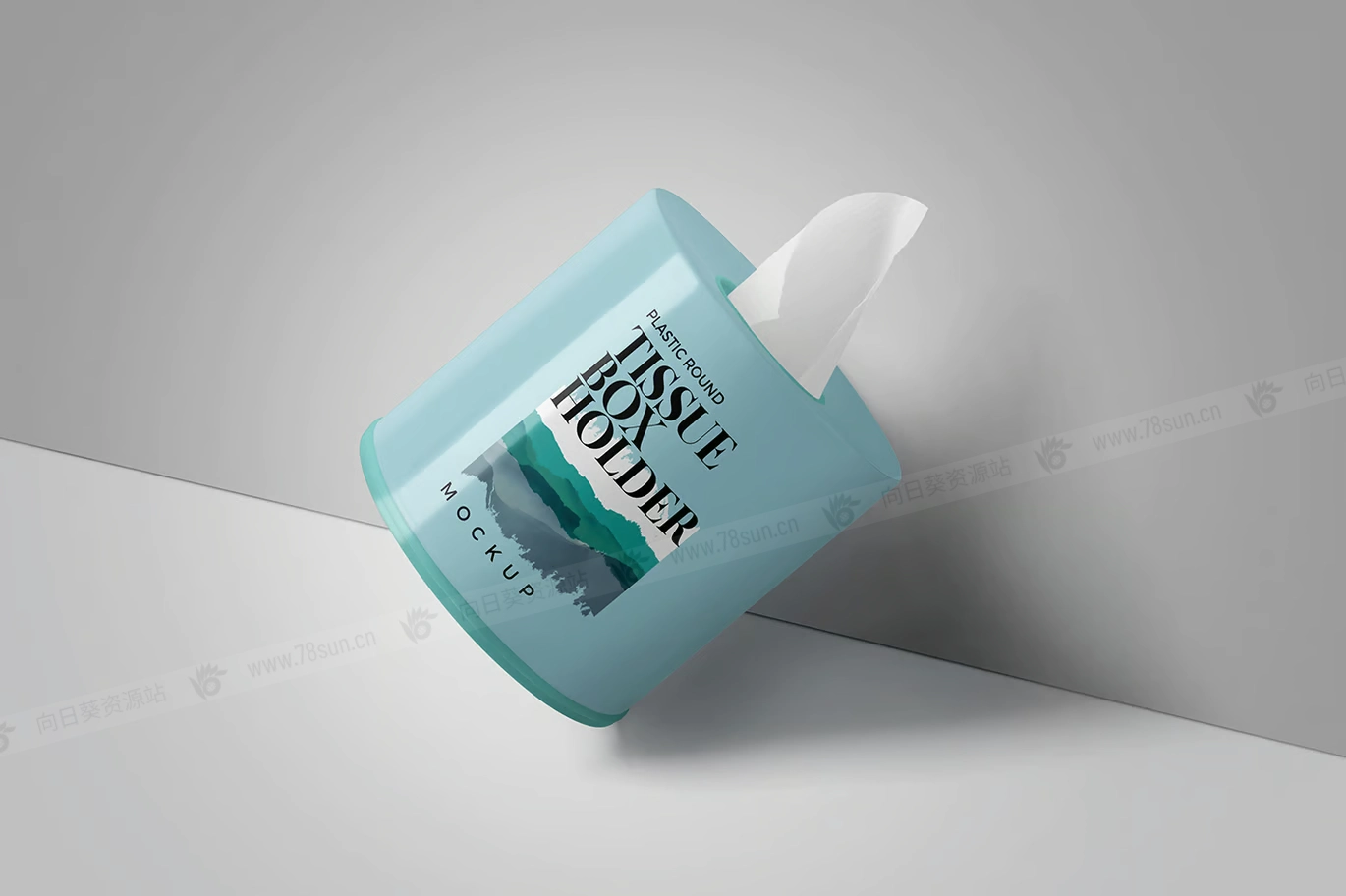 圆形塑料纸巾盒品牌VI效果图展示智能贴图psd设计样机。这个纸巾盒模型提供高质量、可定制的功能,以确保您的演示文稿脱颖而出。