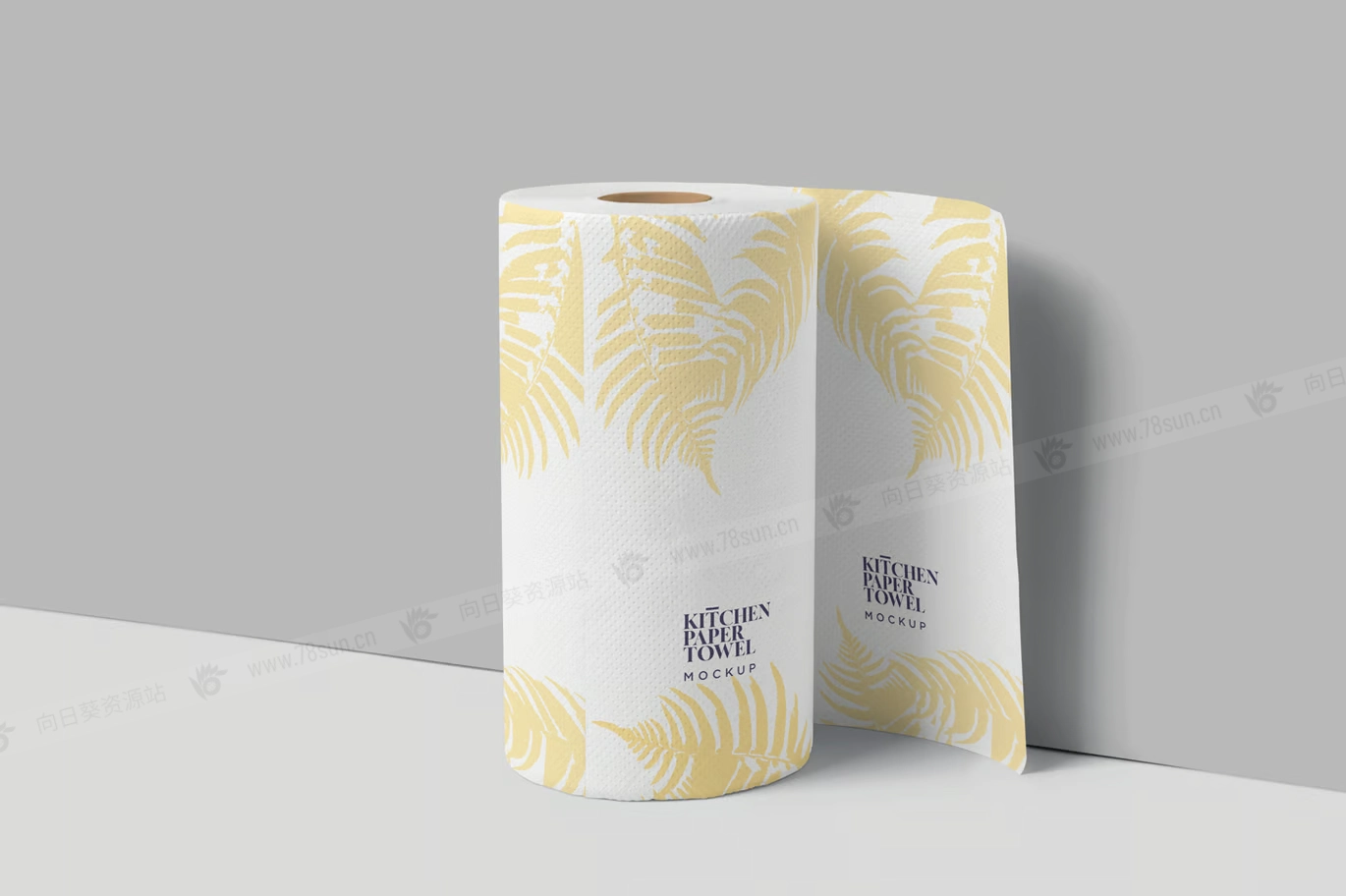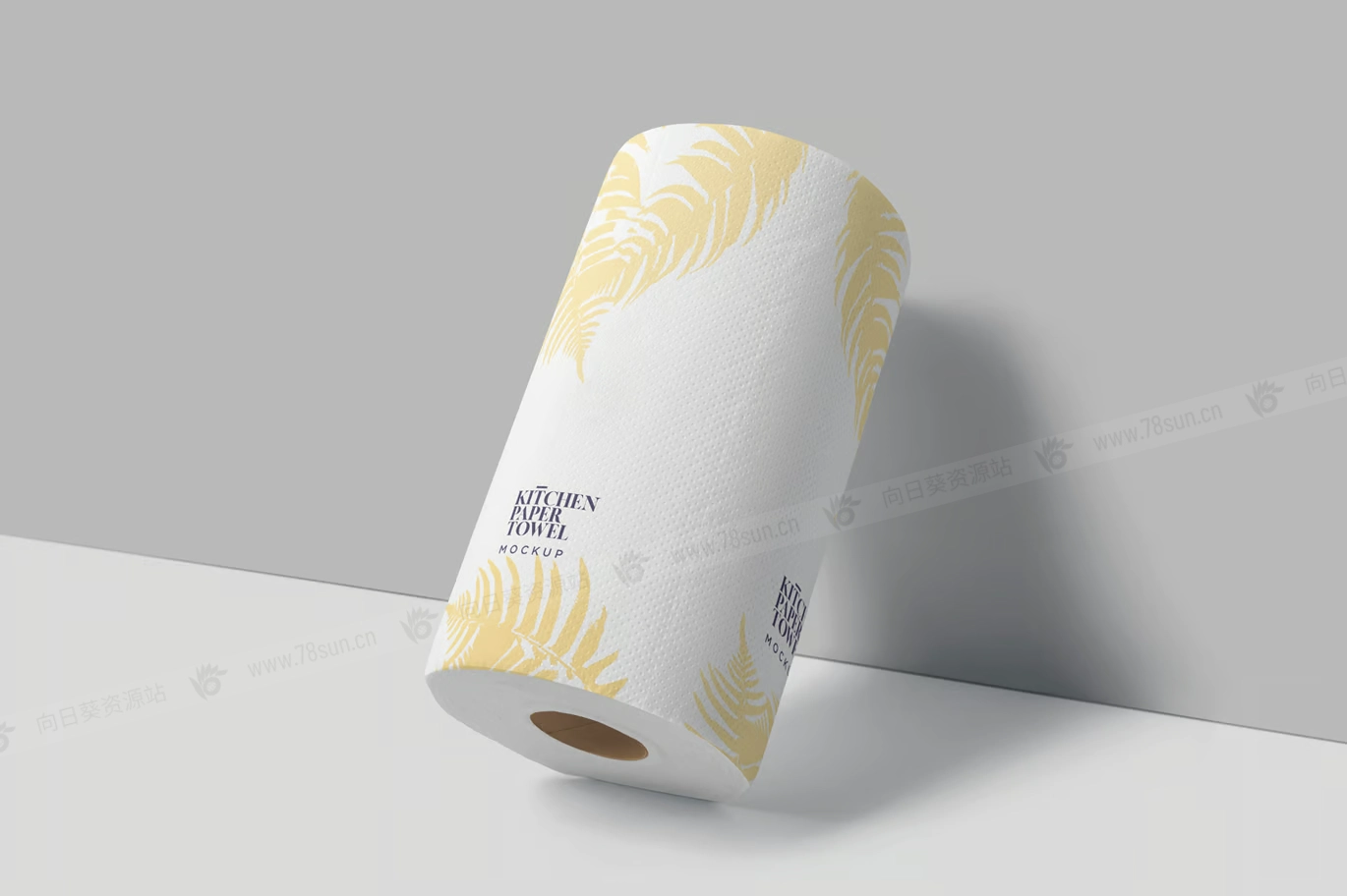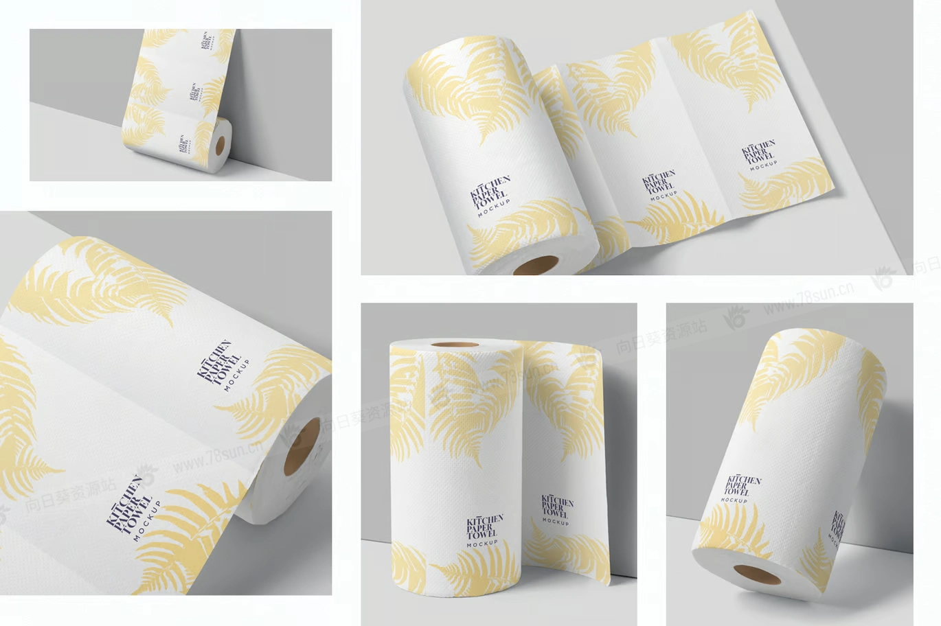 厨房纸巾卷纸品牌VI效果图展示智能贴图psd设计样机。在每卷薄纸上提供单独的智能对象选项,以展示您的薄纸设计。这些模型有 5 种不同的视图,具有自定义设计、颜色、灯光效果、阴影和背景。