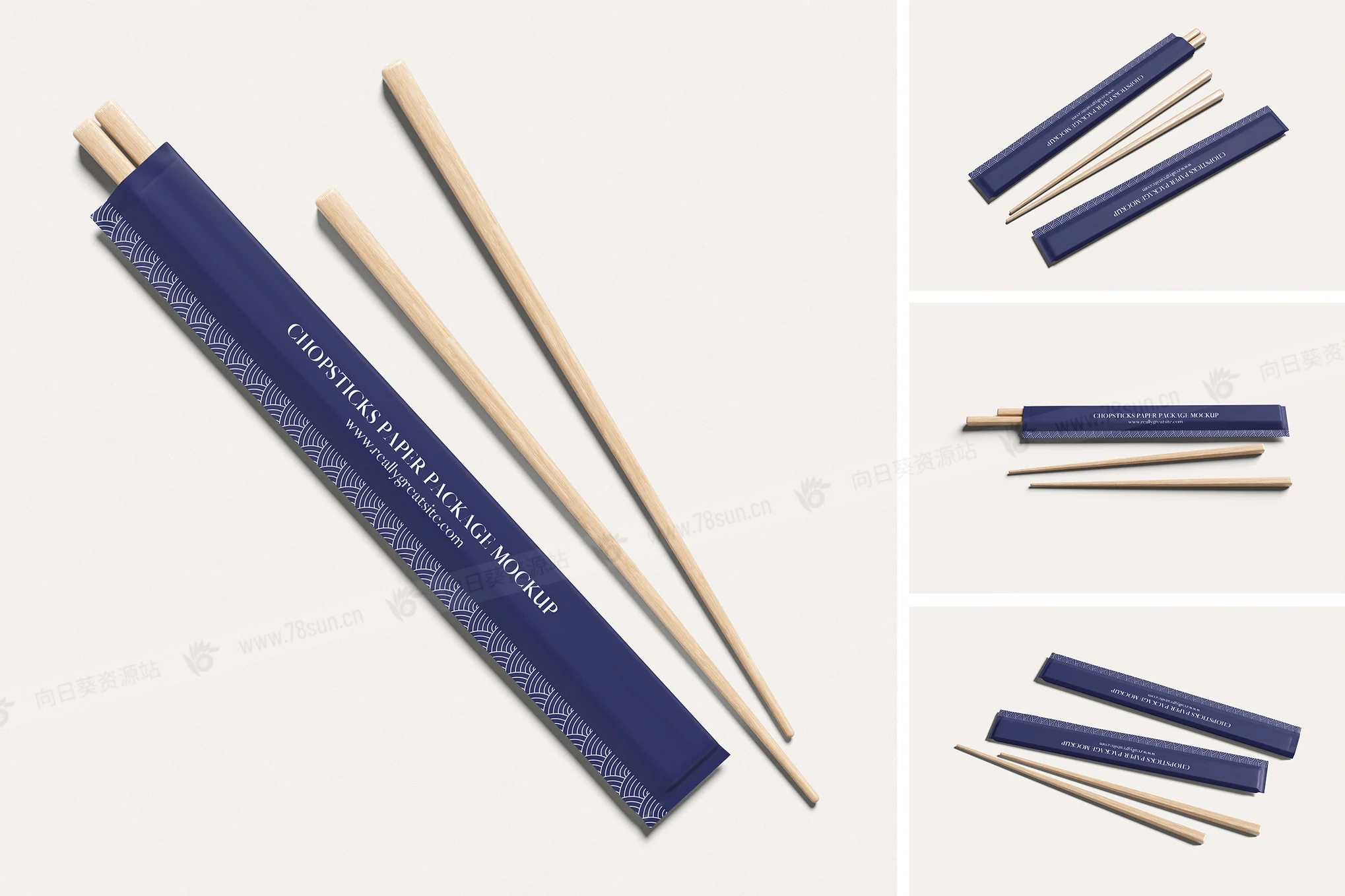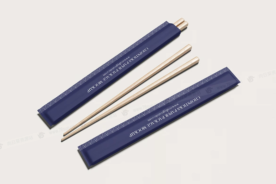 筷子包装纸袋VI效果图展示智能贴图psd设计样机,此模型包括 04 个具有分层良好 PSD 文件,并且此模型还使用智能对象功能,这意味着您可以在几秒钟内轻松快速地使用自己的设计更改当前设计。