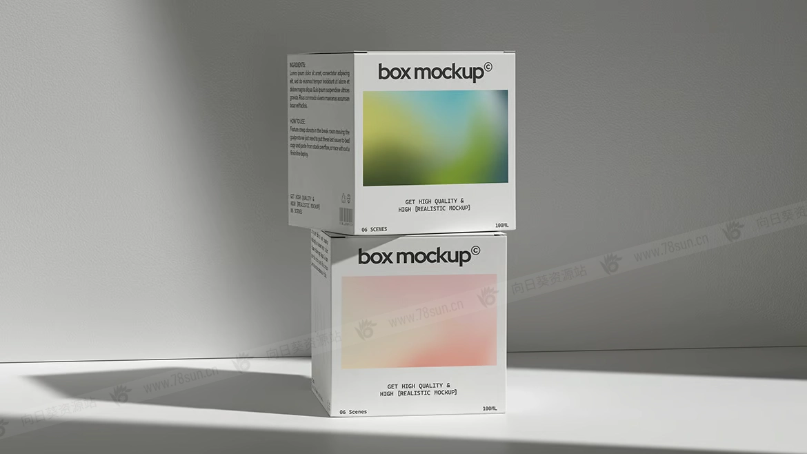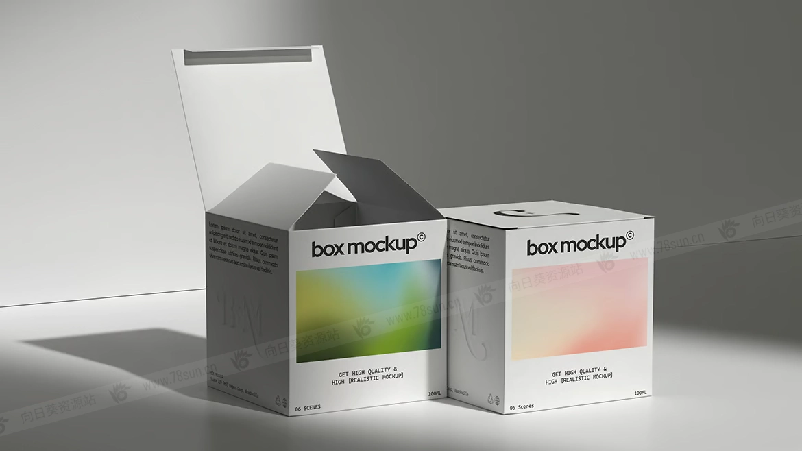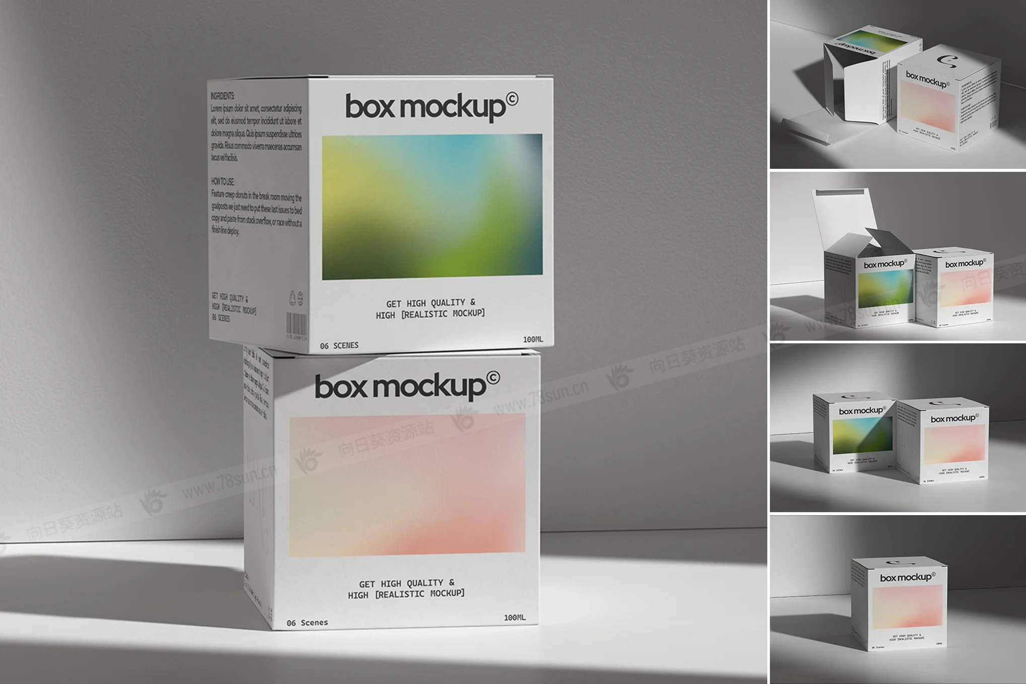 方形包装纸盒VI效果图展示智能贴图psd设计样机。它易于编辑并带有智能对象功能,使插入您自己的设计变得简单。