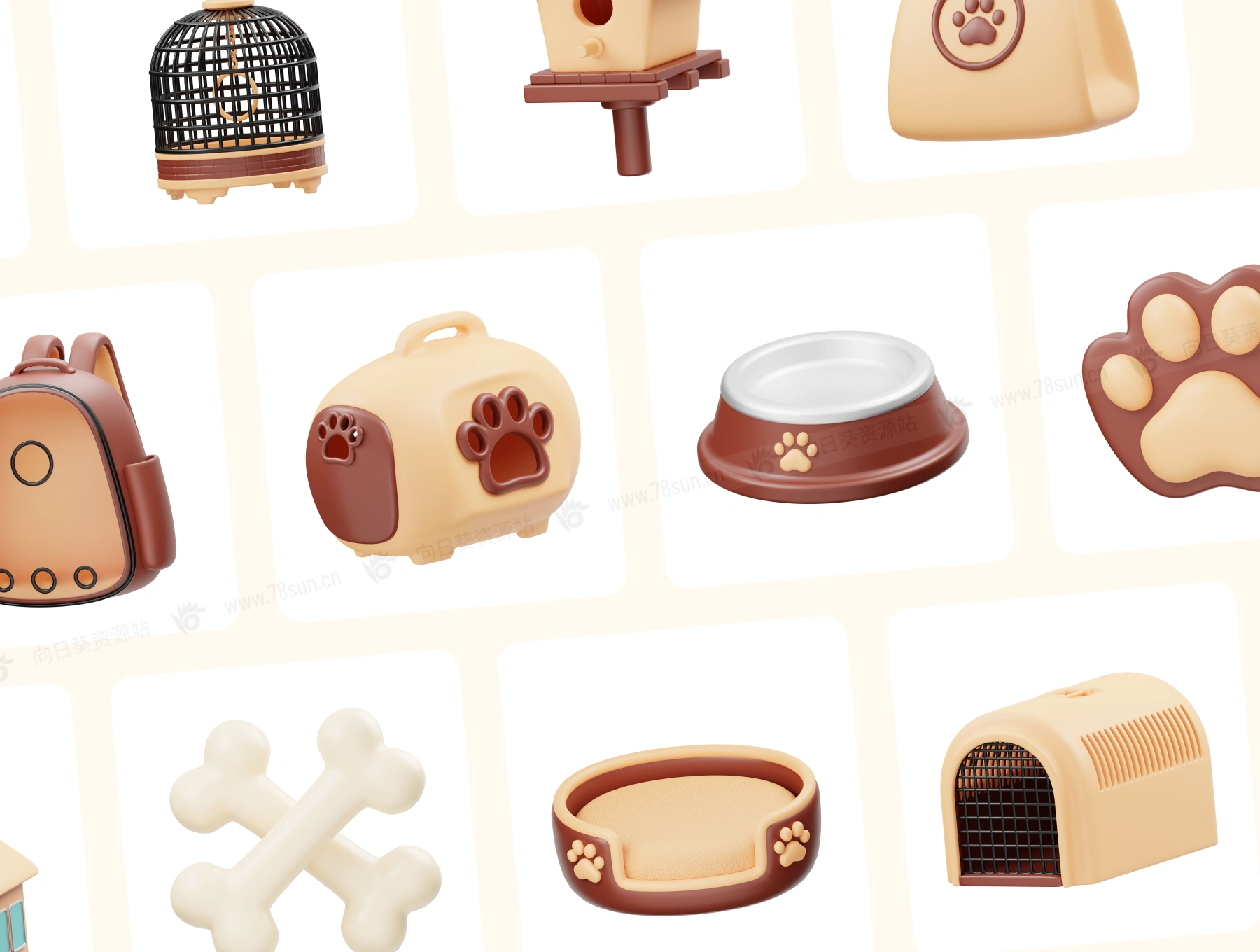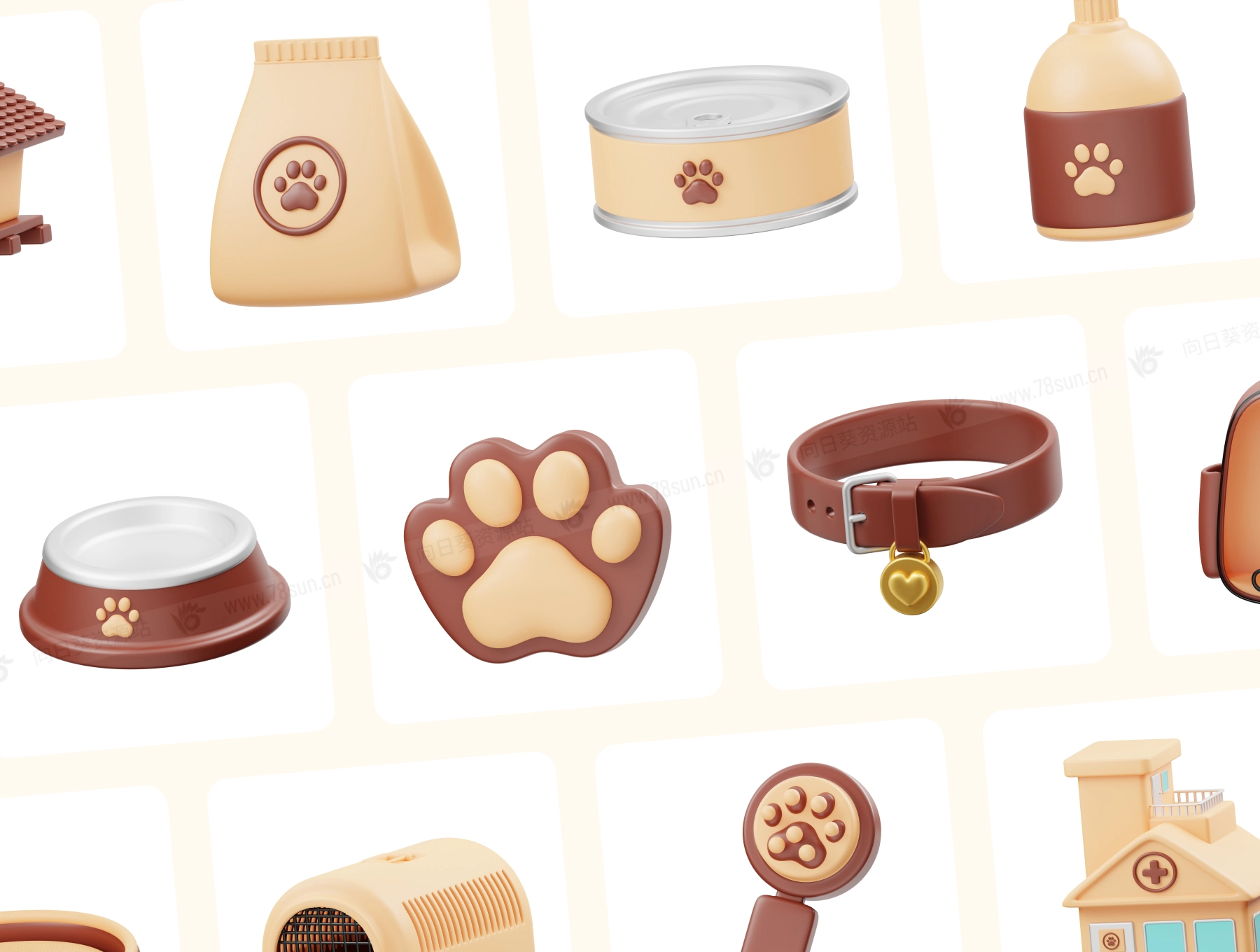 3D立体宠物护理icon图标blend设计模板,15 个现成的宠物护理 3D 图标文件对象,适用于网站、移动应用程序等。使用 3D 资源增强您的设计。