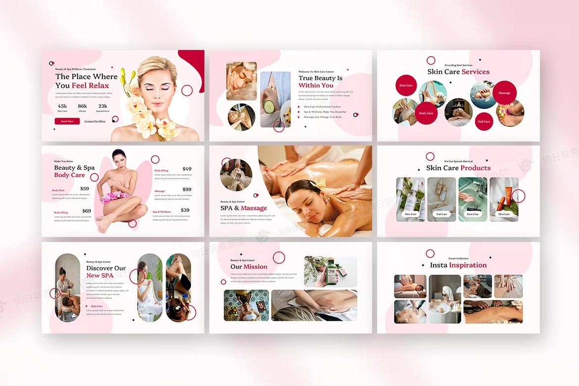 美容SPA护肤化妆品演示PowerPoint幻灯片模板,此演示模板可以用于各种目的,如美容与SPA、沙龙、发廊、企业业务、教育、项目、数字代理、咨询、管理、保险、创业、数字营销、行业、技术、投资组合、广告,也可以用于定制生产。