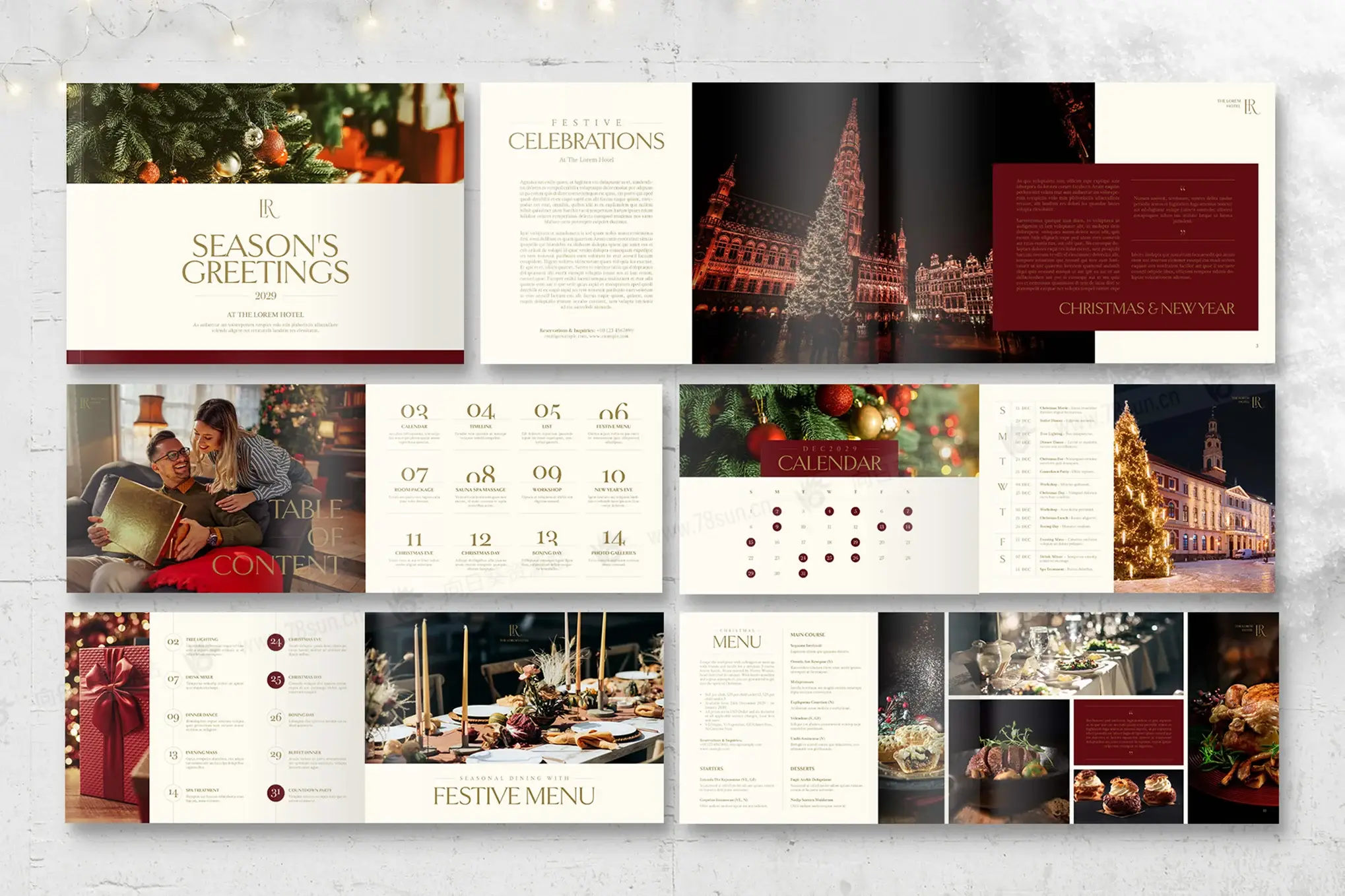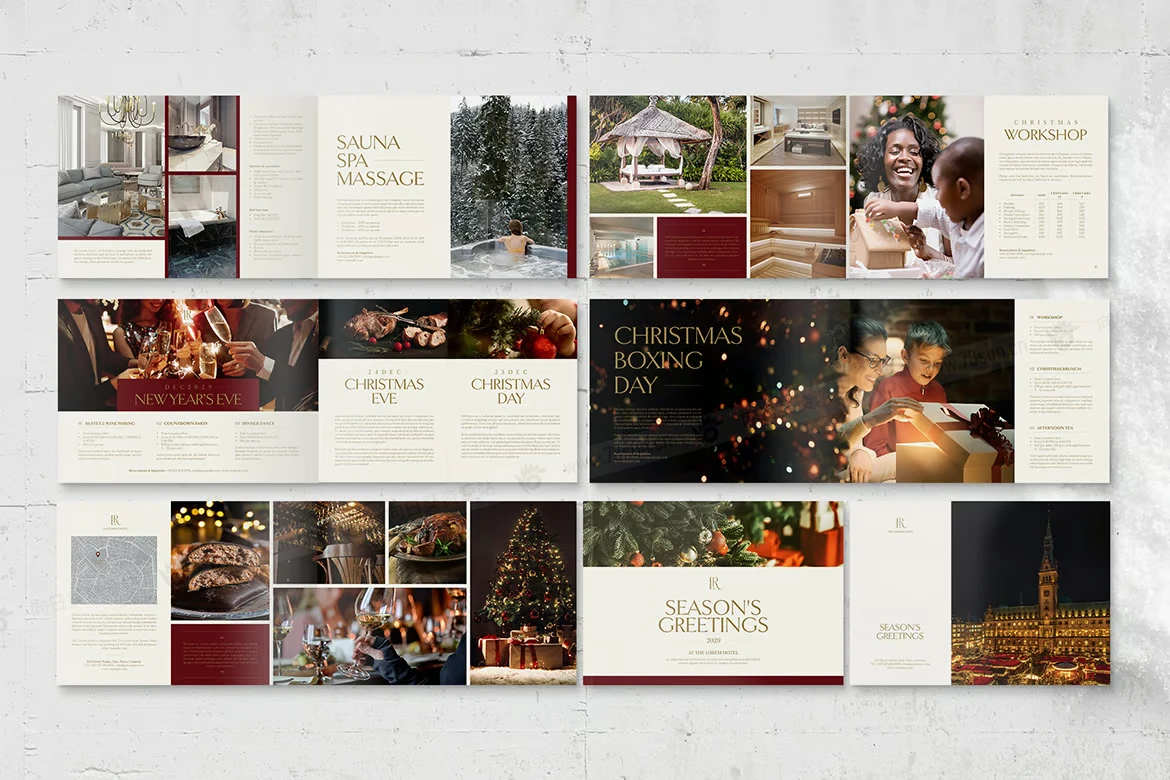 横版圣诞节日小册子杂志宣传册画册indd设计模板,以节日为主题,非常适合希望推广圣诞活动、服务和促销的酒店和度假村。它以 InDesign INDD 格式提供,非常适合创建景观杂志、小册子或杂志。这是一个多功能的布局模板,非常适合希望分享他们的节日产品或任何以圣诞节为主题的项目的酒店业客户。