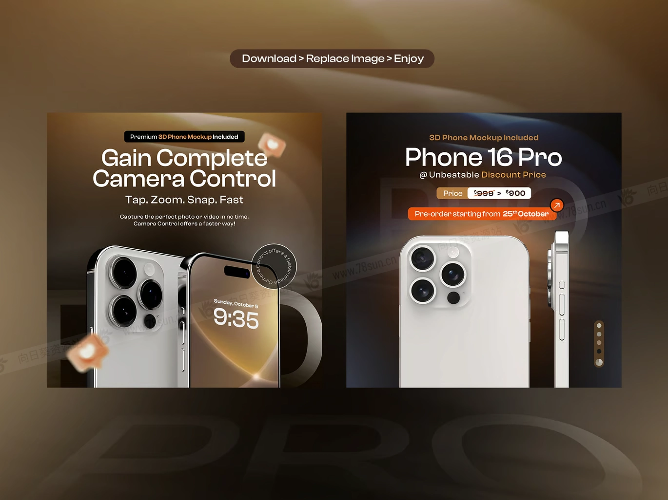 iPhone 16 Pro Sale 社交媒体横幅模板集,旨在以视觉上令人震惊和专业的方式展示最新的智能手机。这些文件易于编辑,以便您可以轻松更改 标题 和您选择的其他文本,还可以更改文本和背景颜色。