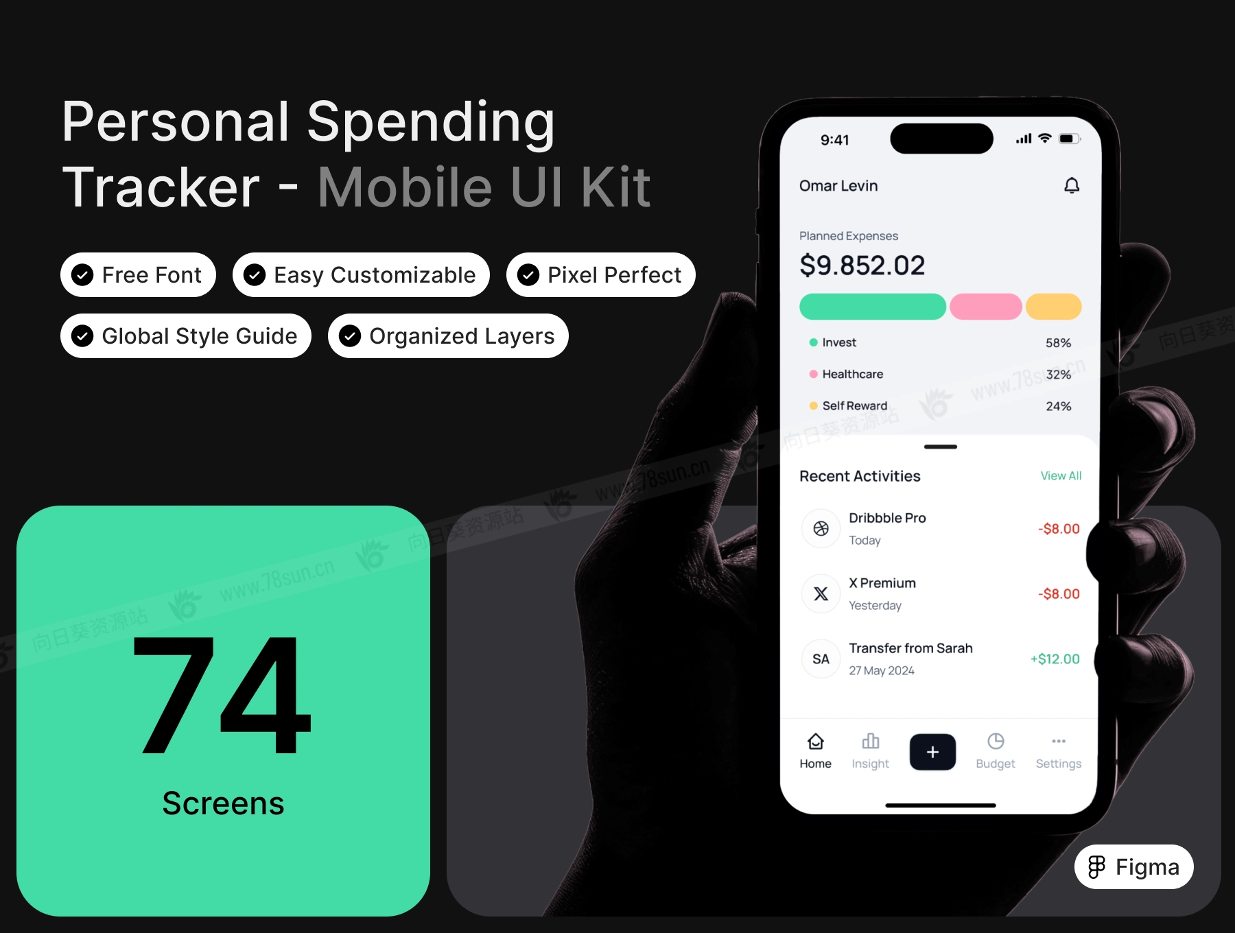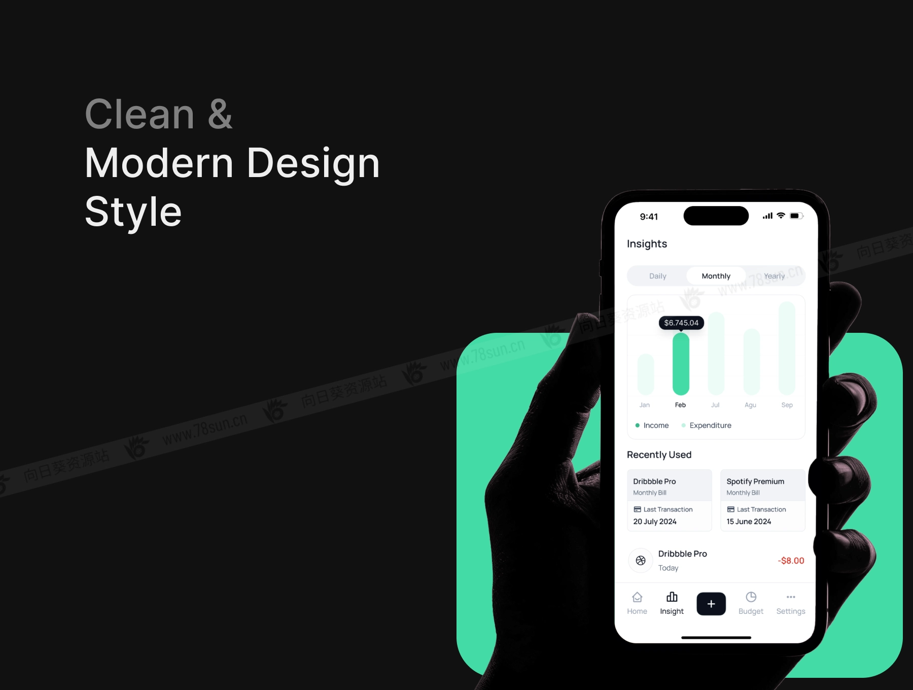 显示总预算的直观细分 4.轻松导航: 每个屏幕底部都有一个清晰的导航栏,允许用户在主页、洞察、预算和设置之间切换。