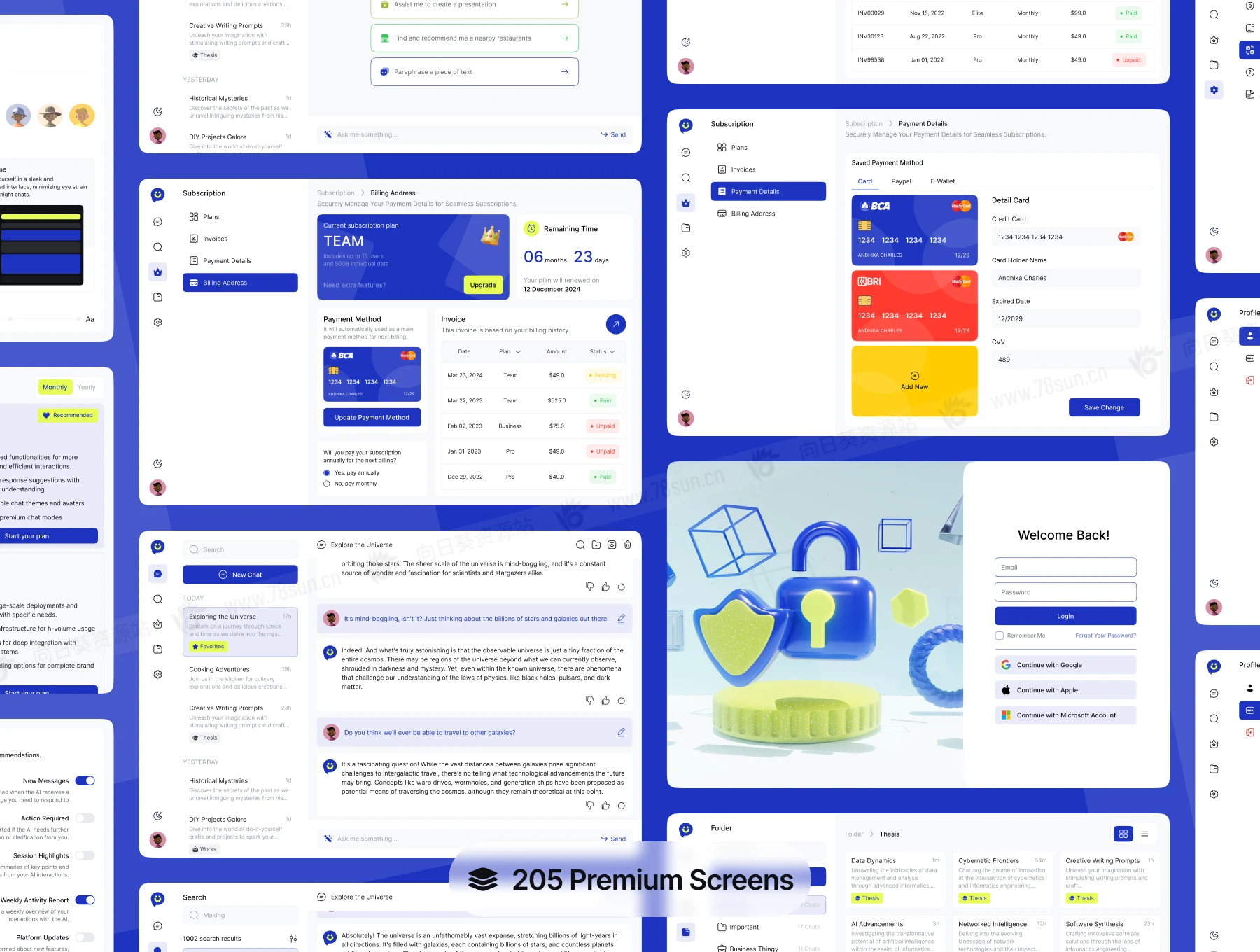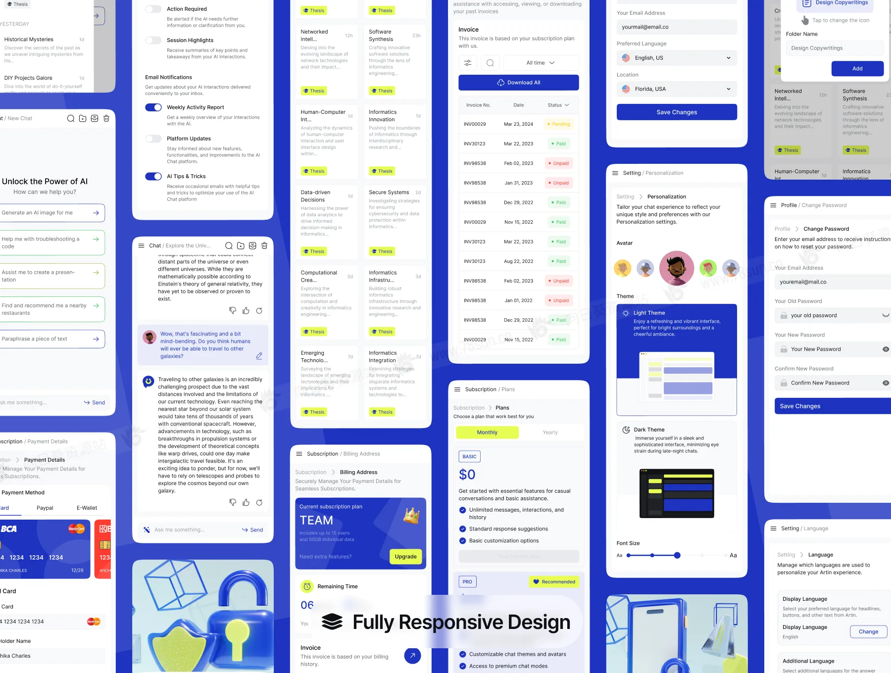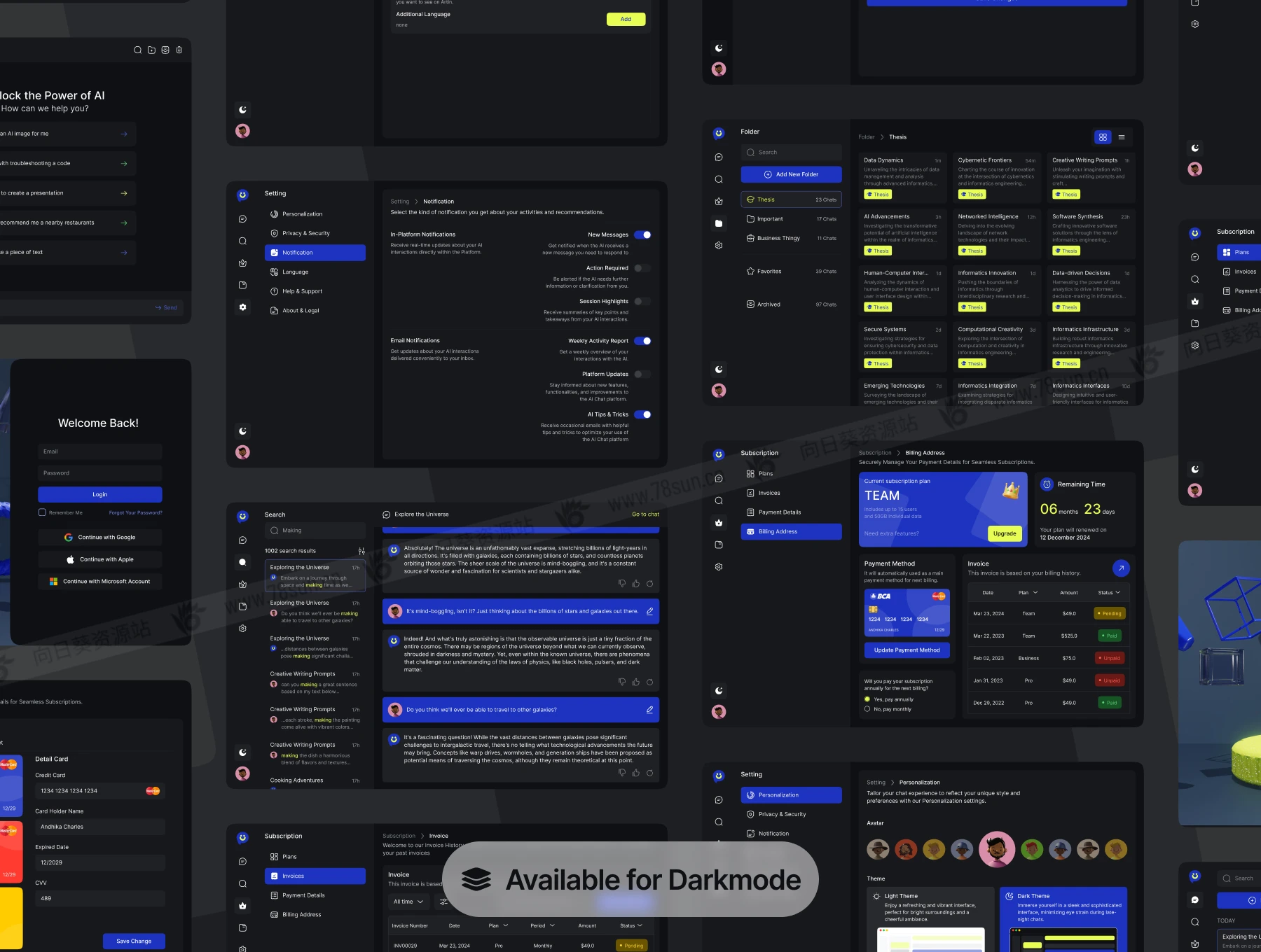响应式全平台AI聊天系统网站web/app ui界面设计fig源文件模板,一体化 AI 聊天仪表板/网站 UI 套件,旨在提升您的数字交互。使用 AI 消息仪表板无缝管理对话,提供直观的导航和实时洞察。使用文件夹功能保持井井有条,让您轻松分类和访问聊天,并辅以存档功能以实现高效存储。拥有浅色和深色主题选项,可满足您的喜好,确保视觉上令人愉悦的体验。通过订阅选项,解锁高级功能并增强您的工作流程。