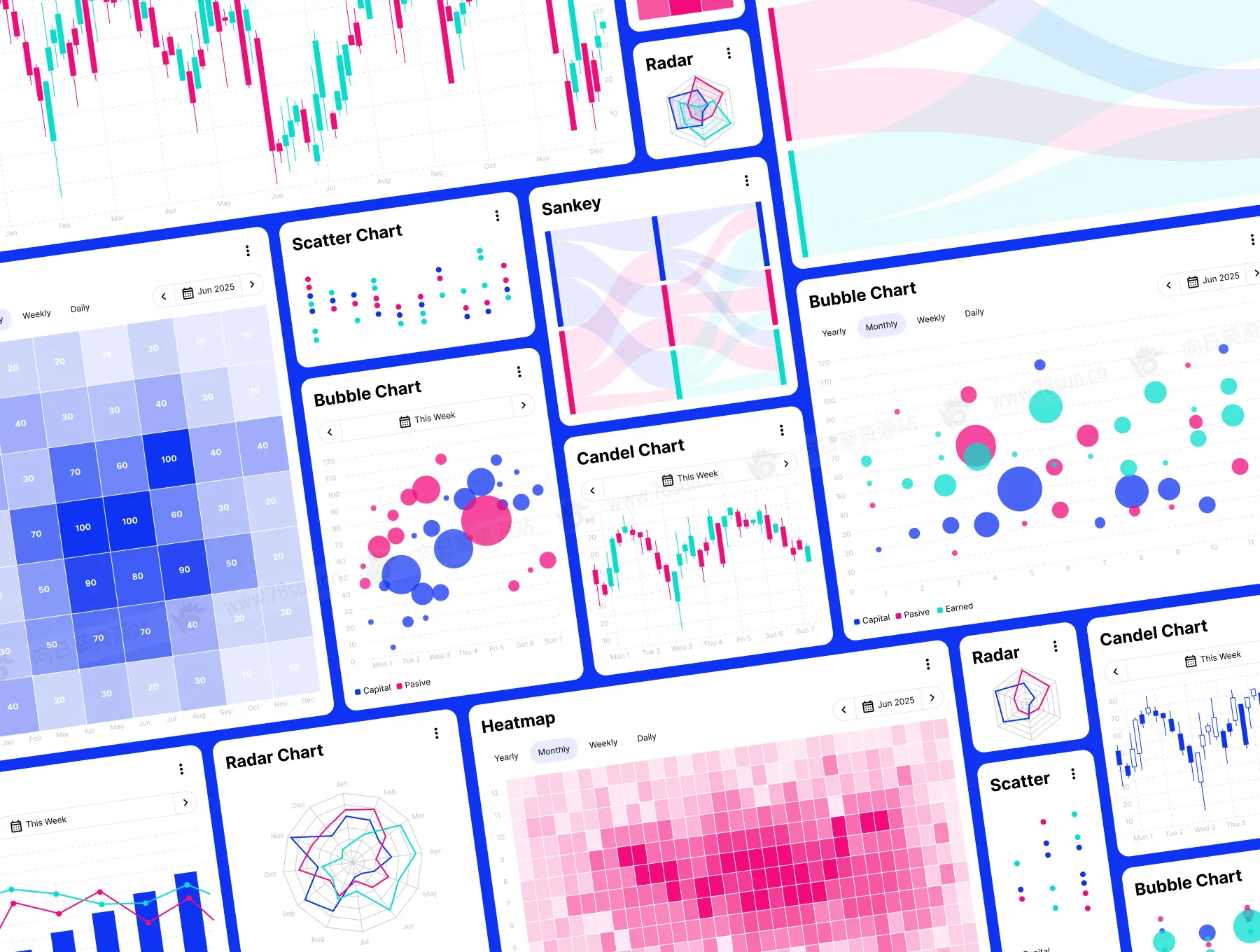 您有无限的选择,允许您快速轻松地选择正确的图表类型、风格化其设计、选择合适的网格、自定义值以及与其他小部件和插件结合使用。可以组合到预制的 UI 仪表板中,也可以实施到您的系统中,以完美满足您对用户界面、仪表板、管理面板、信息图表等的需求……