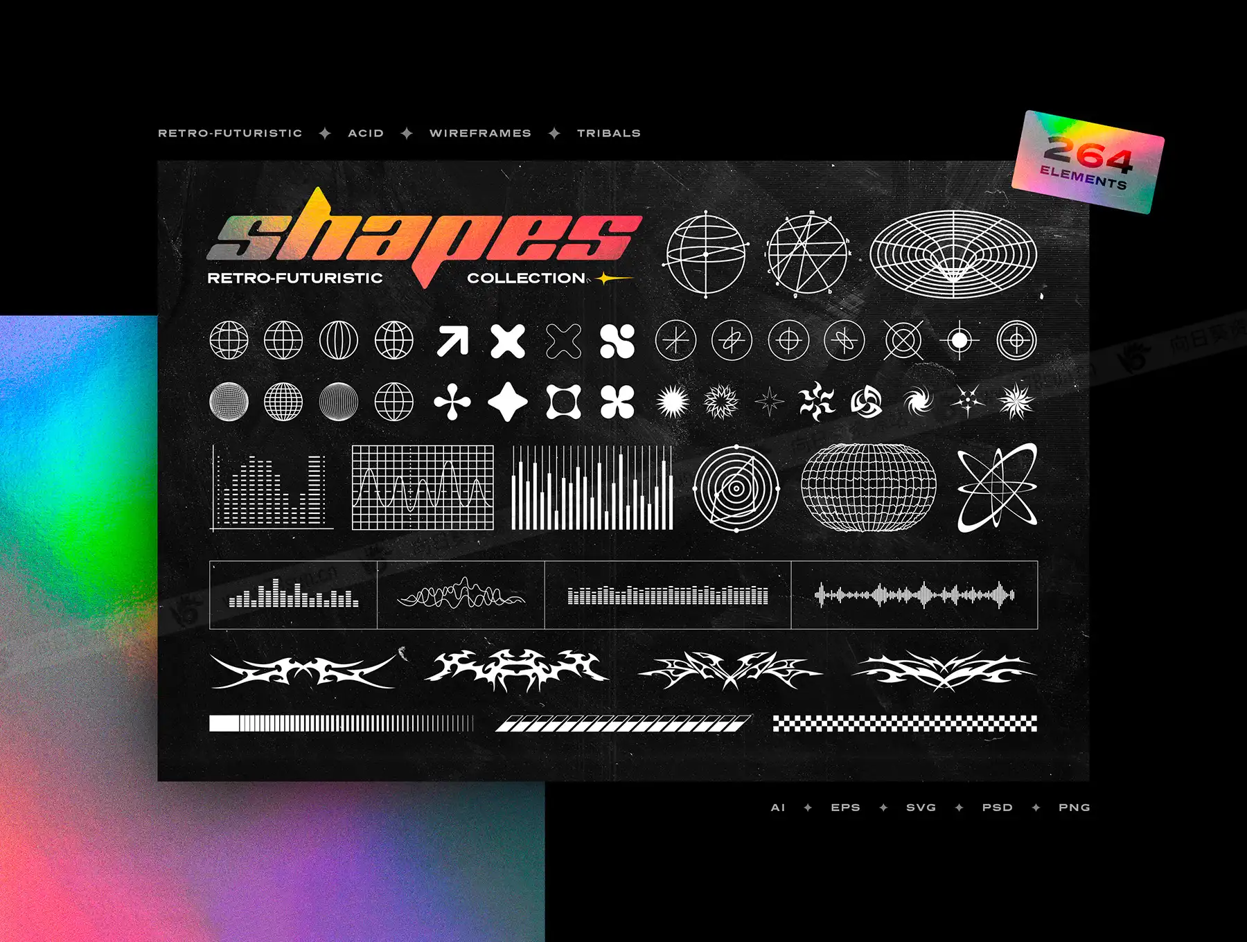 潮流Y2K抽象几何形状图形图案印刷产品包装psd ai设计元素,包含惊人的 264 个元素,有多种格式可供选择:PSD、AI、PNG、SVG 和 EPS,使其成为各种项目的多功能选择——无论您是喜欢平面设计、Web 开发还是数字艺术。由于其组织良好的结构,浏览该系列也非常容易。两个不同的文件夹简化了您的体验:“目录文件”提供了所有元素的全景视图,而“单个文件”则按格式进行了精心排序,以方便您使用。让自己沉浸在可能的艺术中,用唤起怀旧和未来主义的元素来装饰您的作品。