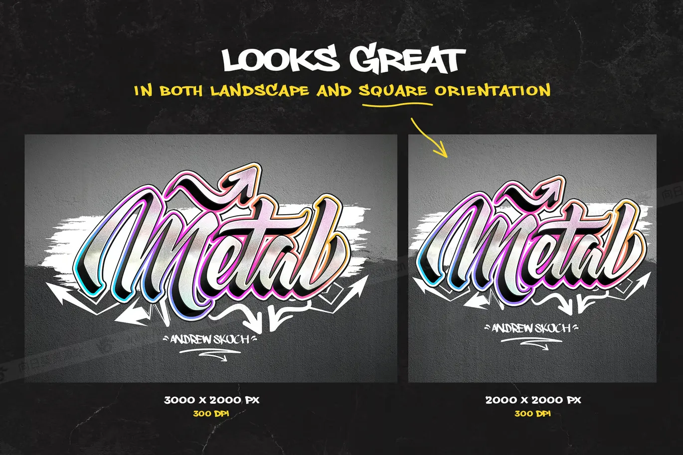 涂鸦文字效果为您的项目提供街头艺术!主要特点是您可以将涂鸦文本更改为您自己的文本。适用于任何字体 – 装饰字体或常规字体。即使使用简单的粗体字体也很好看。