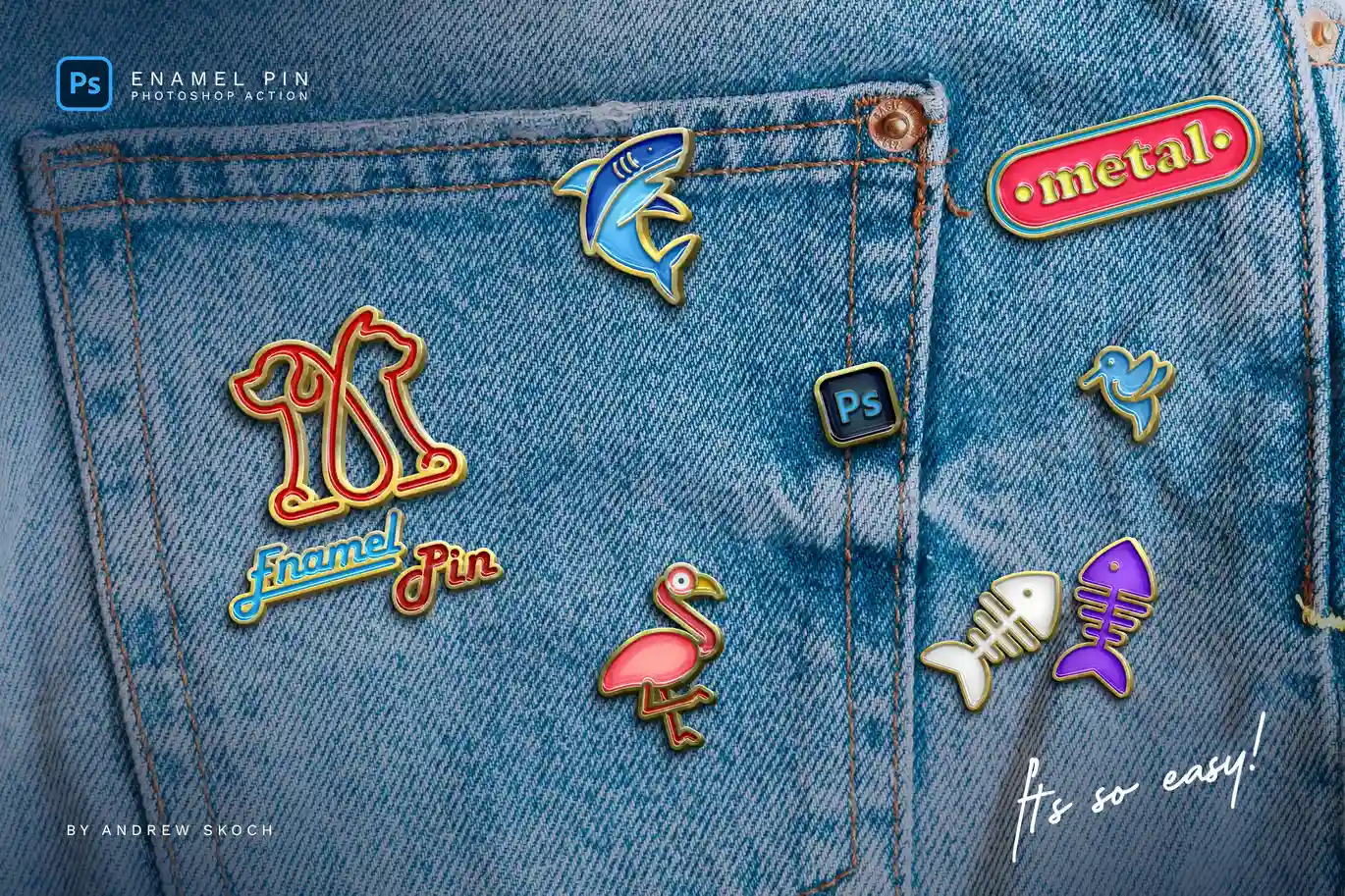 珐琅别针 Photoshop 动作高品质高级 Photoshop Action。用彩色珐琅制作闪亮的金属别针。既快速又简单! 您可以使用具有清晰边缘、矢量形状、图层组、文本或徽标的栅格图像。您可以在同一 PSD 文档中多次使用动作。您可以选择阴影和光线方向。您可以将任何语言用于 Photoshop 界面。 这是一个高质量且易于使用的附加组件,可节省您的时间。