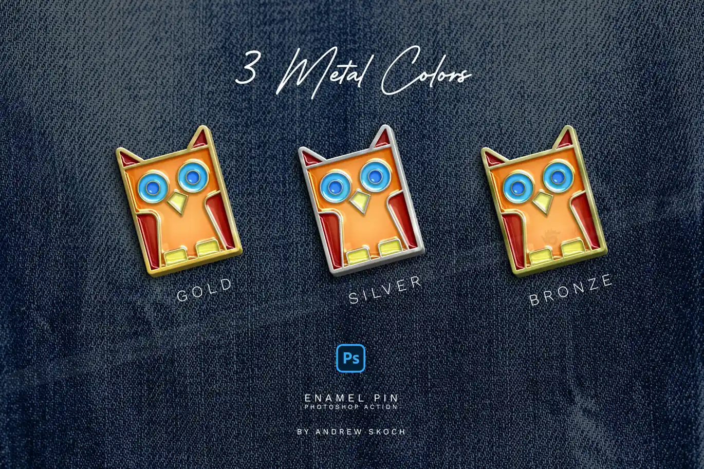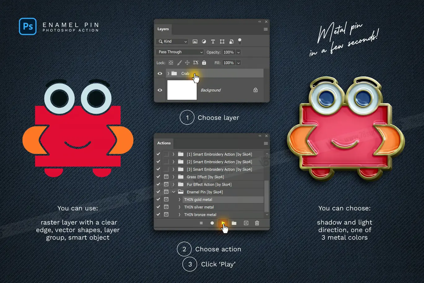 适用于任何颜色使用您的徽标、形状、纹理或栅格图层。您所有的颜色都将用于制作五颜六色的珐琅。金属线将自动生成。从您的文本、徽标、形状、智能对象、文件夹组、像素图层等中炫酷的金属图钉。