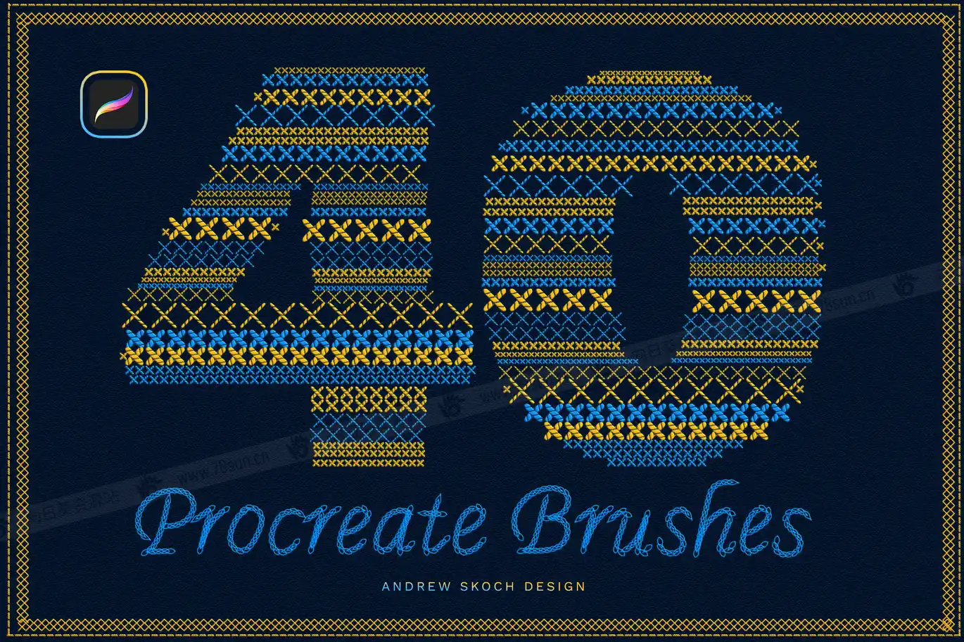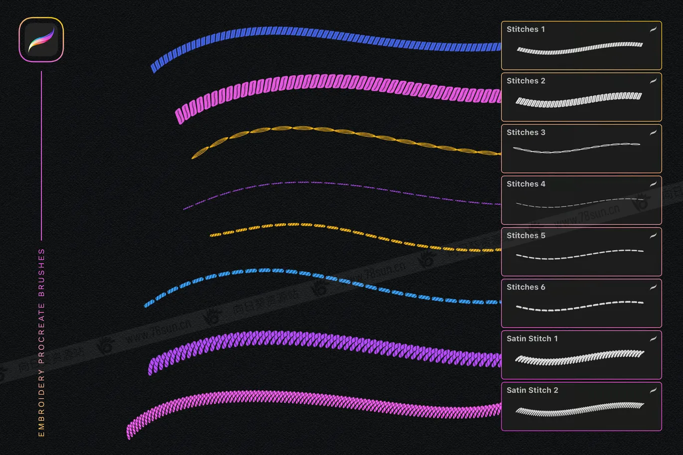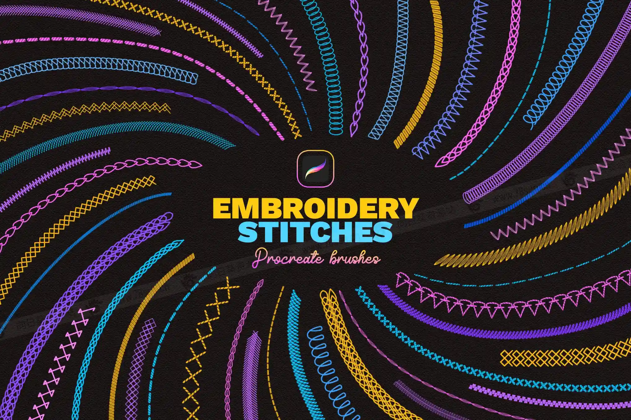 刺绣针迹 Procreate 画笔用于 iPad 绘图的逼真刺绣针迹。Procreate 的 40 种不同的画笔。非常适合绘制真实的装饰品、刺绣装饰品、刺绣补丁等。