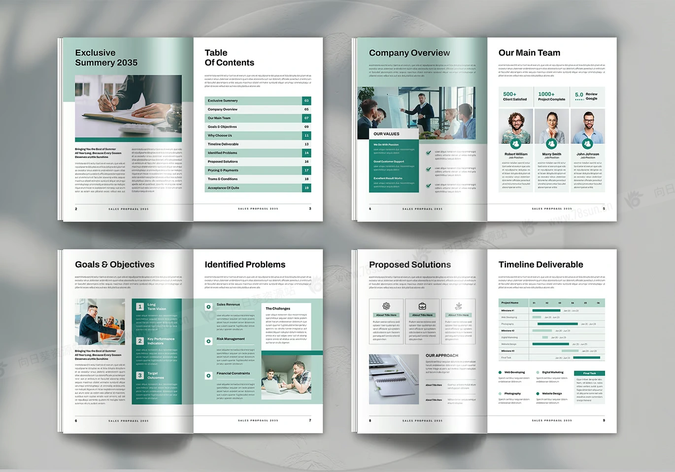 销售提案模板 / 干净且富有创意的销售提案模板。这种布局适合任何项目目的,非常易于使用和定制。很容易自定义它并用您自己的颜色替换徽标和品牌颜色,(它有 A4 和美国信纸两种尺寸可供选择)专注于简单干净的线条和强大的网格。凭借优雅的风格和丰富的调色板,它是摄影师、博主、影响者、企业家、小型或大型企业等的完美选择。