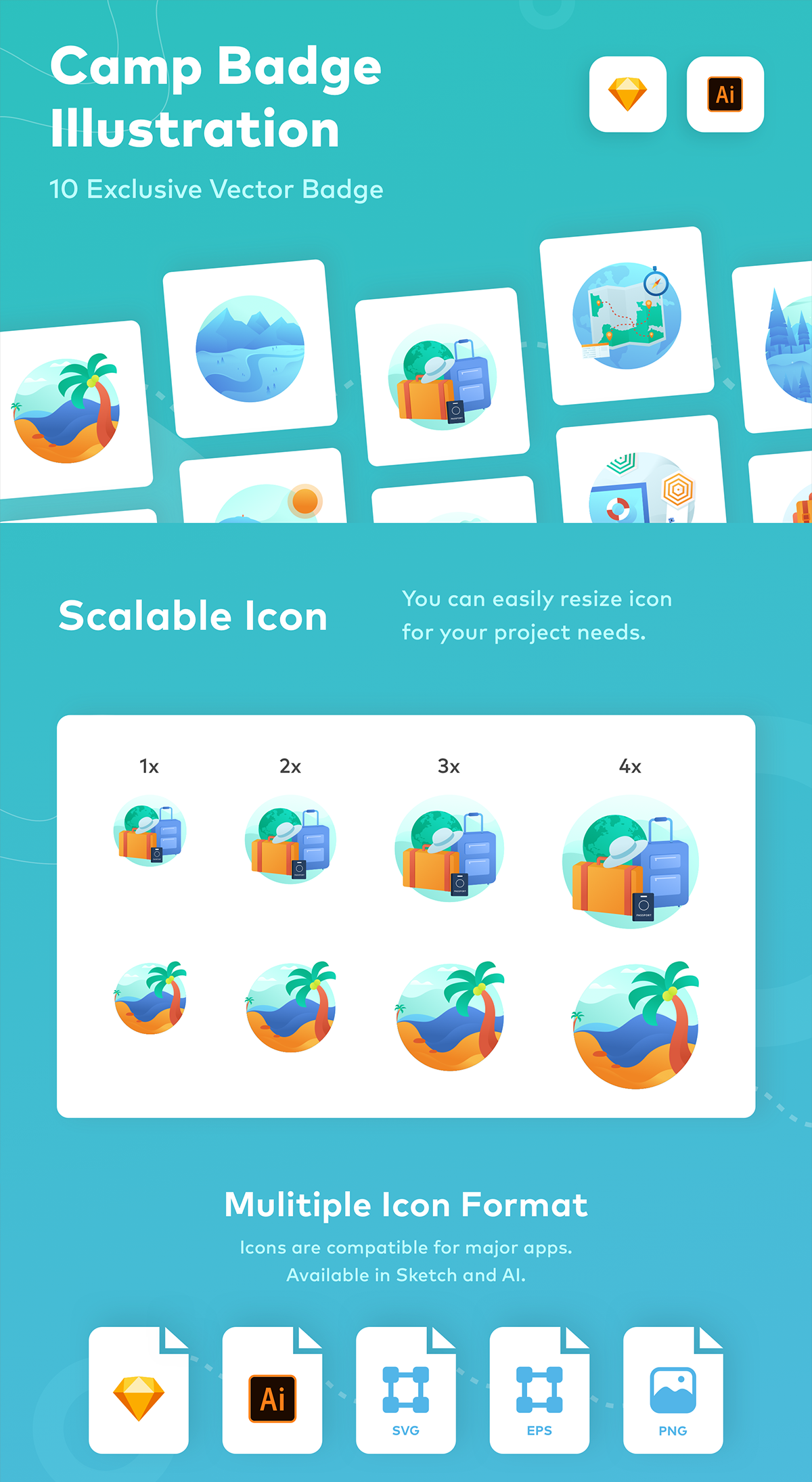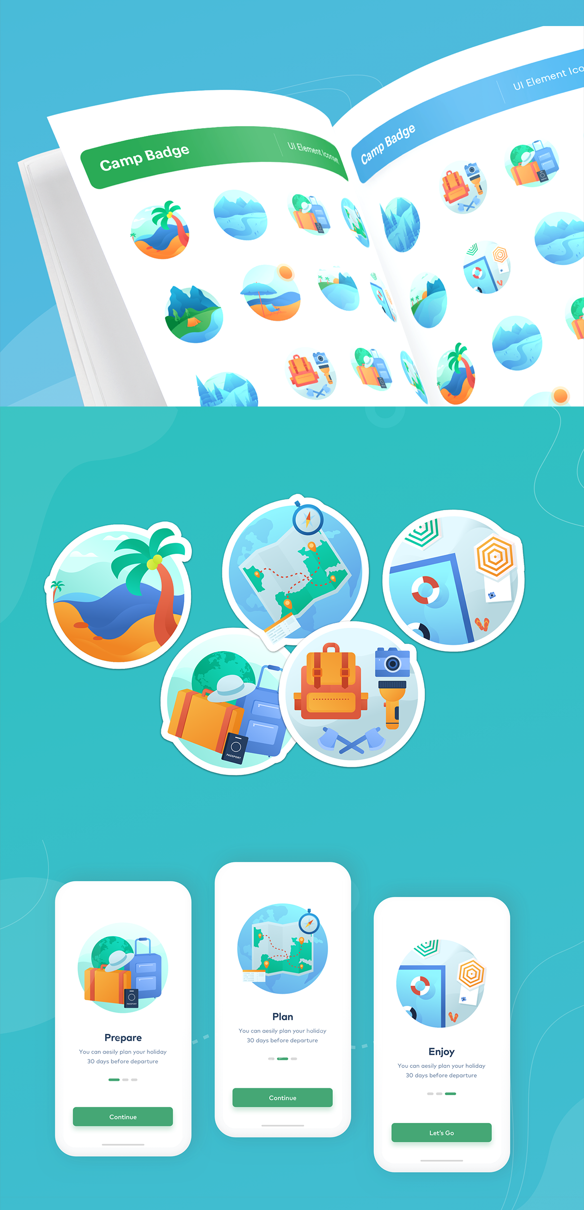沙滩旅行雪景app引导页徽章场景插画sketch ai矢量图形素材