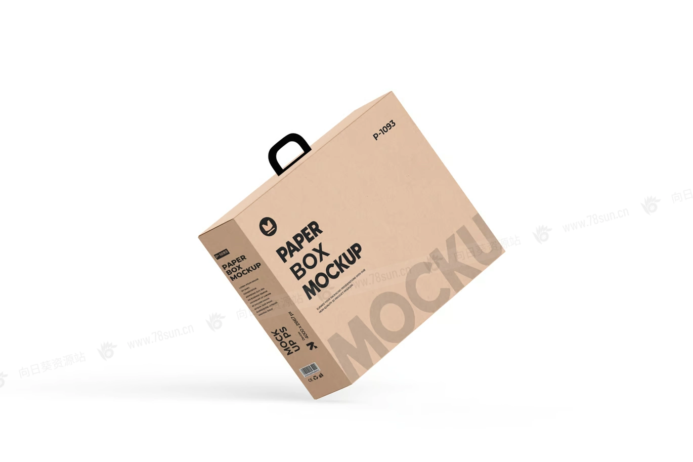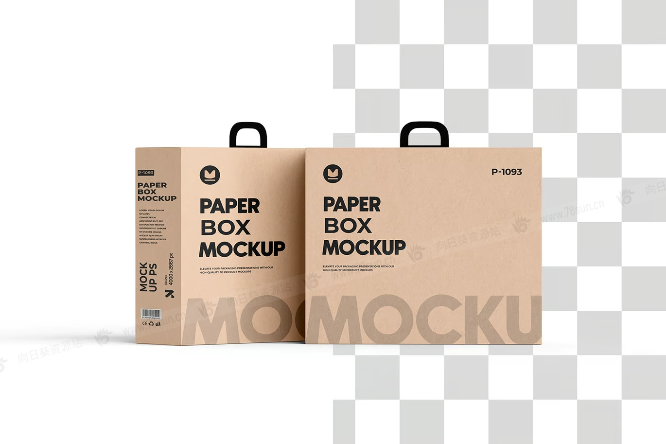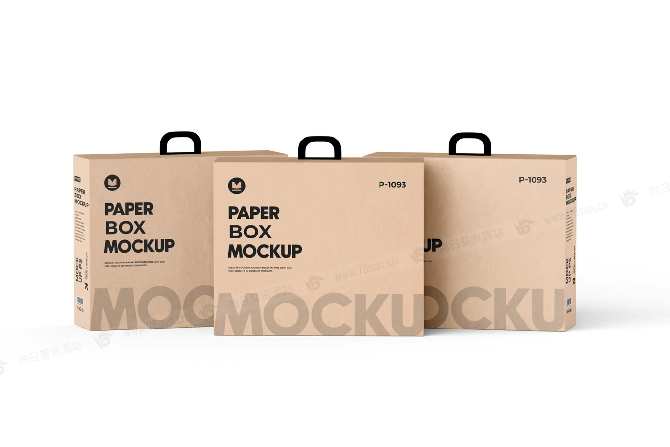 带手柄牛皮纸盒VI效果图展示智能贴图psd设计样机。包括牛皮纸包装、带把手的礼品盒、瓦楞纸板箱和 3D 盒子模板。