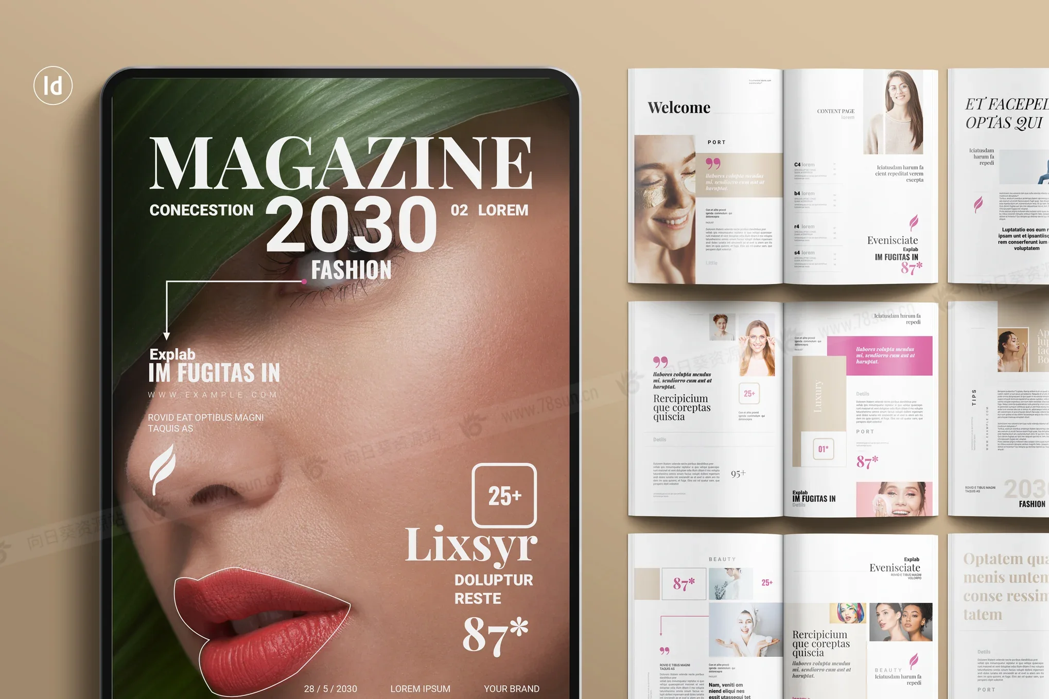 时尚护肤化妆品小册子杂志宣传册画册indd设计模板,添加您的徽标和图像并编辑您的品牌颜色和排版,