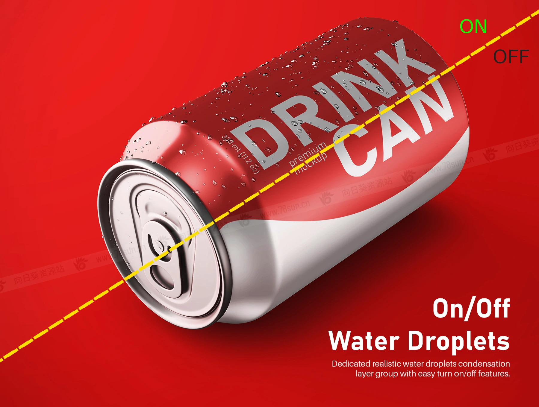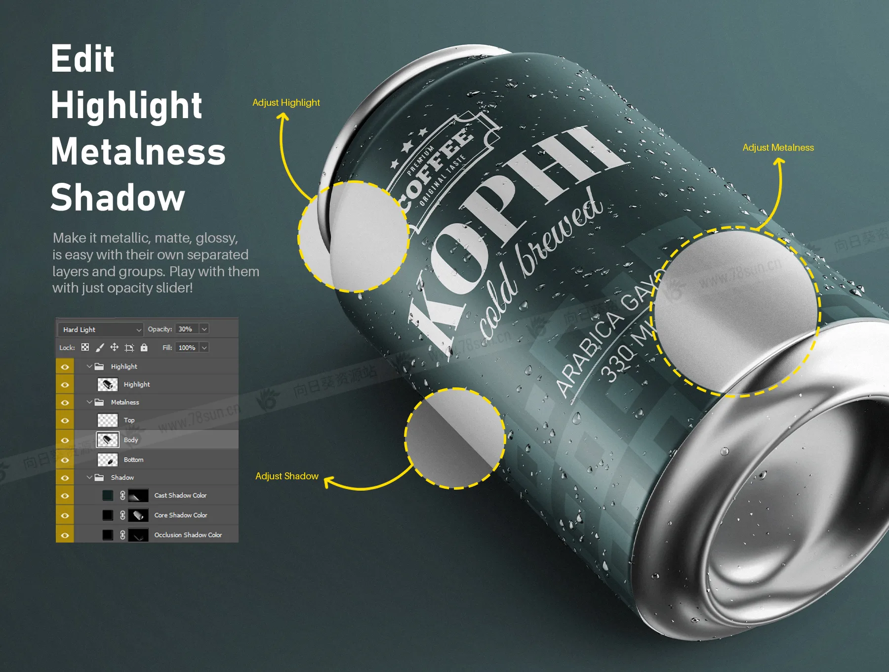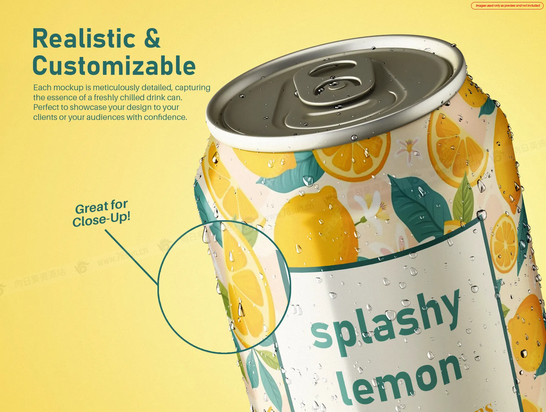 这个模型集易于使用、用途广泛且可定制。只需通过智能对象图层拖放您的设计即可。需要更改金属颜色?只需双击颜色框并选择您的颜色框。产品可以是咖啡、可乐、苏打水、能量饮料等,你可能想用亮或暗、流行或柔和的方式展示你的设计,用这个psd模型套装轻松创建它们。