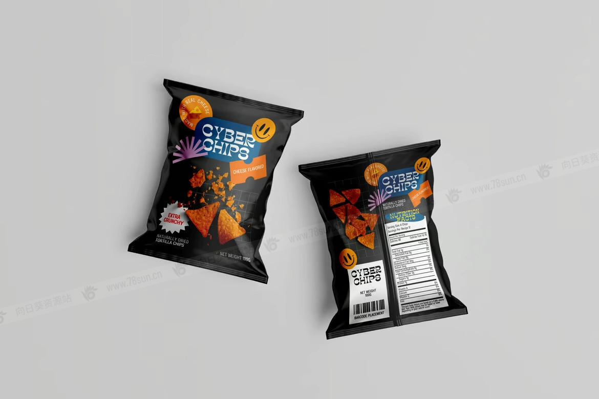 零食薯片膨化食品包装袋品牌VI效果图展示智能贴图psd设计样机。在高分辨率、专业的模型中轻松展示您的徽标、包装设计、品牌等。