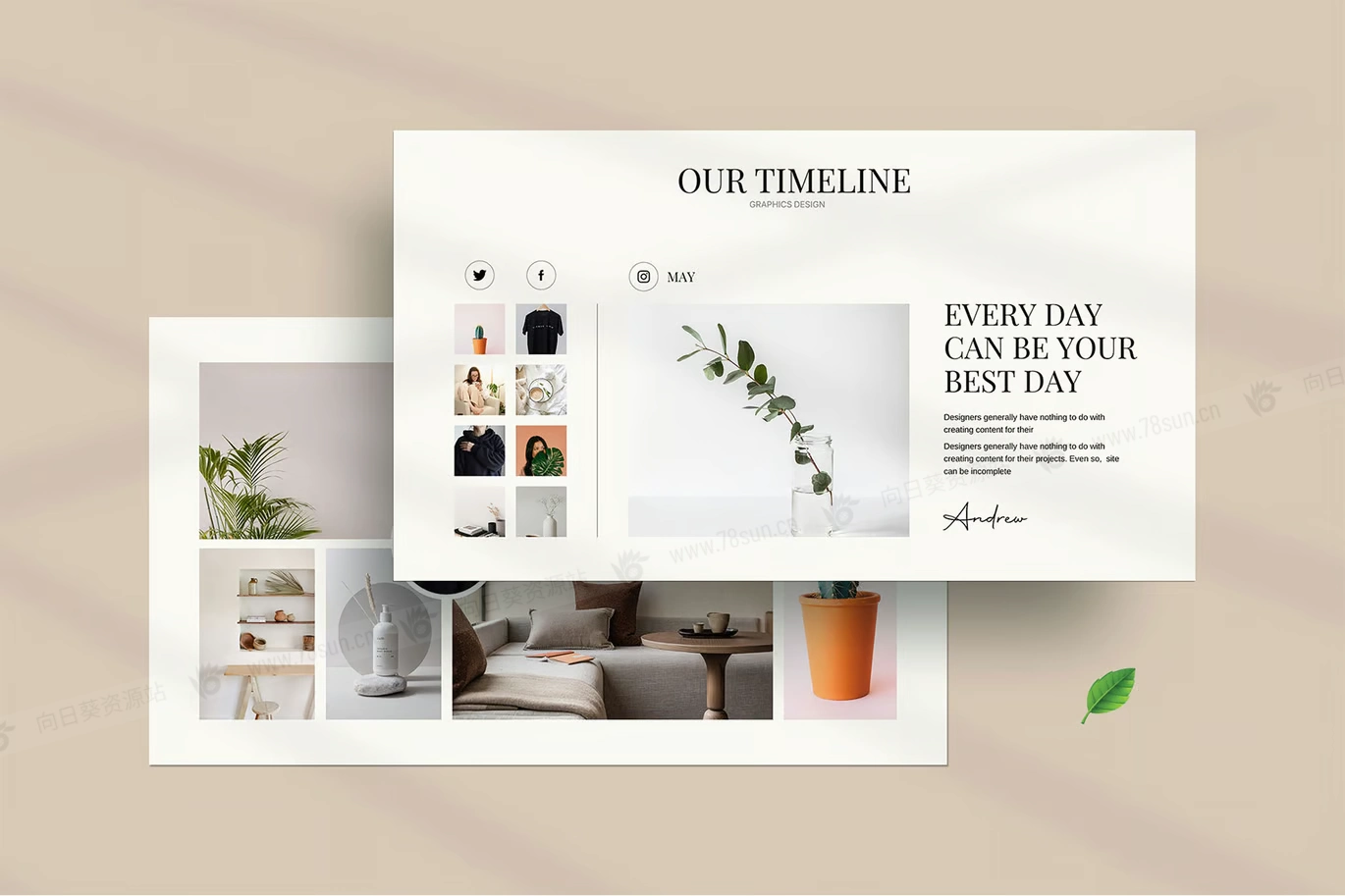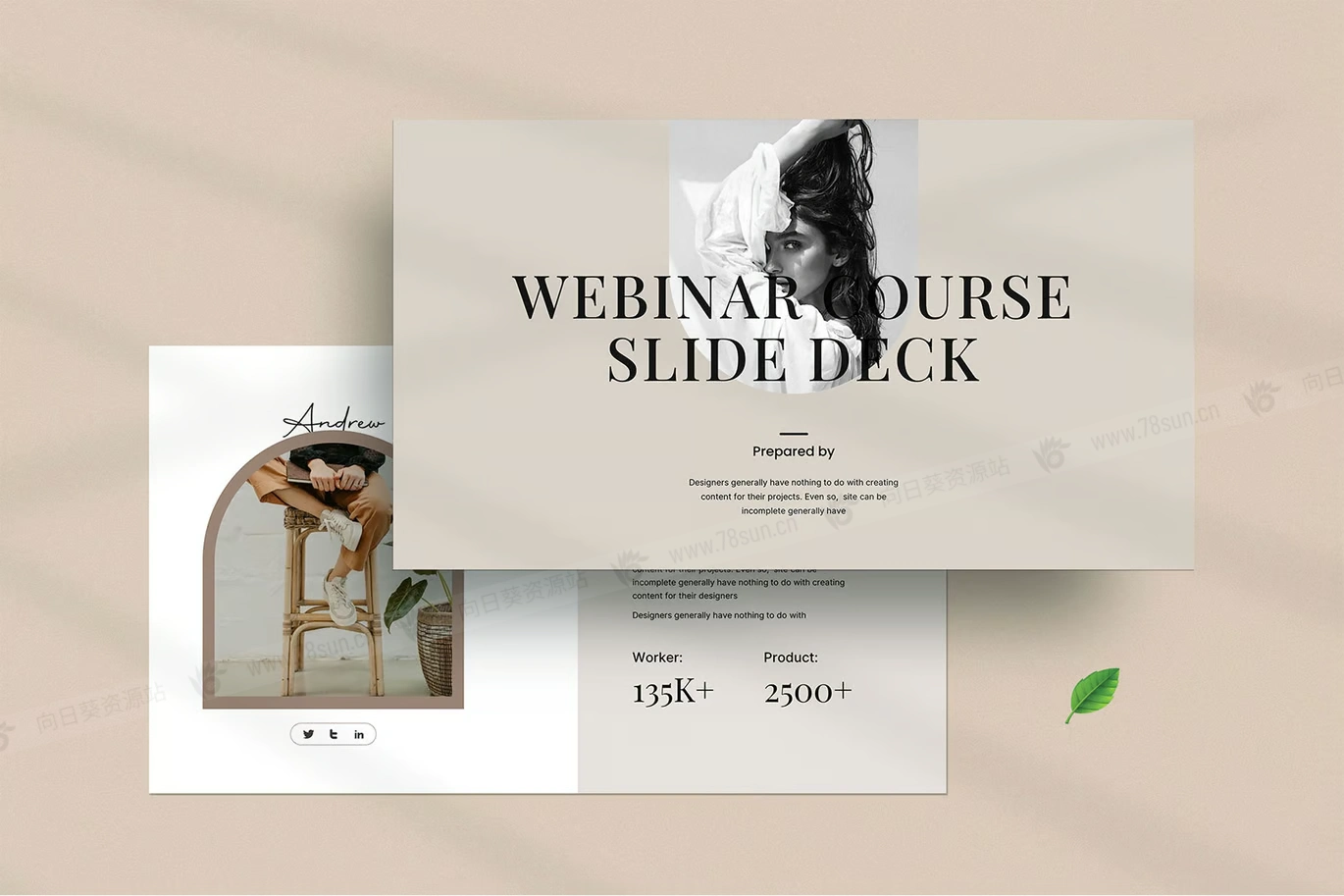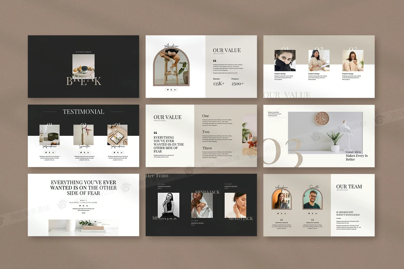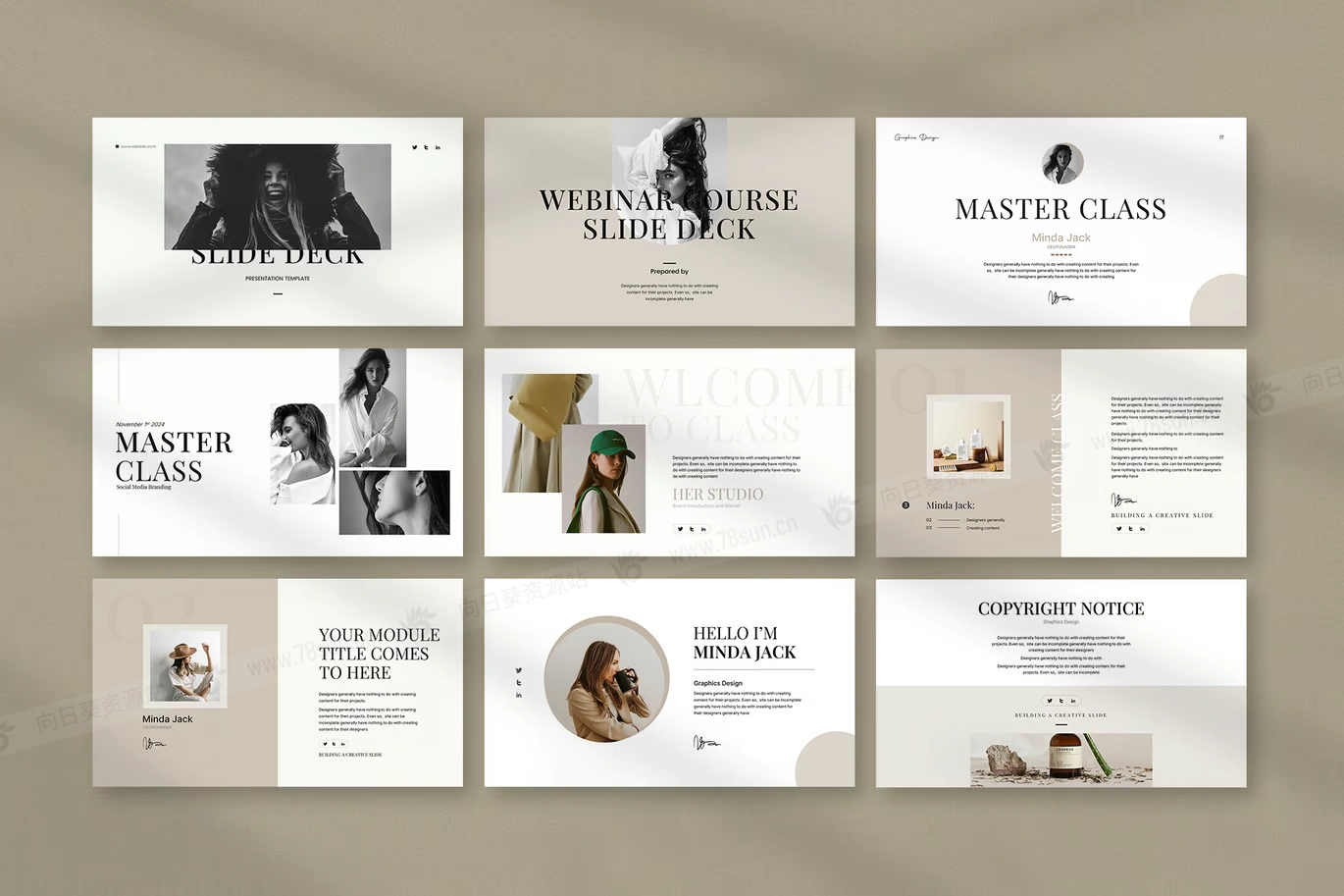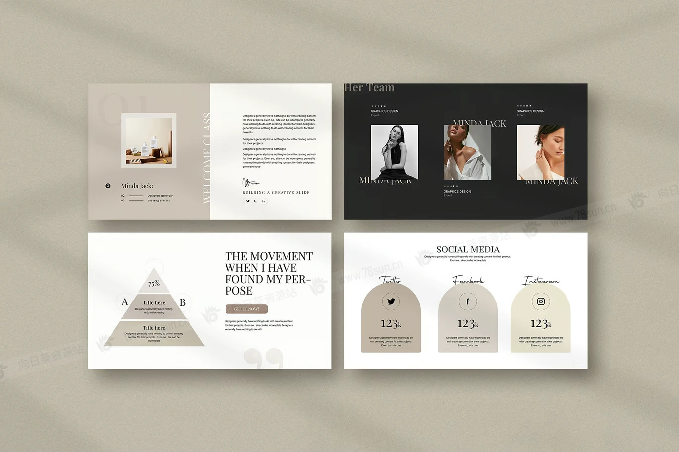 时尚品牌推广指南演示PowerPoint幻灯片模板。可定制,非常适合教练、在线教学、大师班辅导、各种网络研讨会、电子课程和电子考试。单页或多页可供混合和匹配。只需拖放您需要的图像,更改颜色,自定义模型。