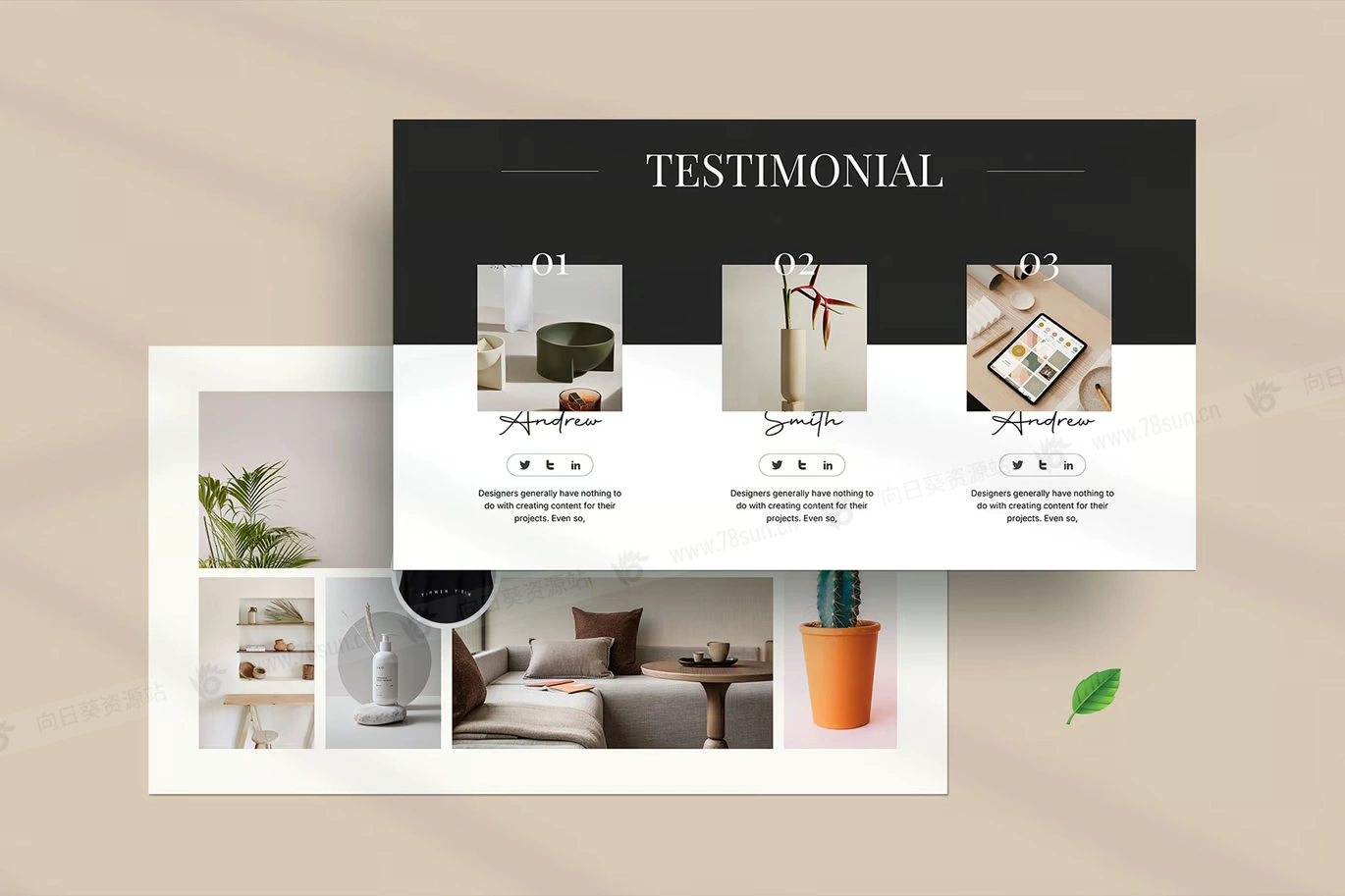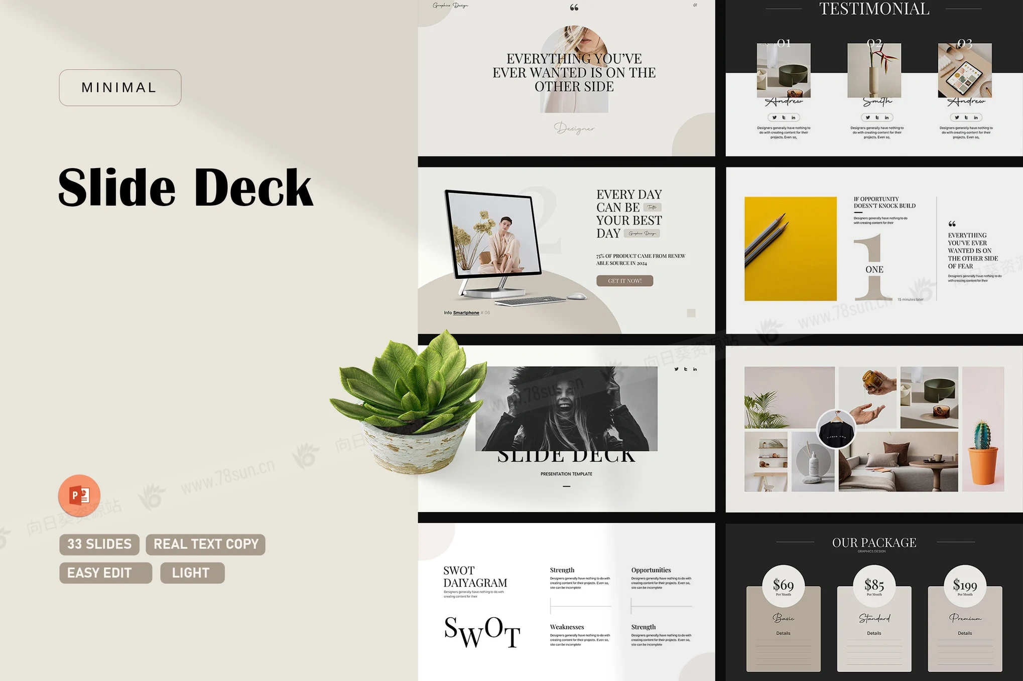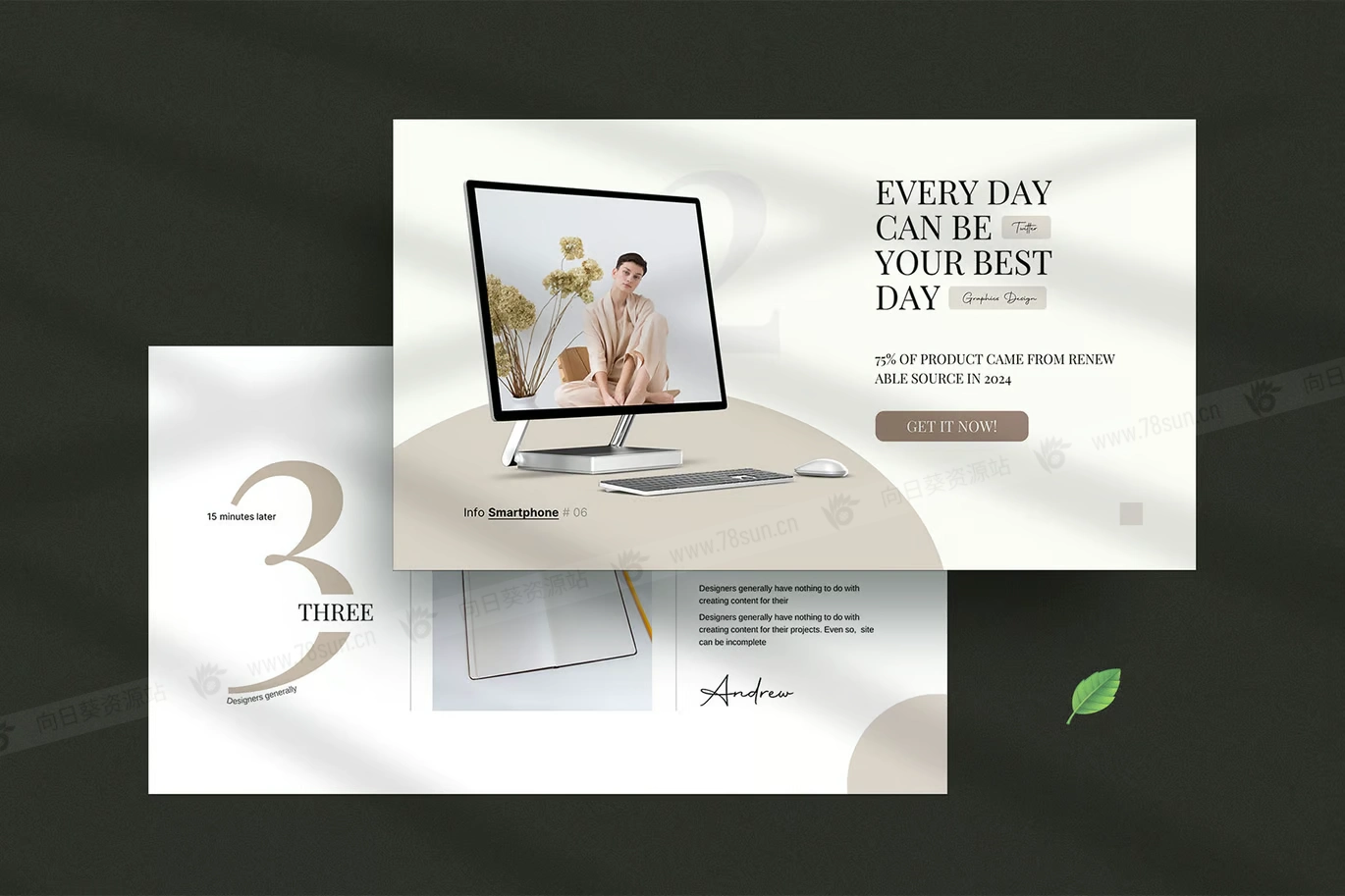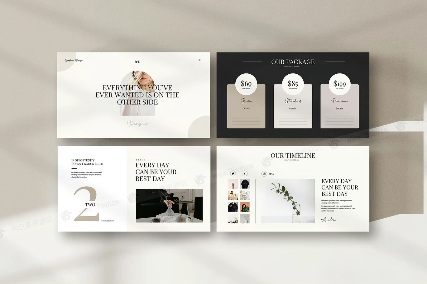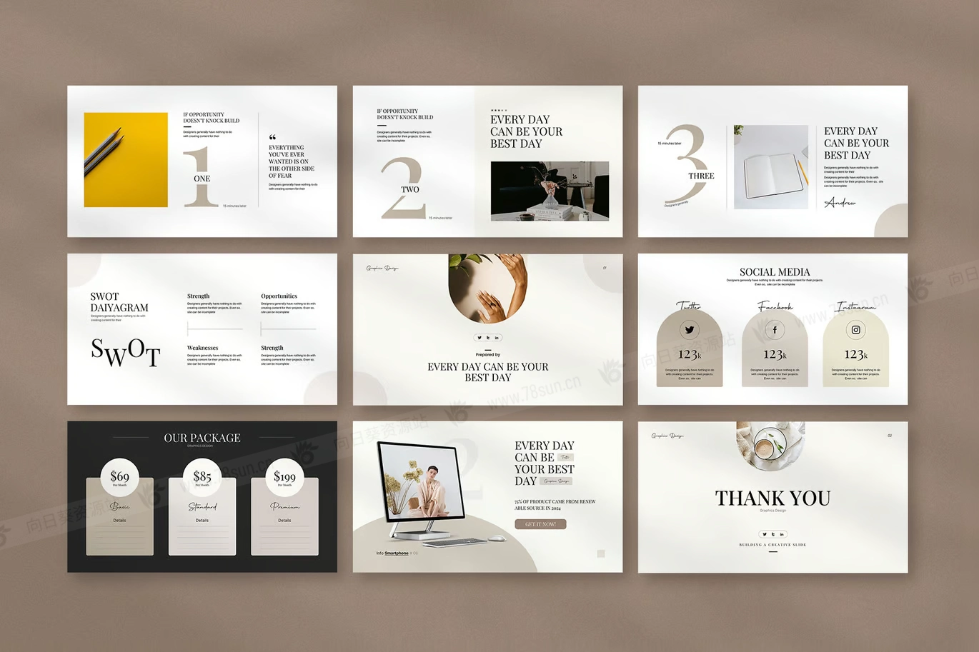 时尚品牌推广指南演示PowerPoint幻灯片模板。可定制,非常适合教练、在线教学、大师班辅导、各种网络研讨会、电子课程和电子考试。单页或多页可供混合和匹配。只需拖放您需要的图像,更改颜色,自定义模型。