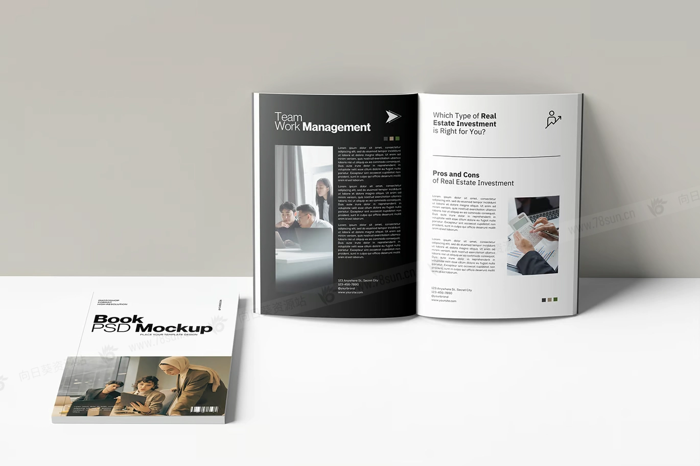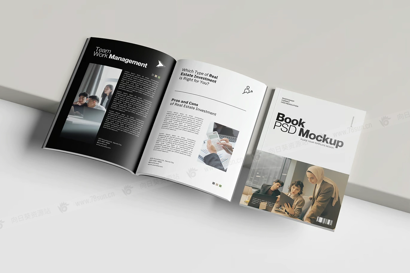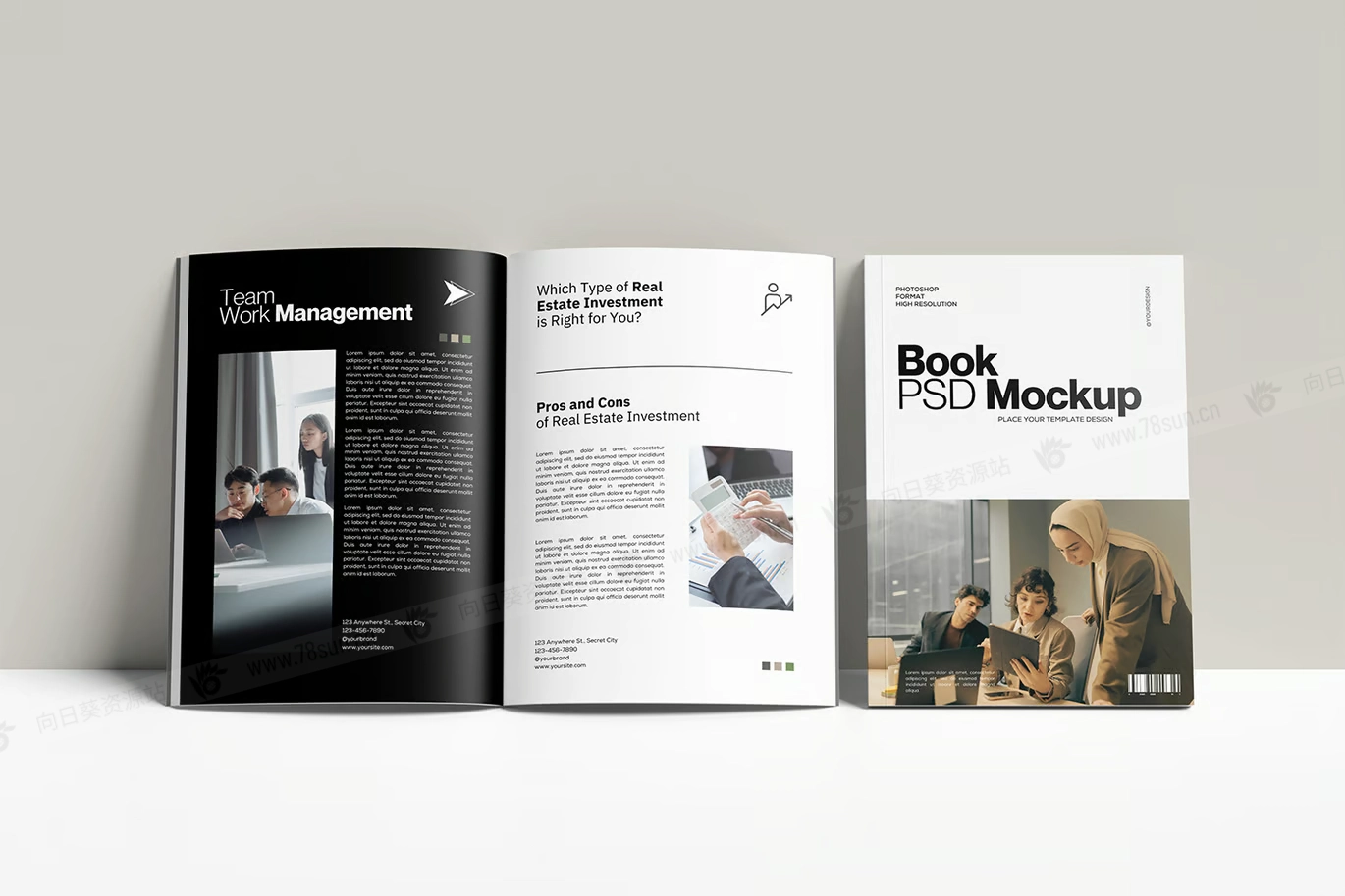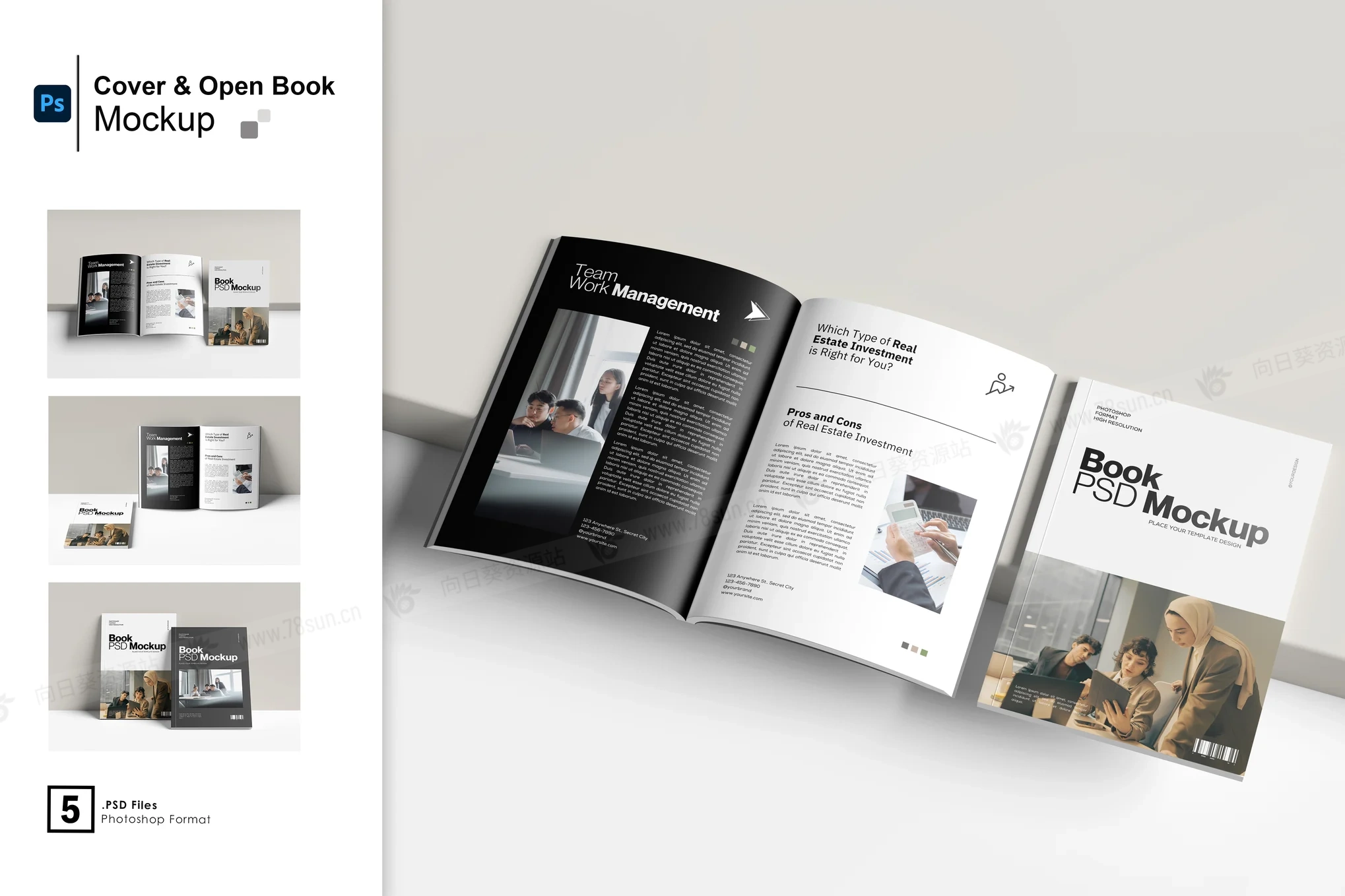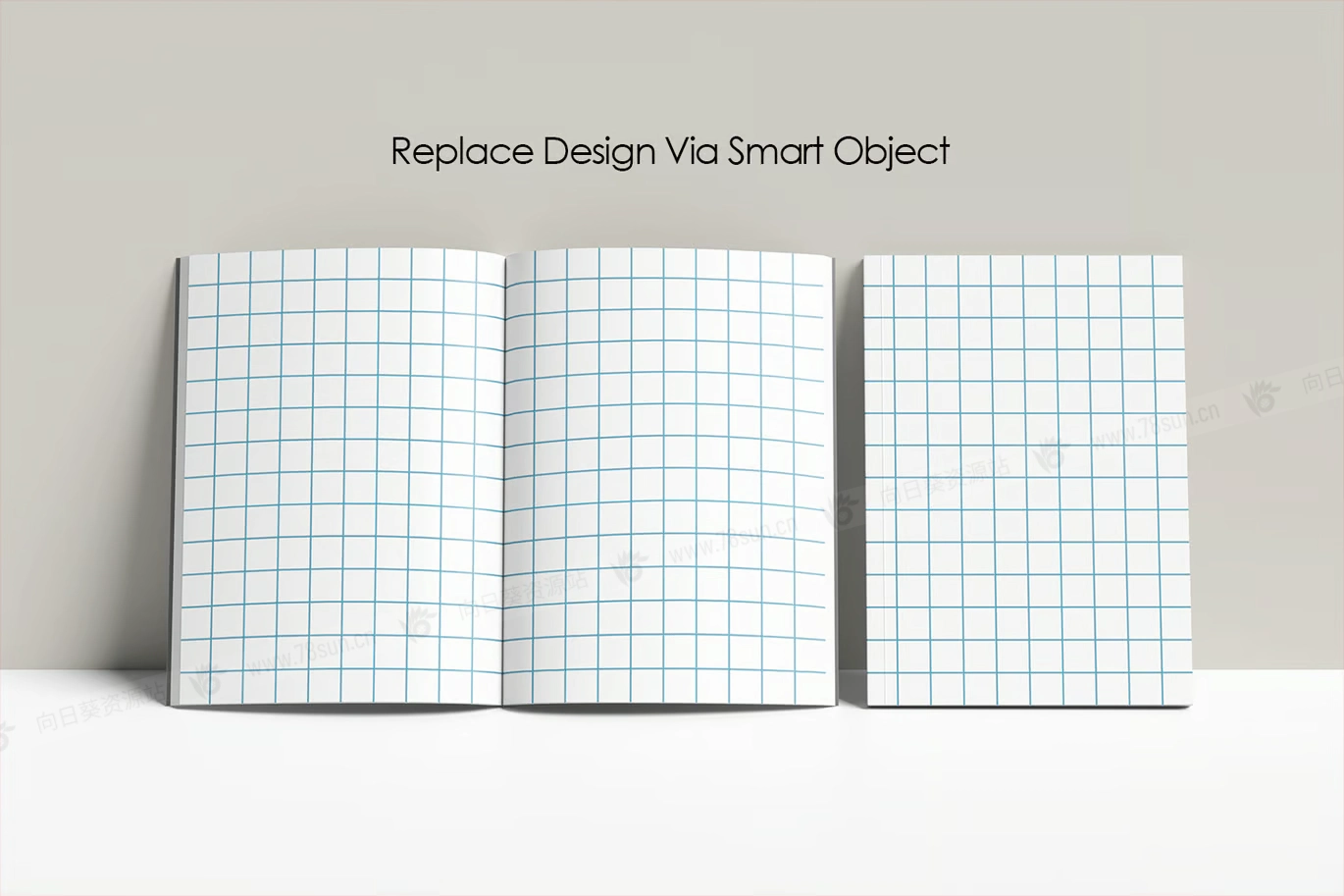 书籍杂志封面内页VI效果图展示智能贴图psd设计样机。此模型包括 5 个具有分层 PSD 文件,并且此模型还使用智能对象功能,这意味着您可以在几秒钟内轻松快速地使用自己的设计更改当前设计。