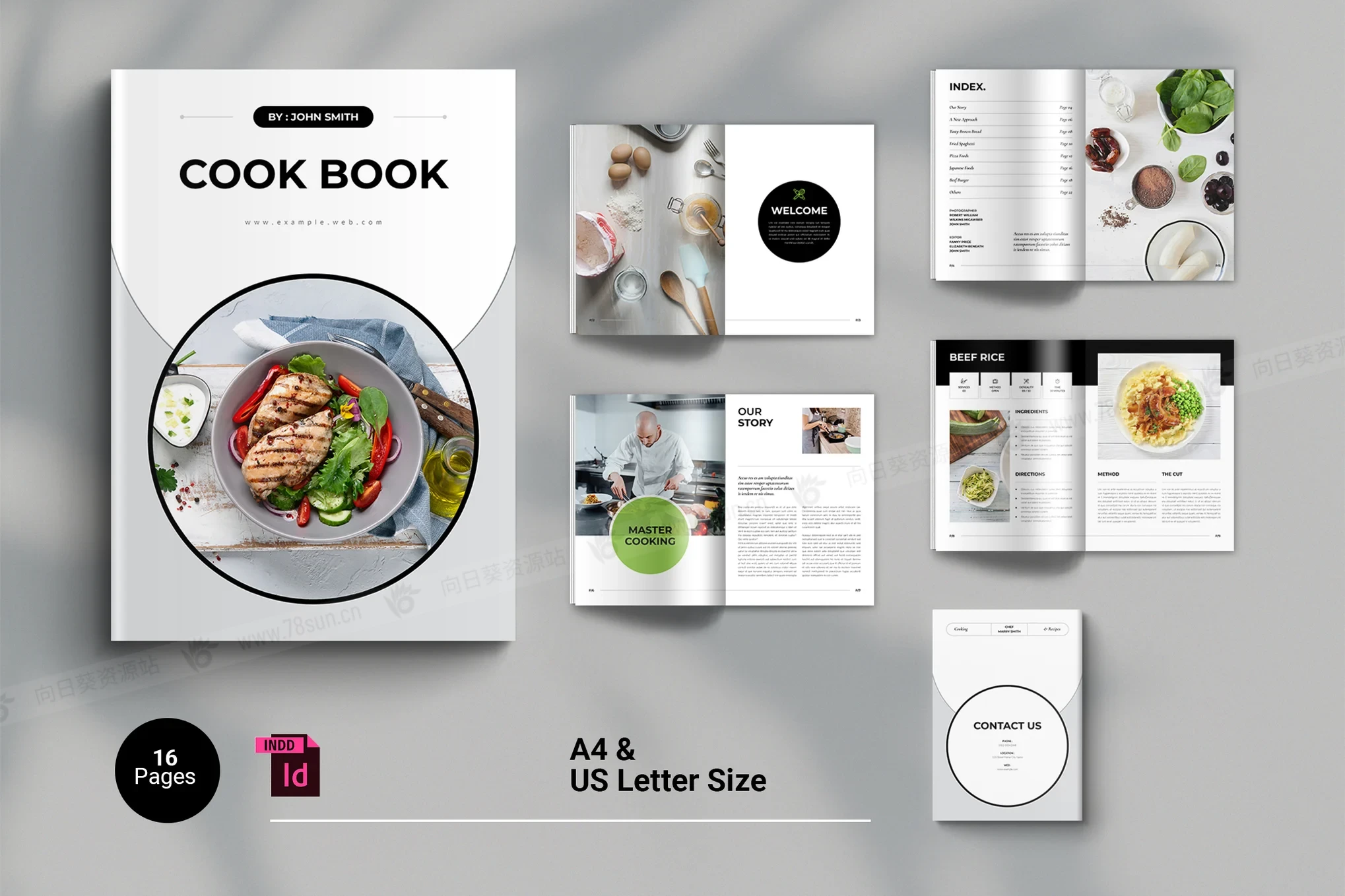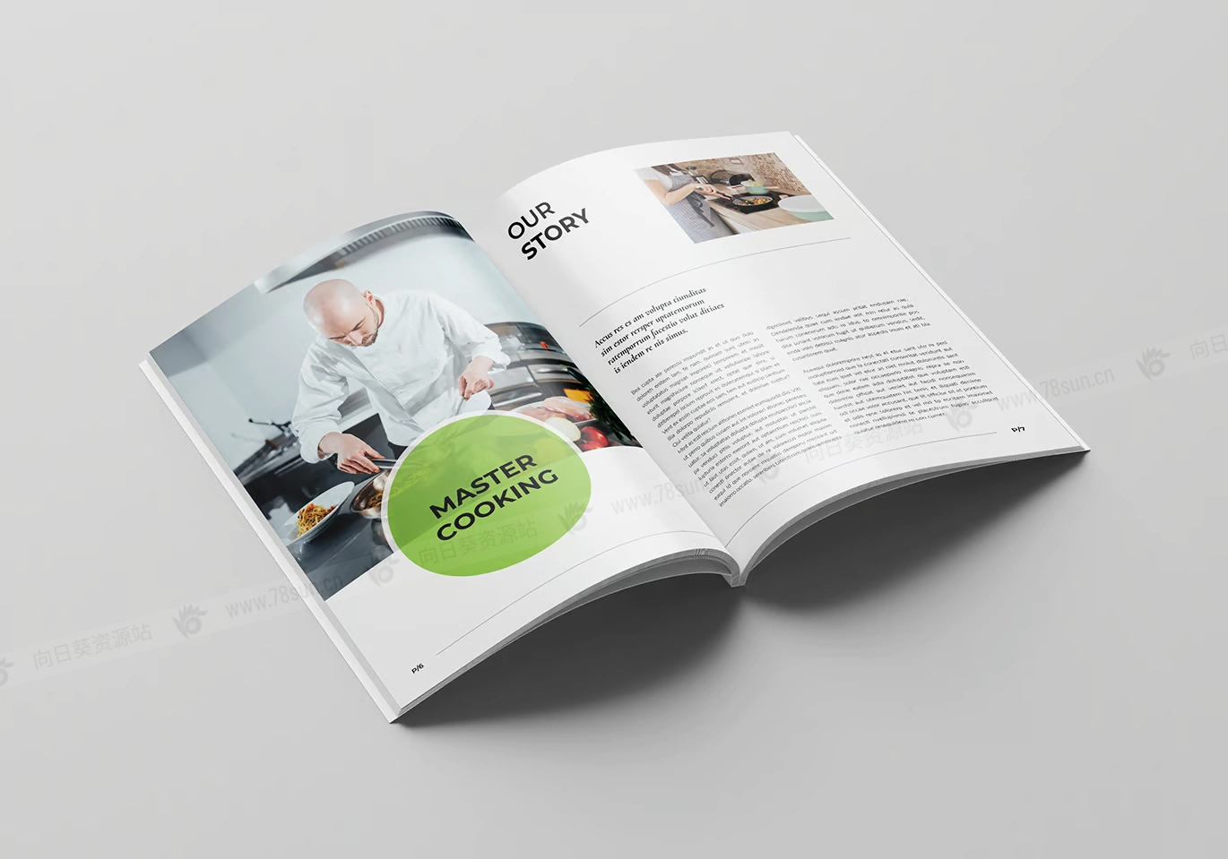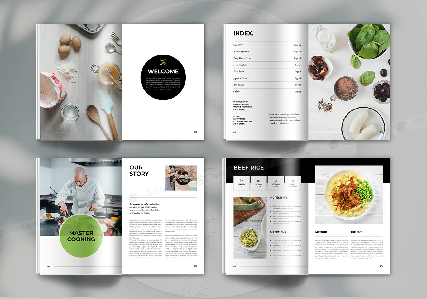 美食餐厅烹饪指南食谱小册子杂志宣传册画册indd设计模板。这种布局适用于任何项目目的,非常易于使用和定制。定制它并用您自己的颜色替换徽标和品牌颜色很容易,(它有 A4 和美国信纸两种尺寸)